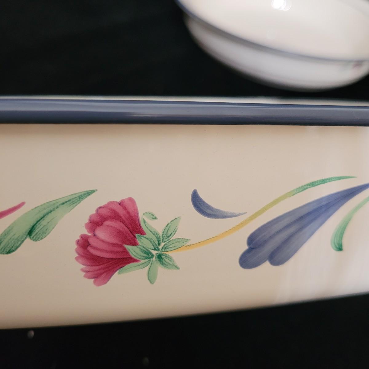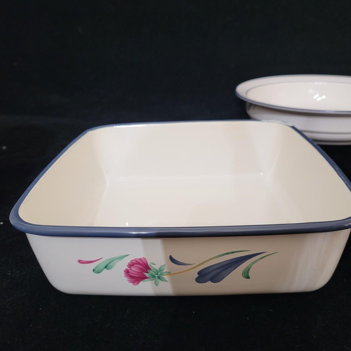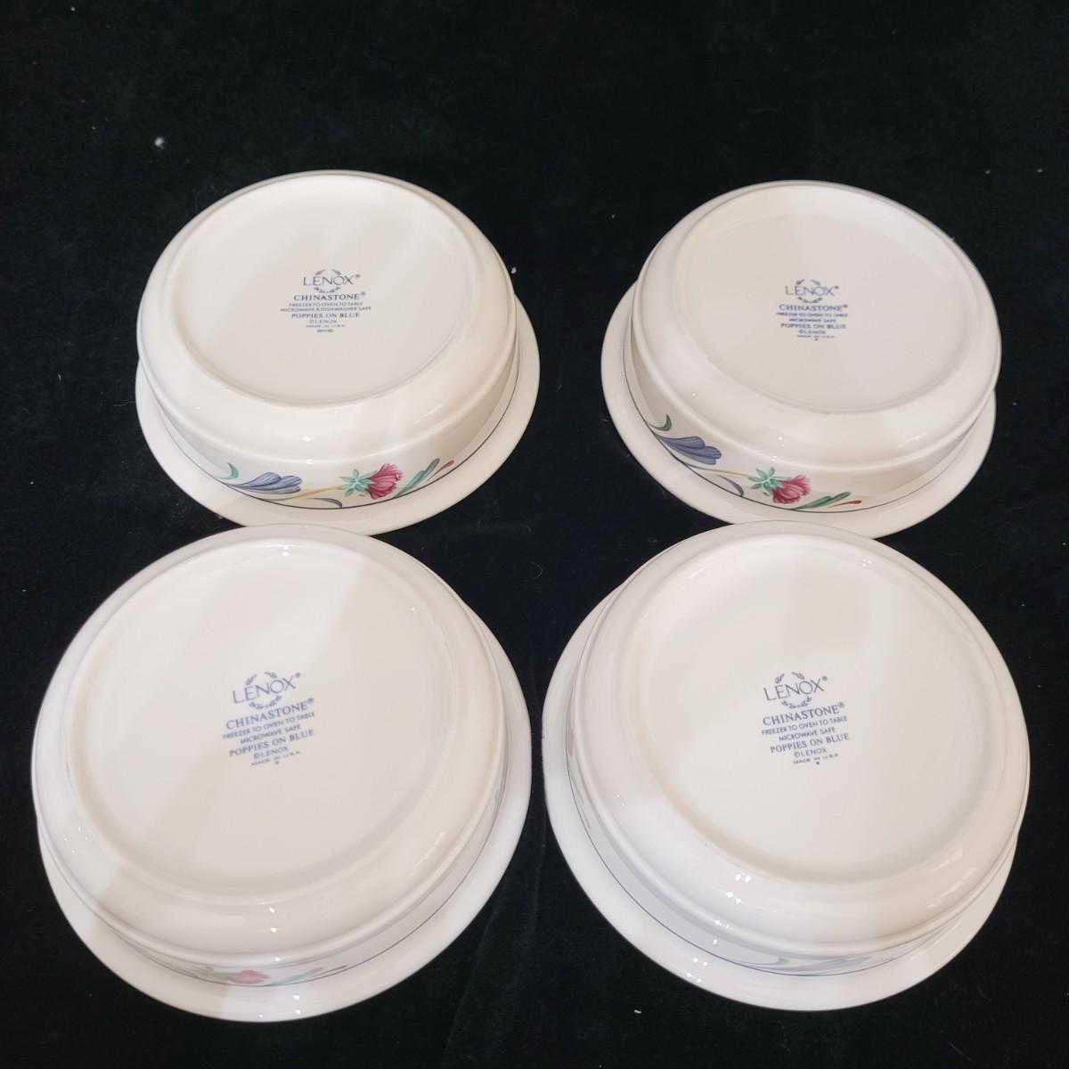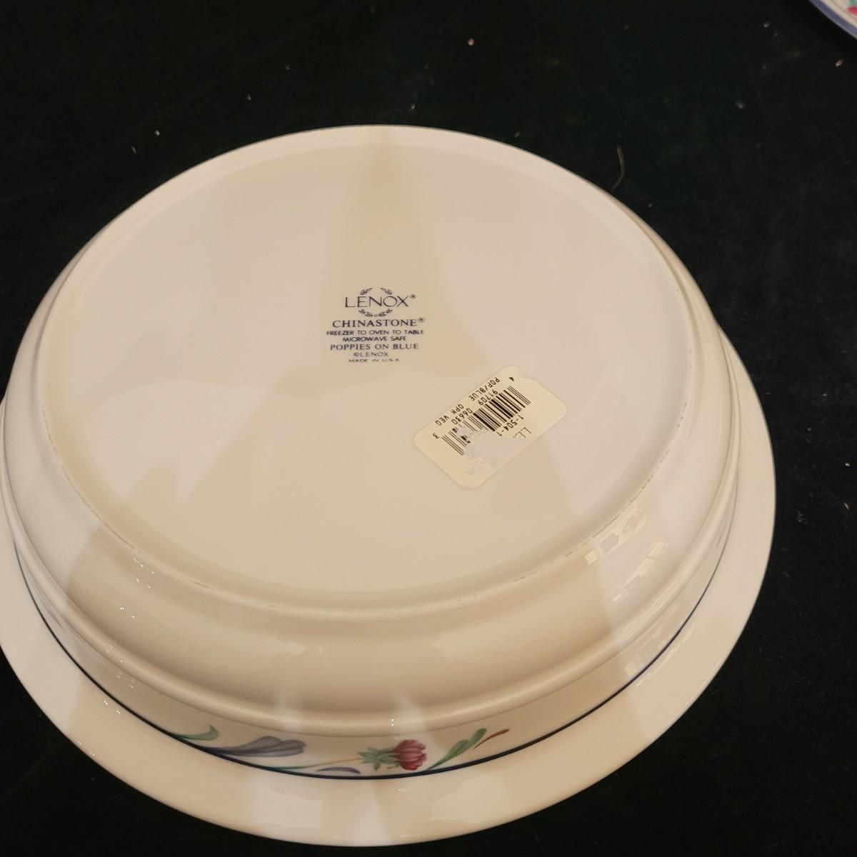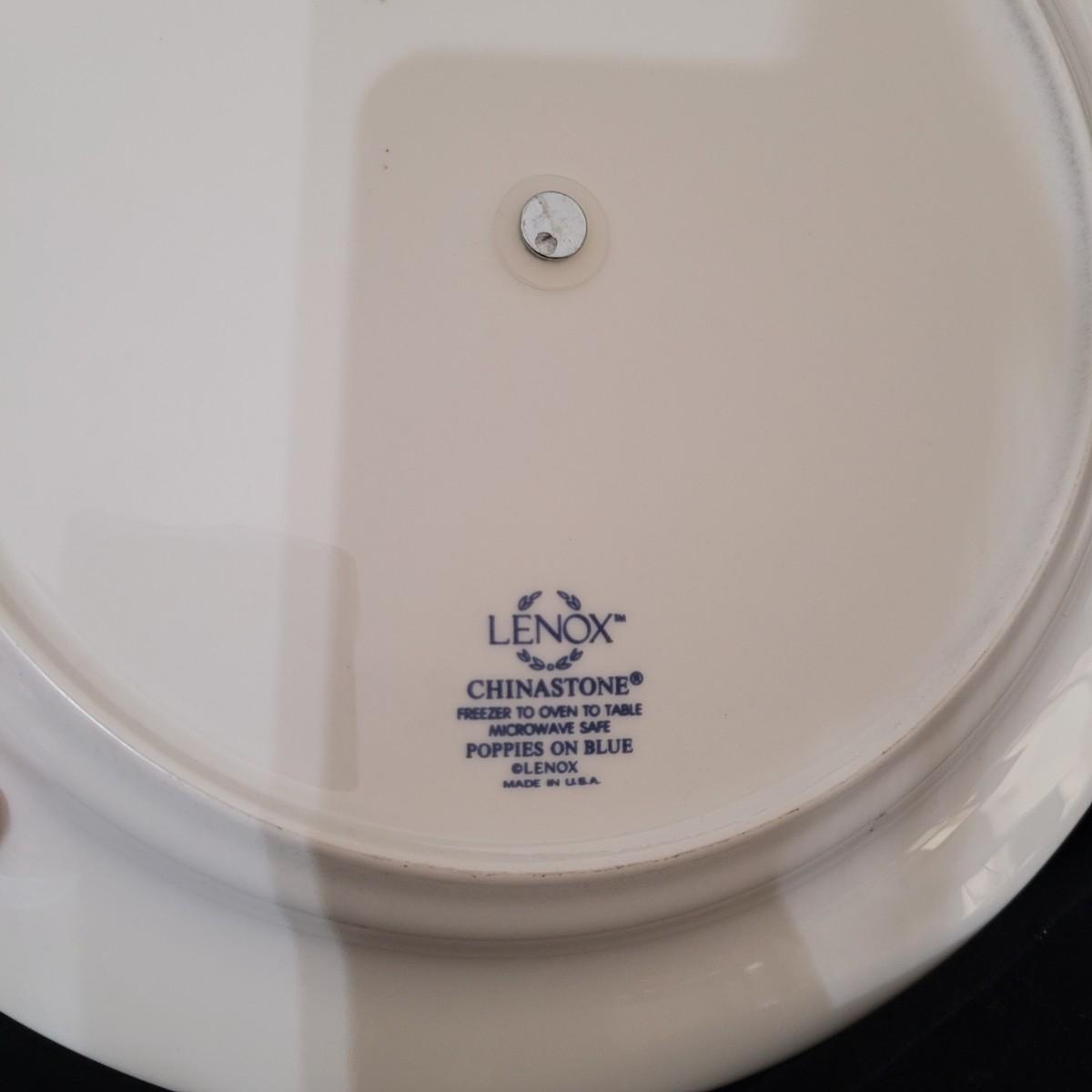 Lenox Chinastone "Poppies on Blue" serving set includes four shallow bowls, one large serving bowl, an enamel coated metal square casserole dish and a single tier serving tray. Metal handle has some scratching and square dish has chipping at corner (see photos). Items are otherwise in good condition. Large bowl measures approximately 10"DIA. Shipping available.