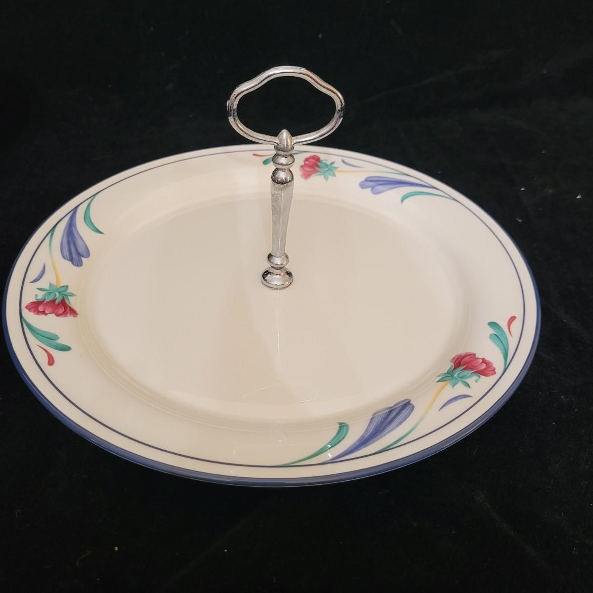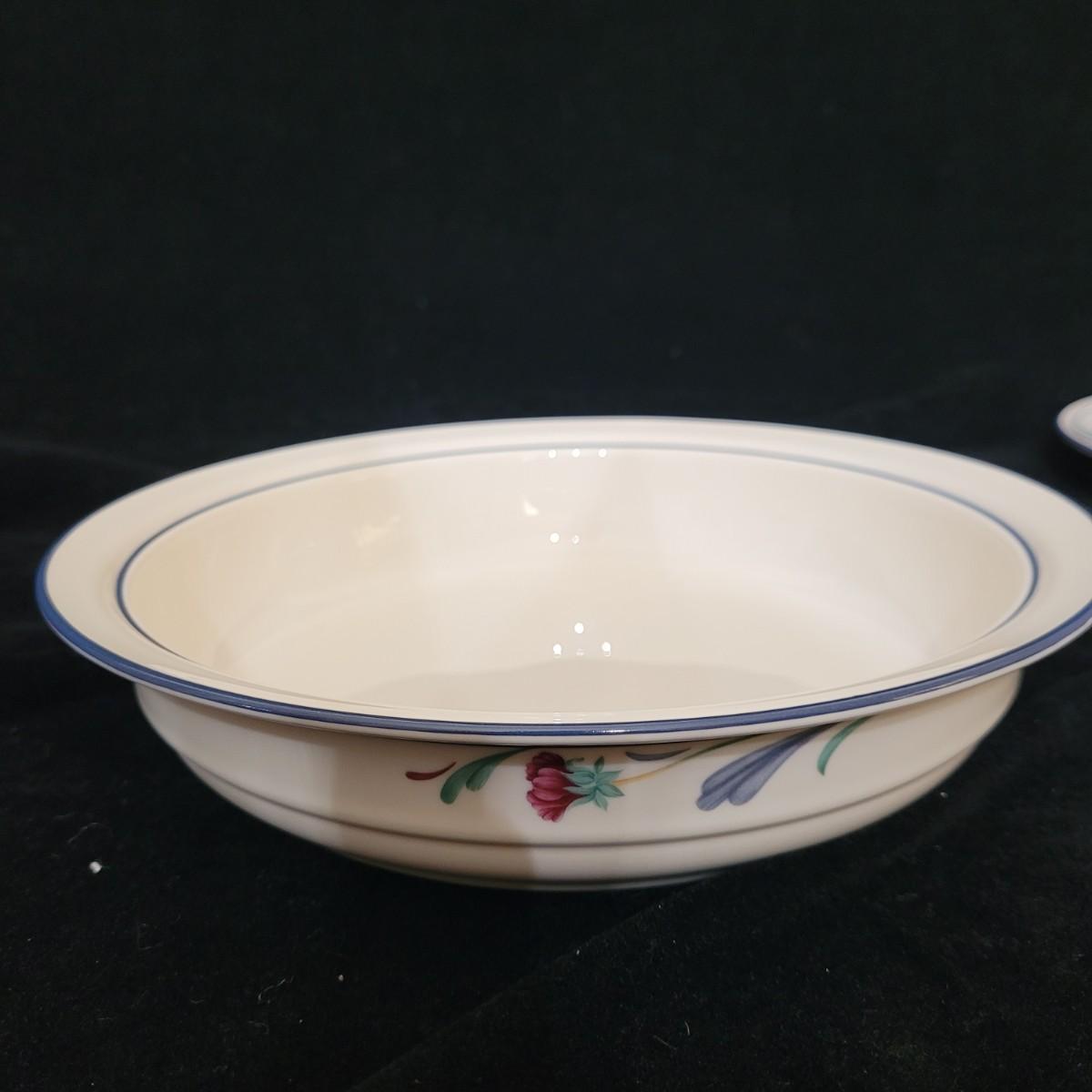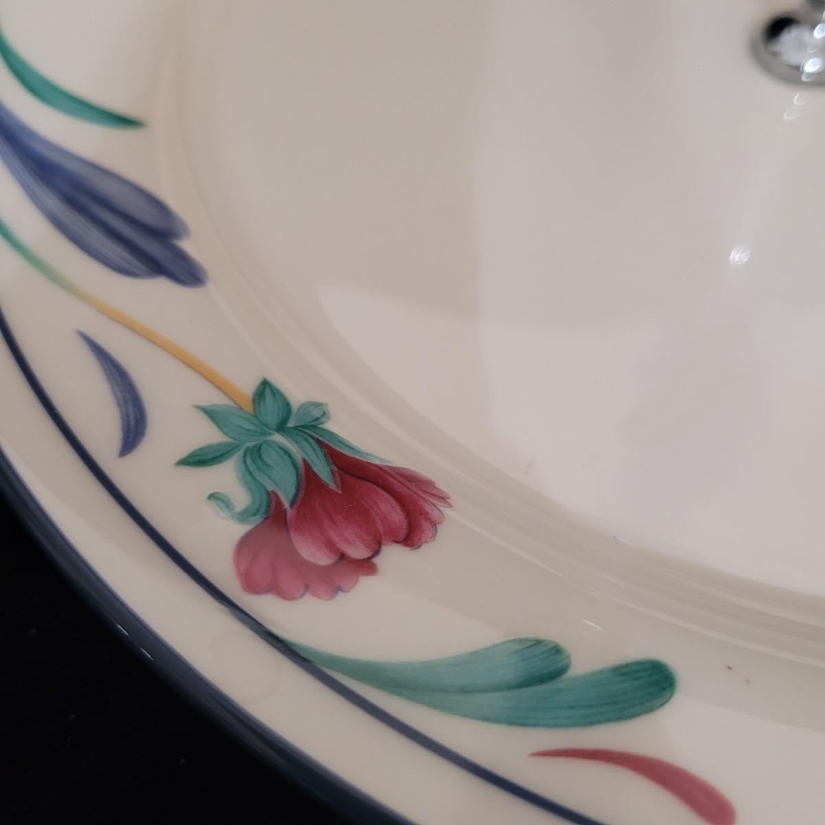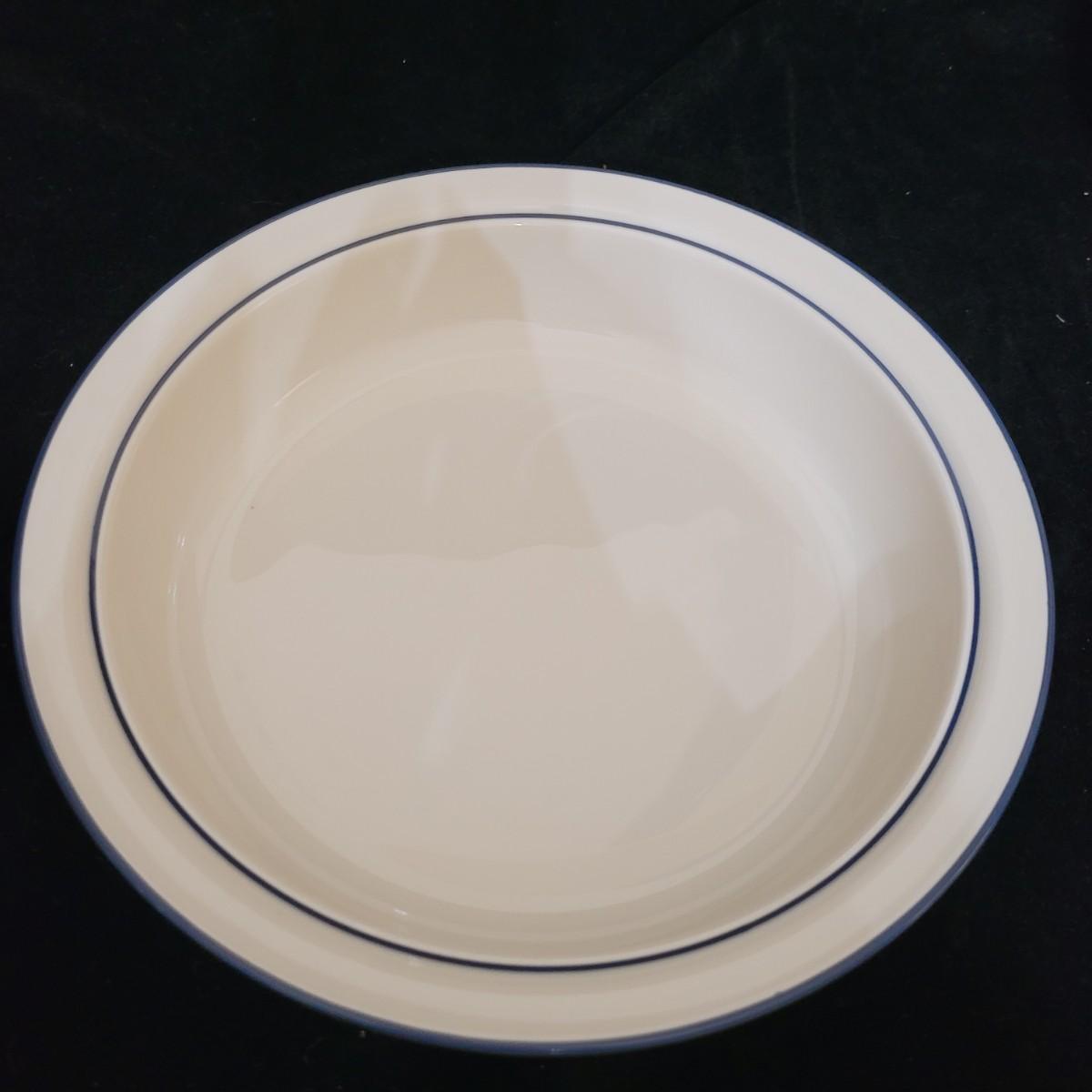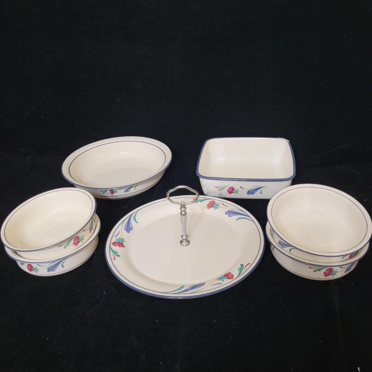 Lenox Chinastone "Poppies on Blue" serving set includes four shallow bowls, one large serving bowl, an enamel coated metal square casserole dish and a single tier serving tray. Metal handle has some scratching and square dish has chipping at corner (see photos). Items are otherwise in good condition. Large bowl measures approximately 10"DIA. Shipping available.