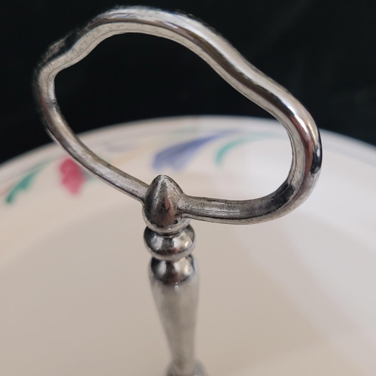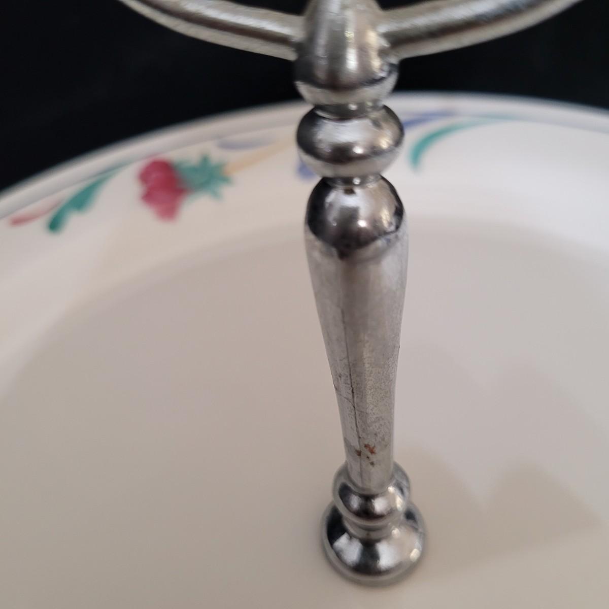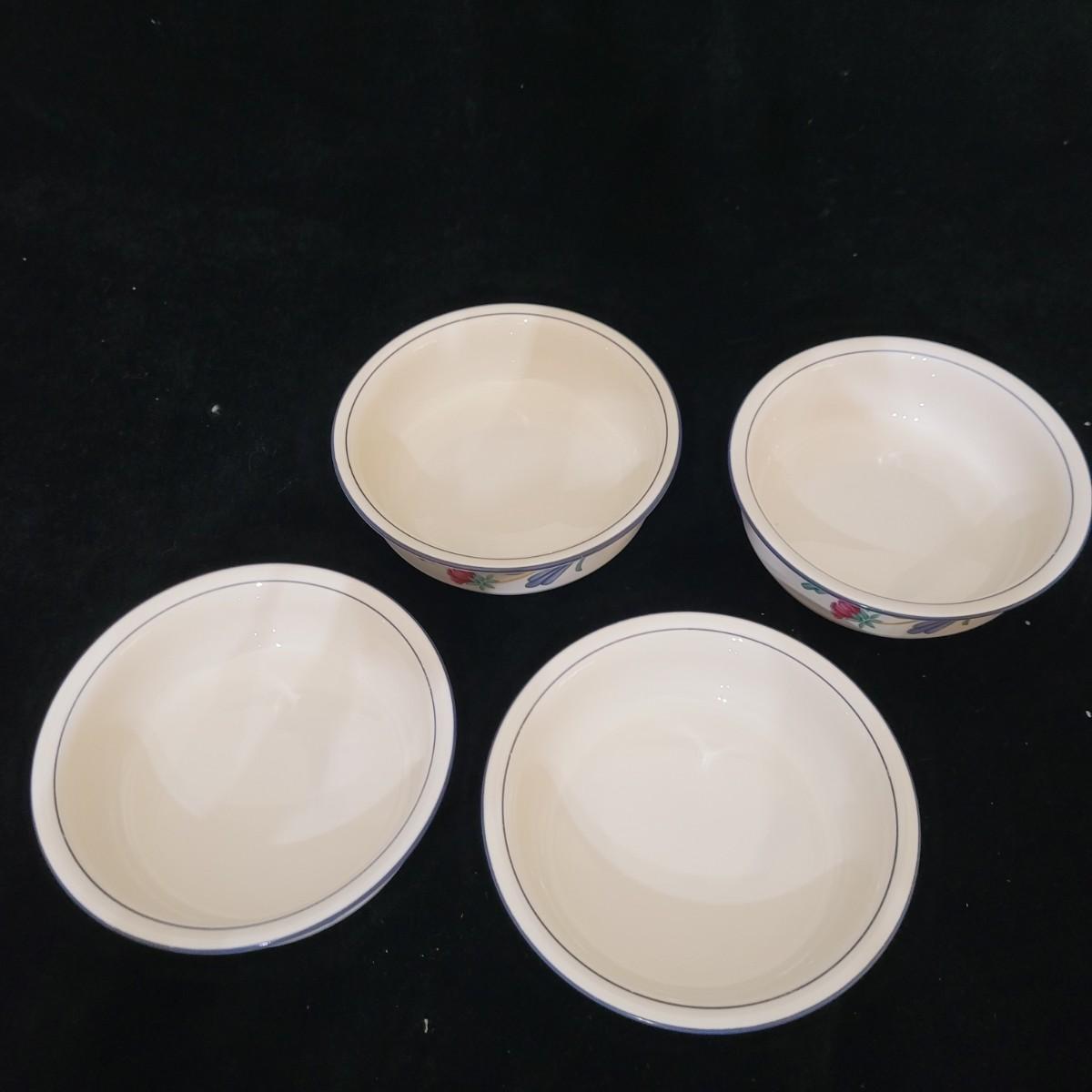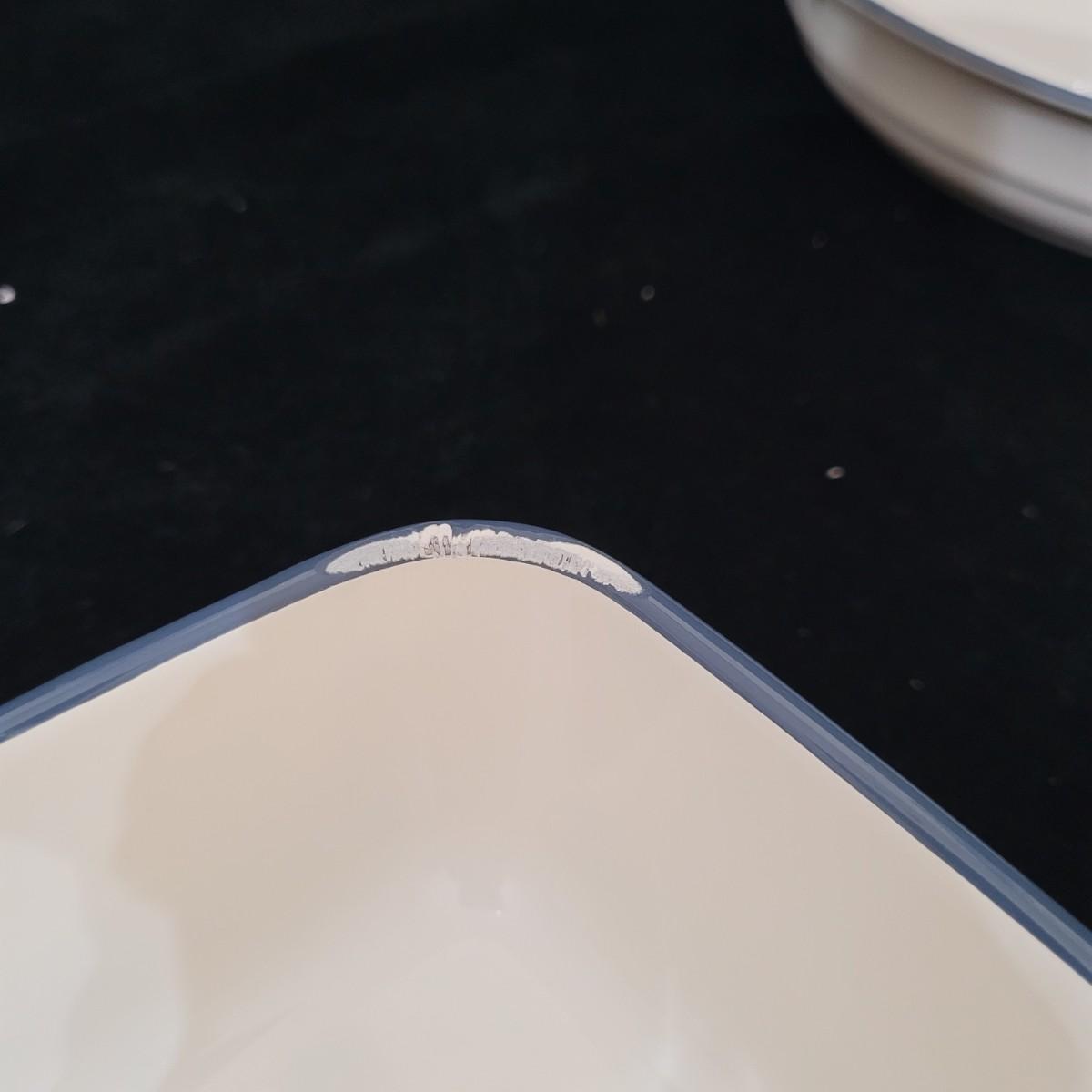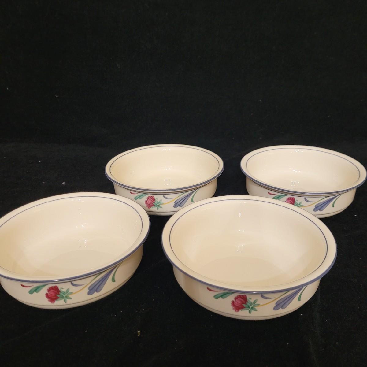 Lenox Chinastone "Poppies on Blue" serving set includes four shallow bowls, one large serving bowl, an enamel coated metal square casserole dish and a single tier serving tray. Metal handle has some scratching and square dish has chipping at corner (see photos). Items are otherwise in good condition. Large bowl measures approximately 10"DIA. Shipping available.