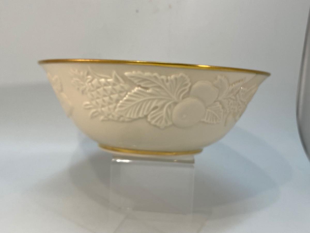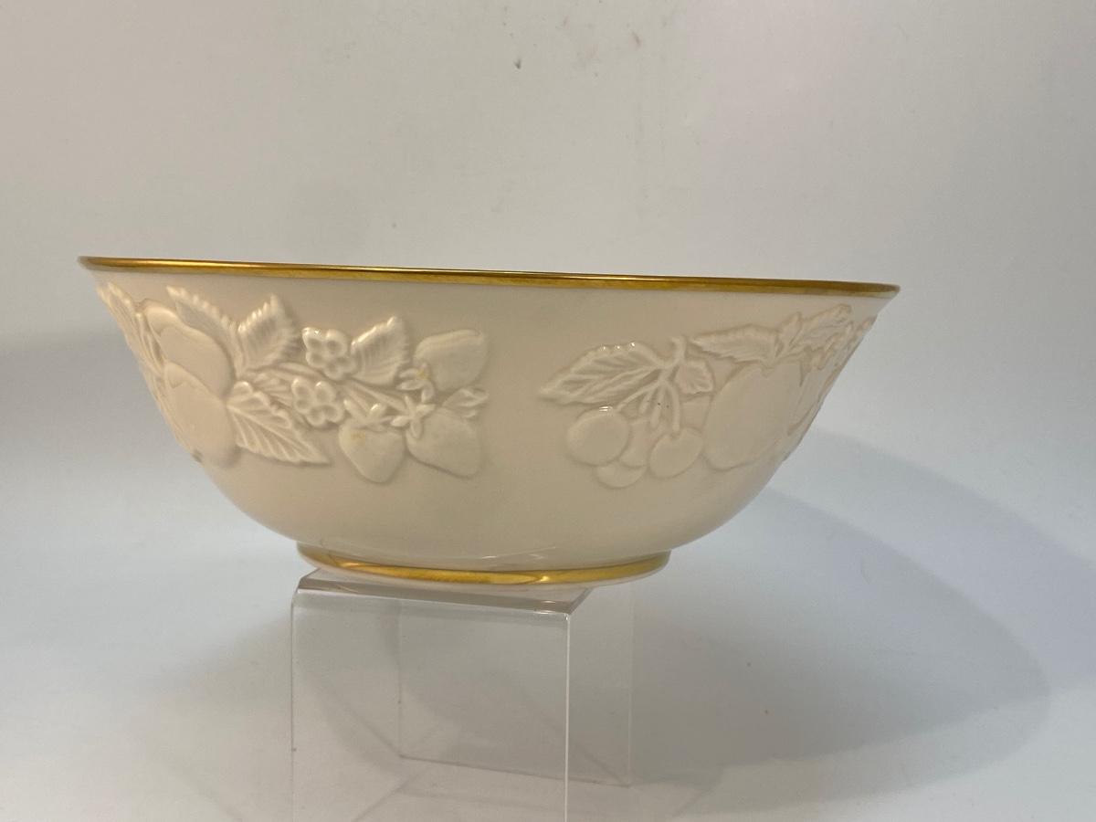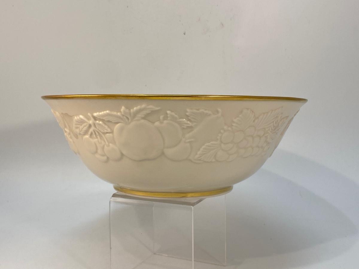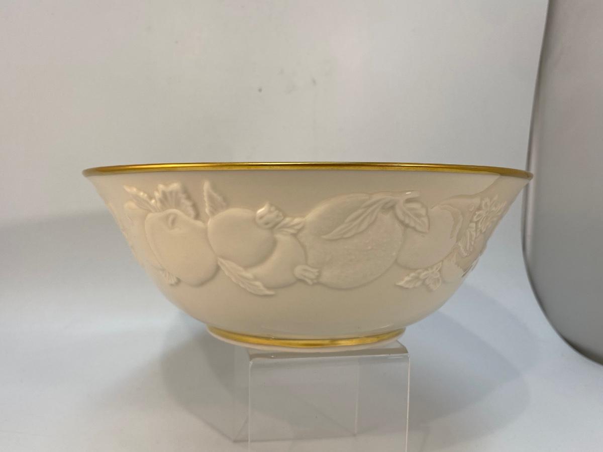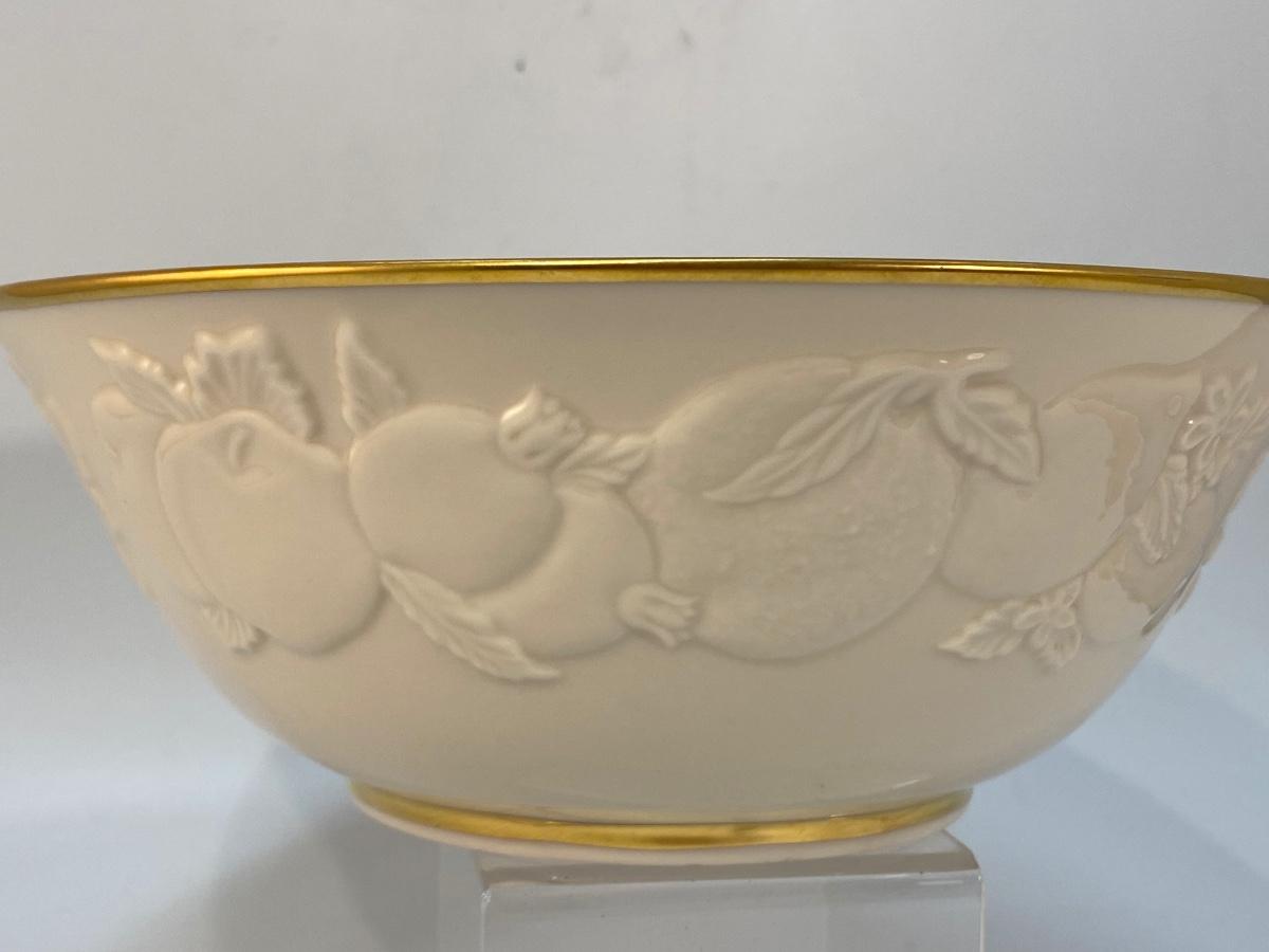 Lenox Collections Ivory & Gold Fruits of Life Bowl. Embossed fruit pattern all the way around. In good condition. About 8" diameter.