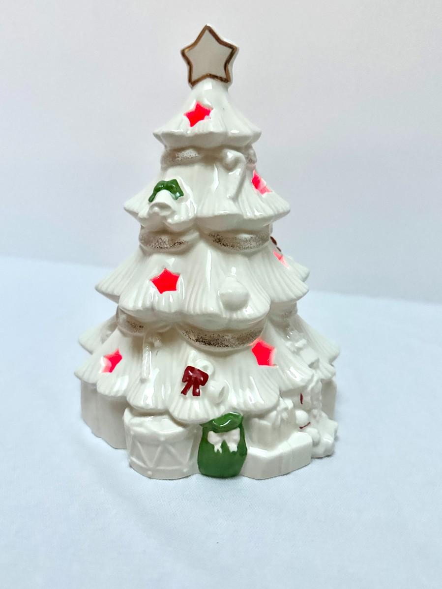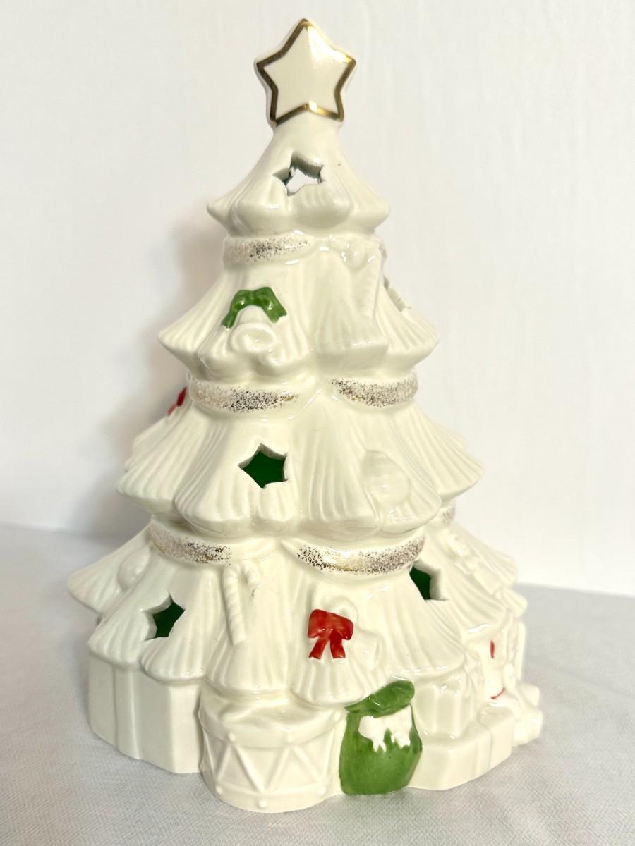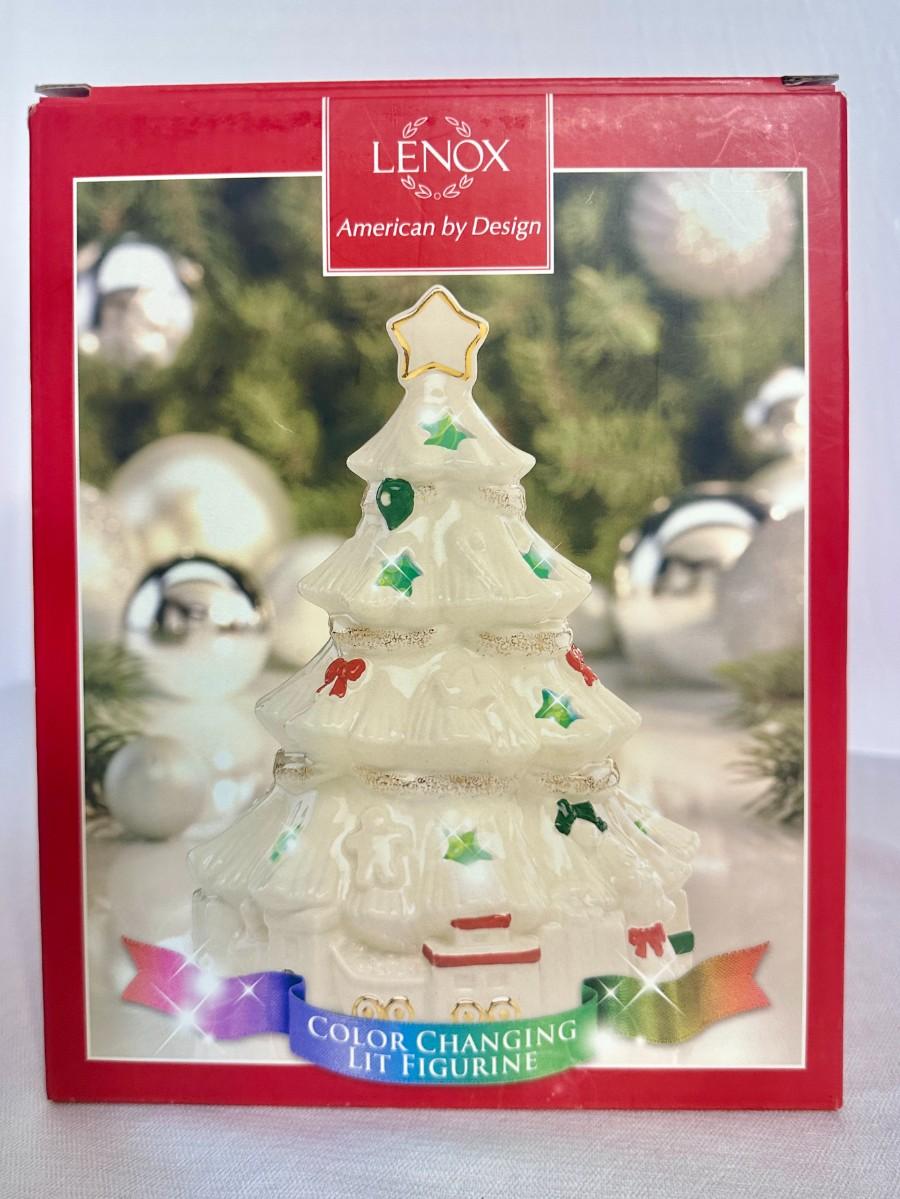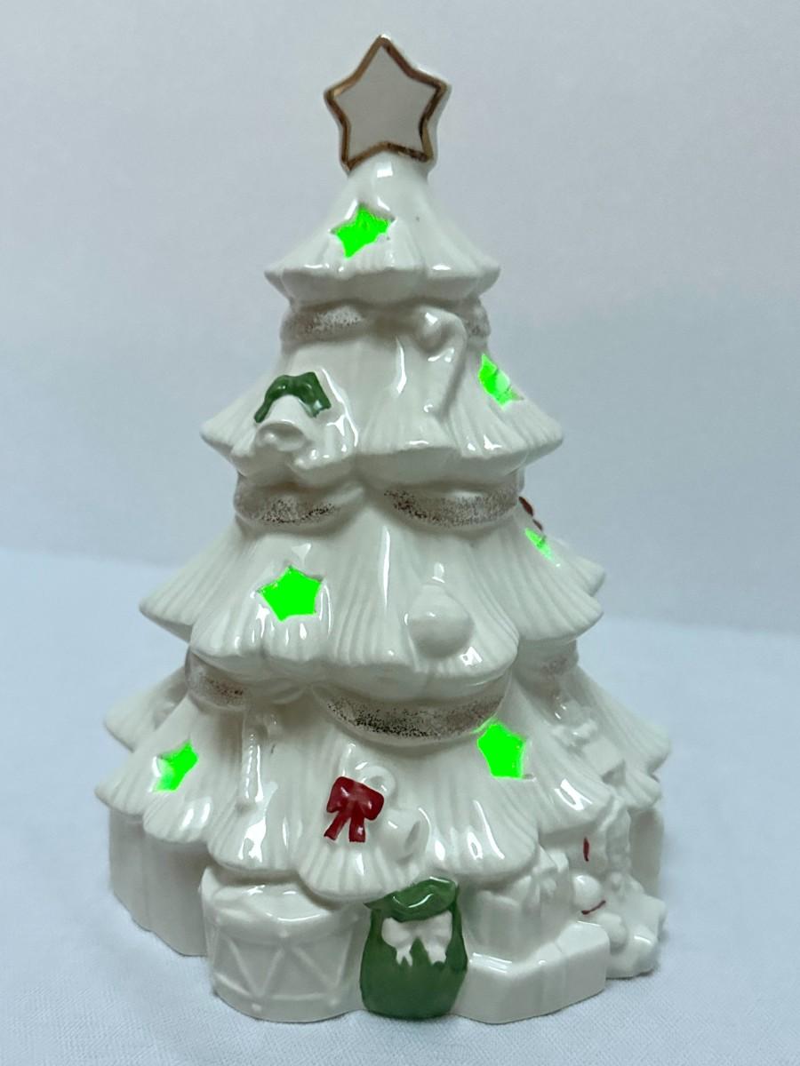 White porcelain Christmas tree stands 6.6 inches tall. Lights are battery operated. Colors change from red to green on this Lenox collectible. Great condition. Original box. Used.