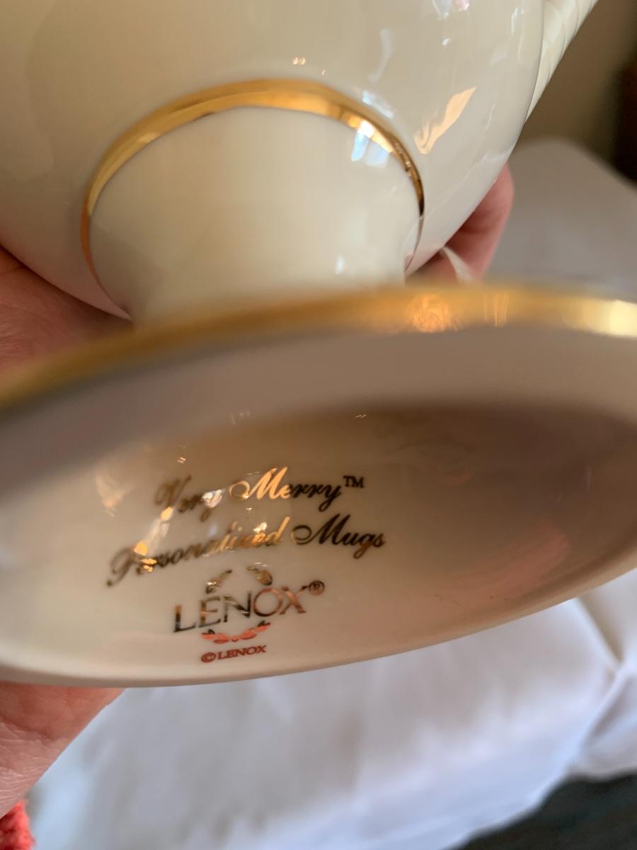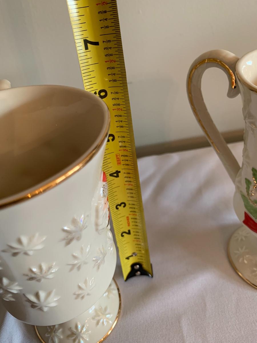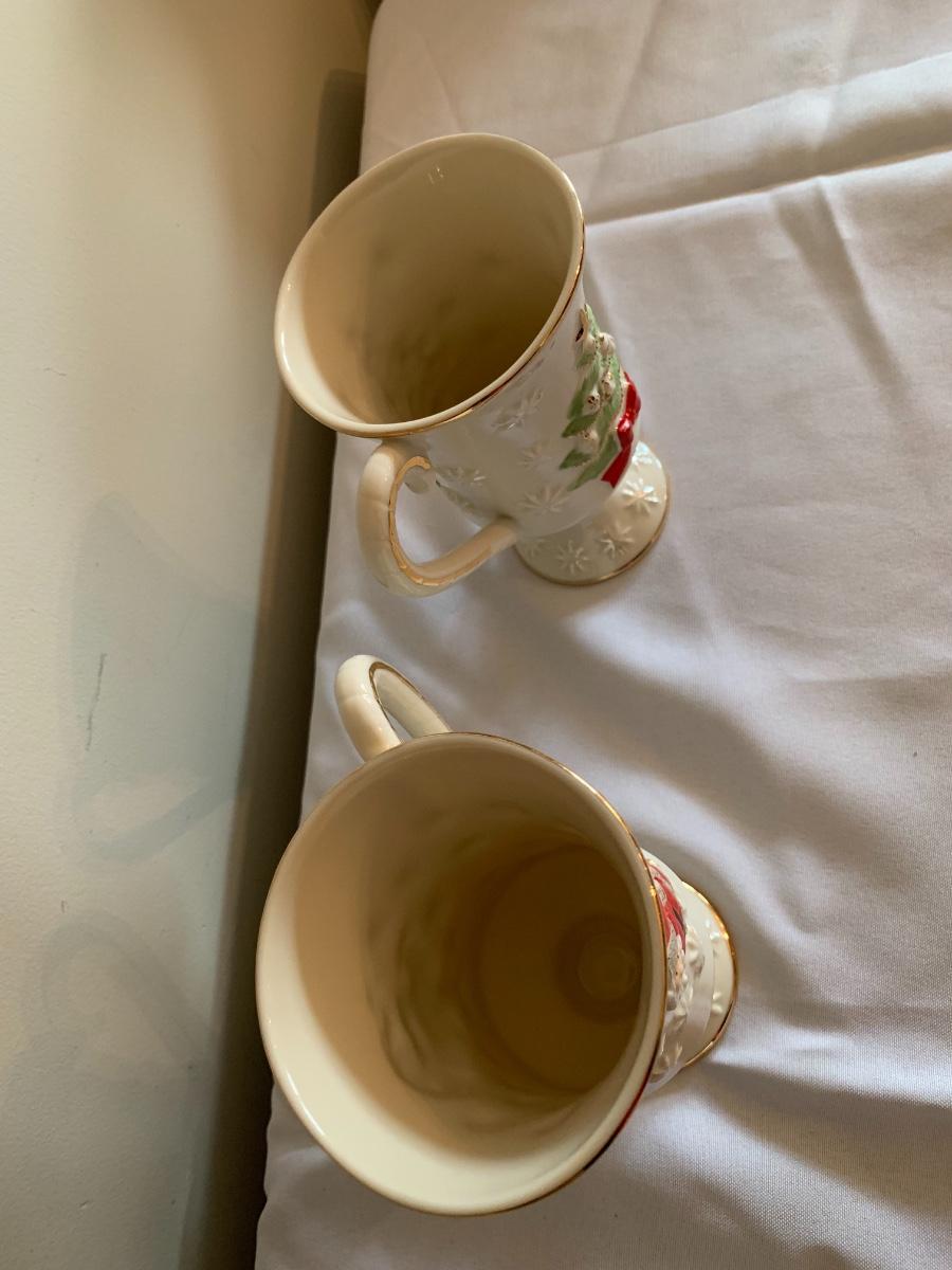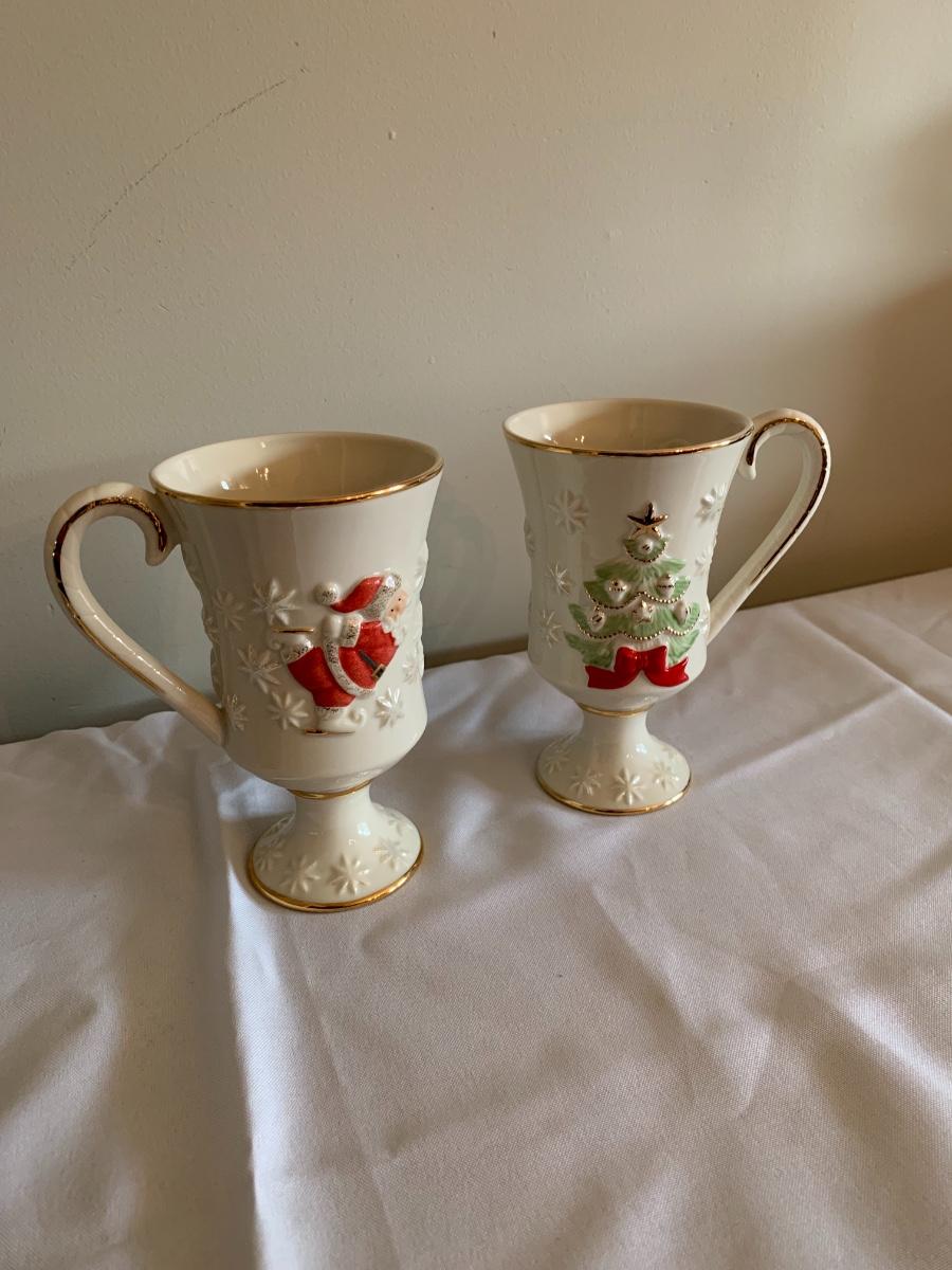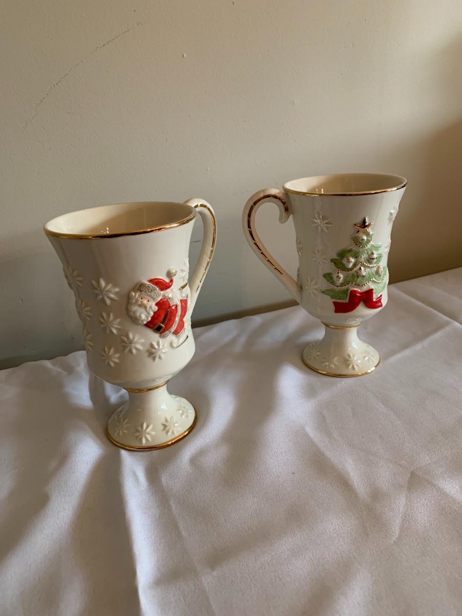 Lovely Lenox Embossed Christmas Pedestal Coffee Mugs Porcelain Christmas Tree Santa Claus Red Ribbon Gold Paint