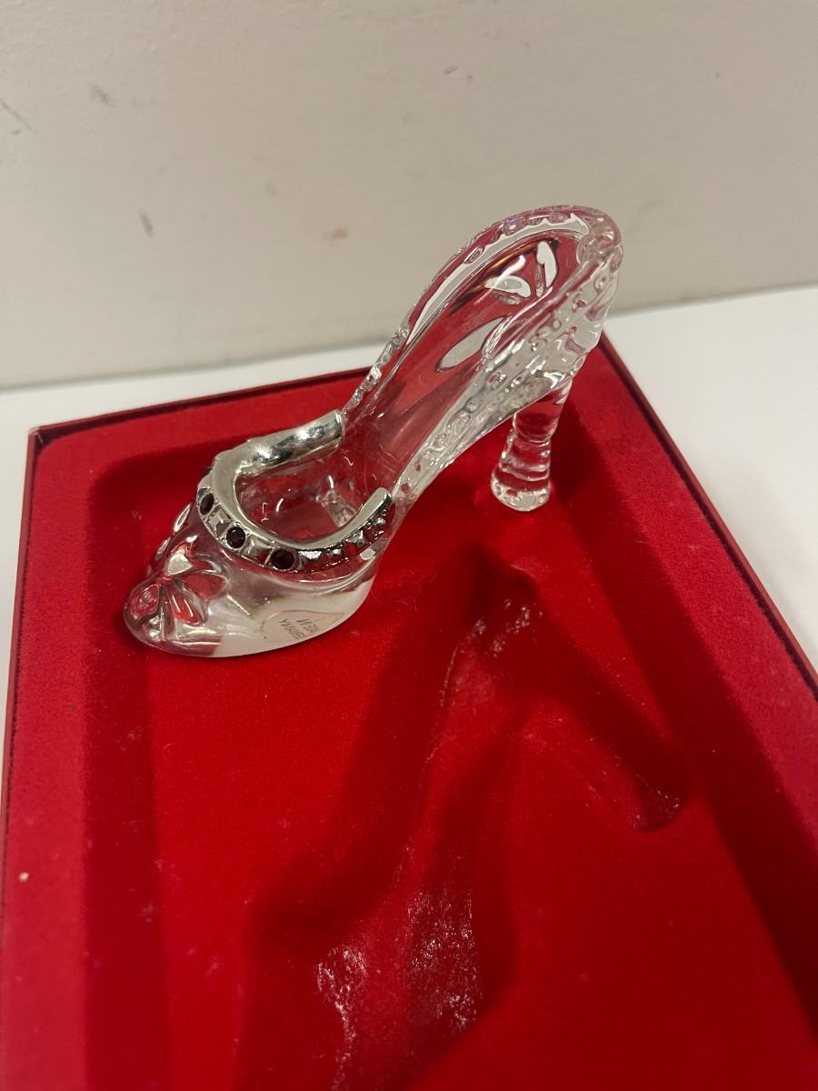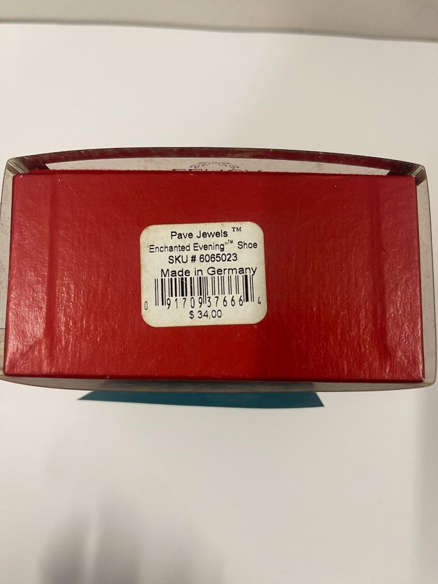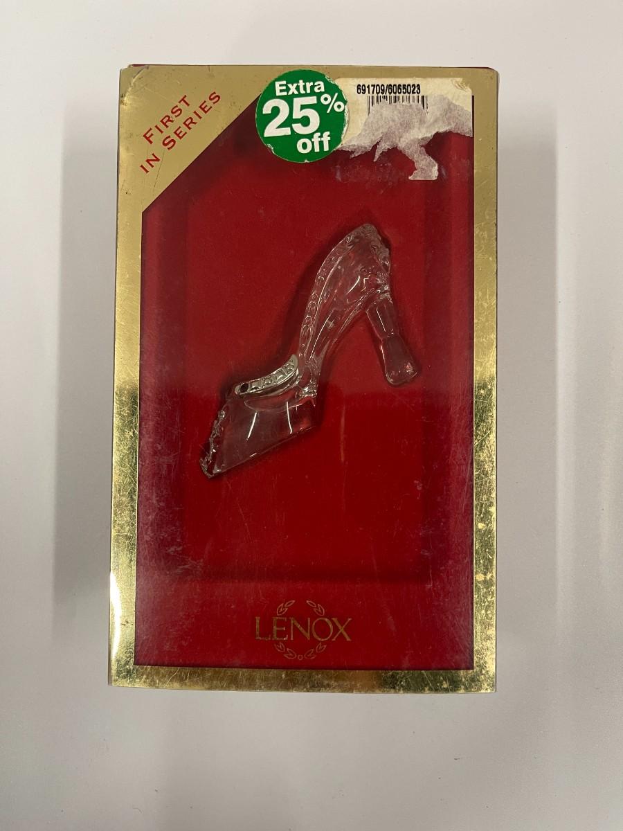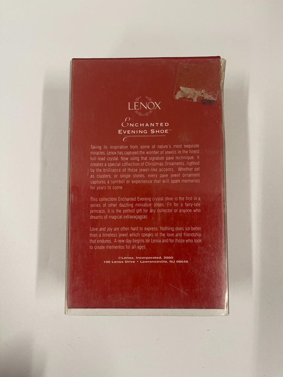 Lenox Pave Jewels Enchanted Evening glass shoe ornament . This collectible Enchanted Evening crytsal shoe is the first in a series of other dazzling miniature shoes. New in box, box shows wear. Ornament is pristine.
