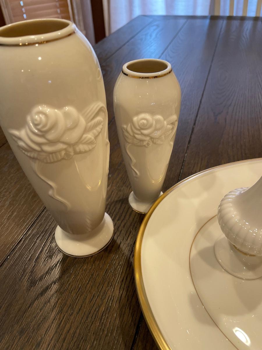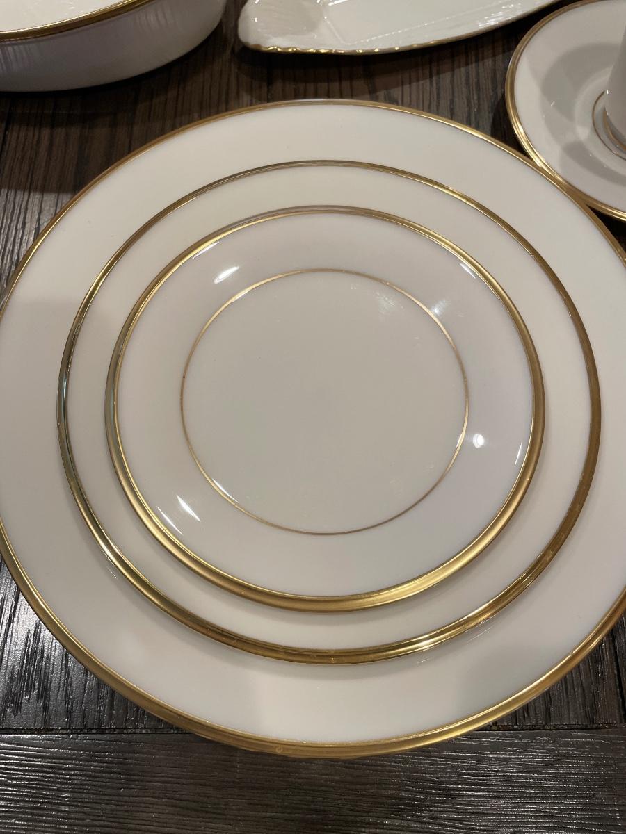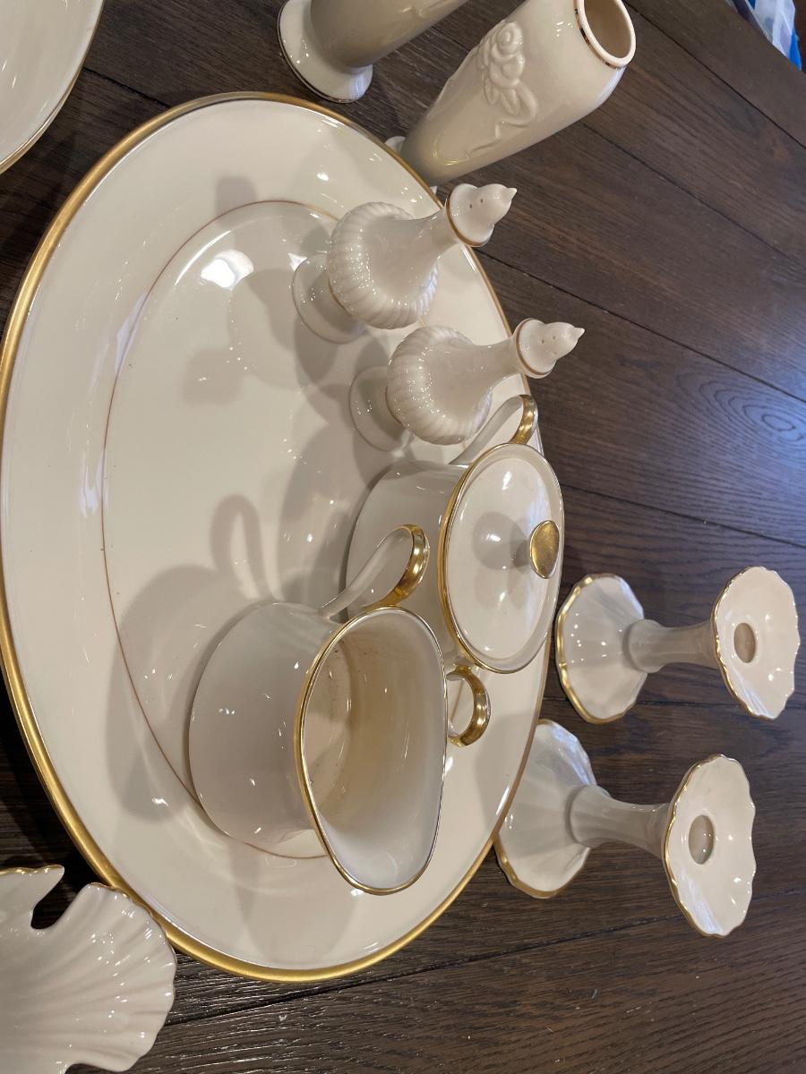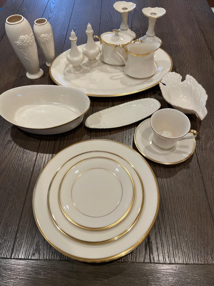 Place setting of 10. It is packed up so there maybe more of some items such as coffee cups but there is 10 for sure of everything. Also included is spoon rest 2 bud vases, butter tray, candle stick holders and platter