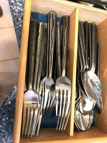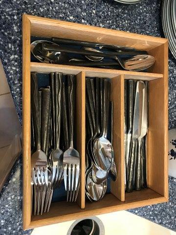 Lot includes wood caddy with Lenox stainless steel flatware. Service for 8, missing one table spoon. Includes service pieces