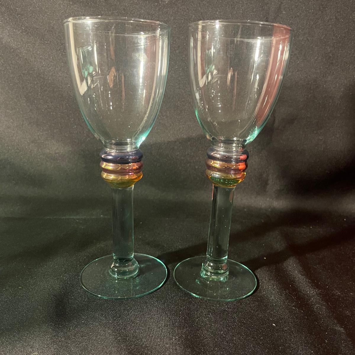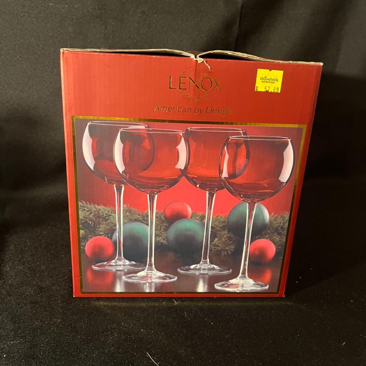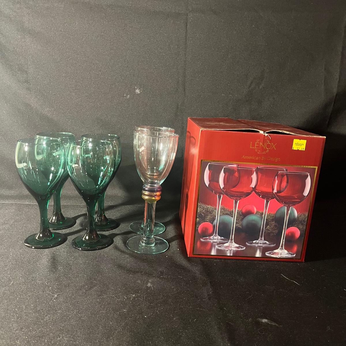 Lot includes four Lenox red and clear wine goblets in box, four green wine goblets and two clear wine goblets with tri color banded stems. Lenox glasses measure 4”D x 9”H.