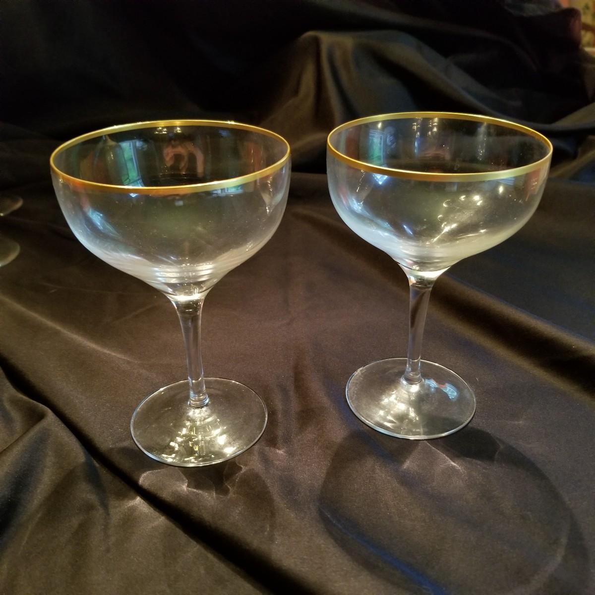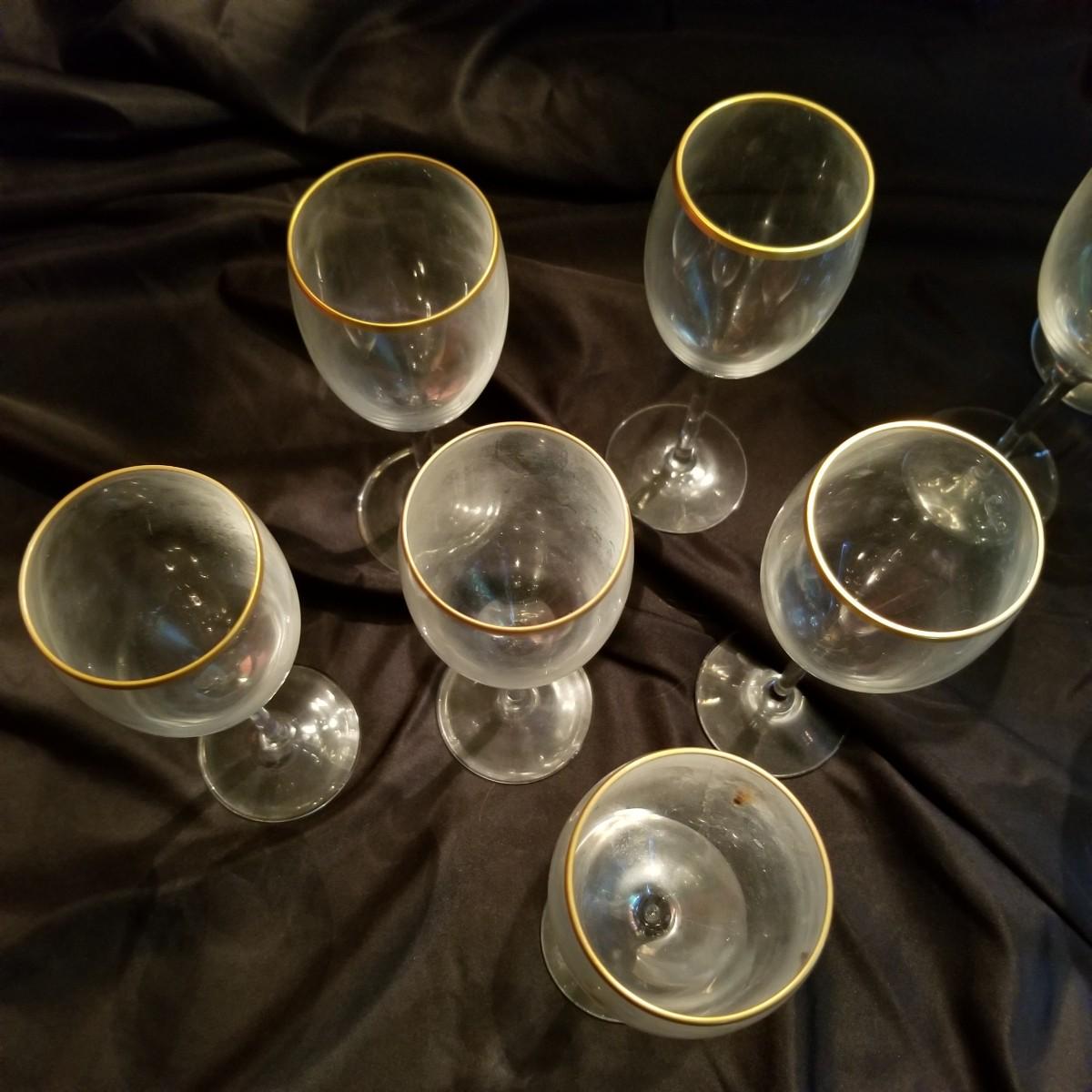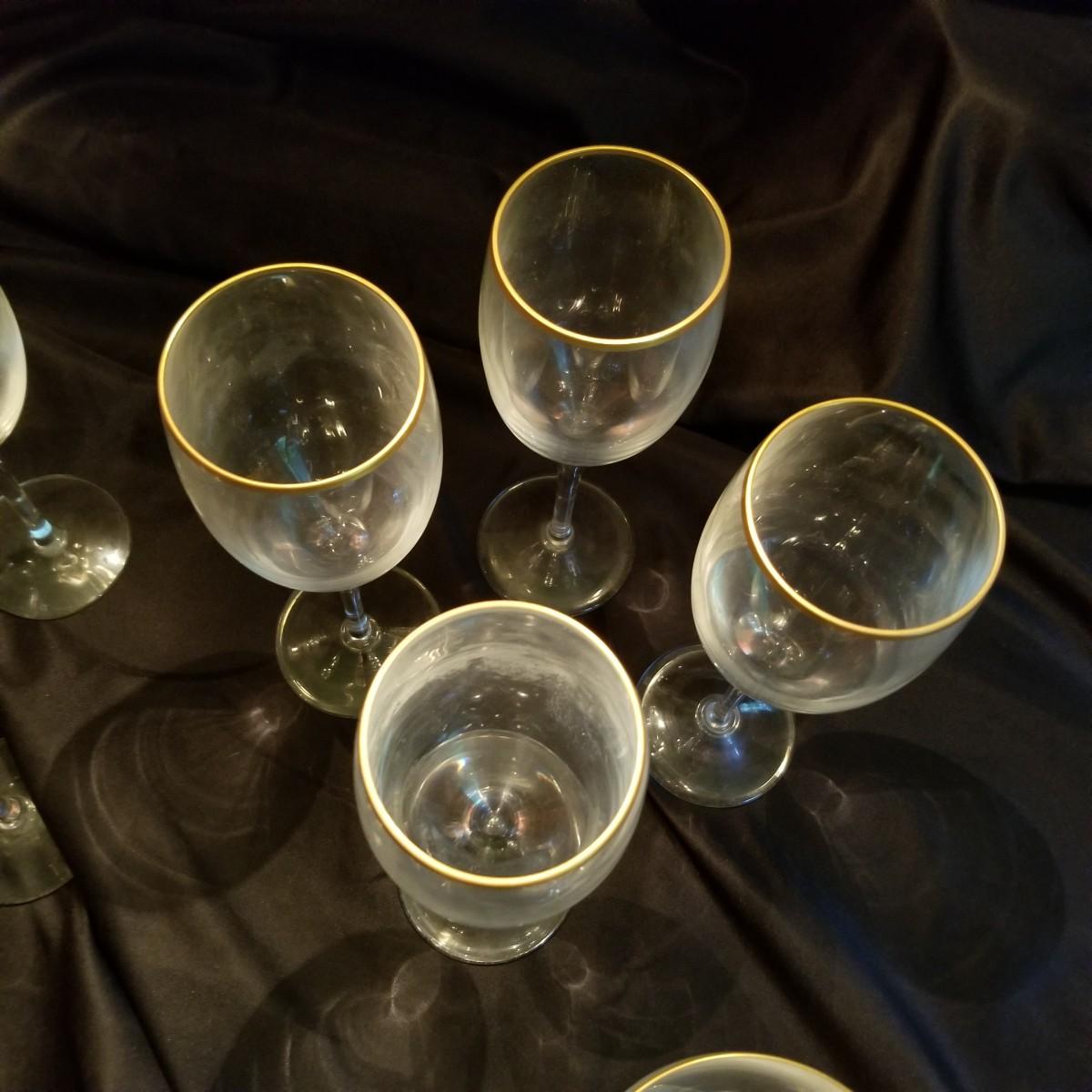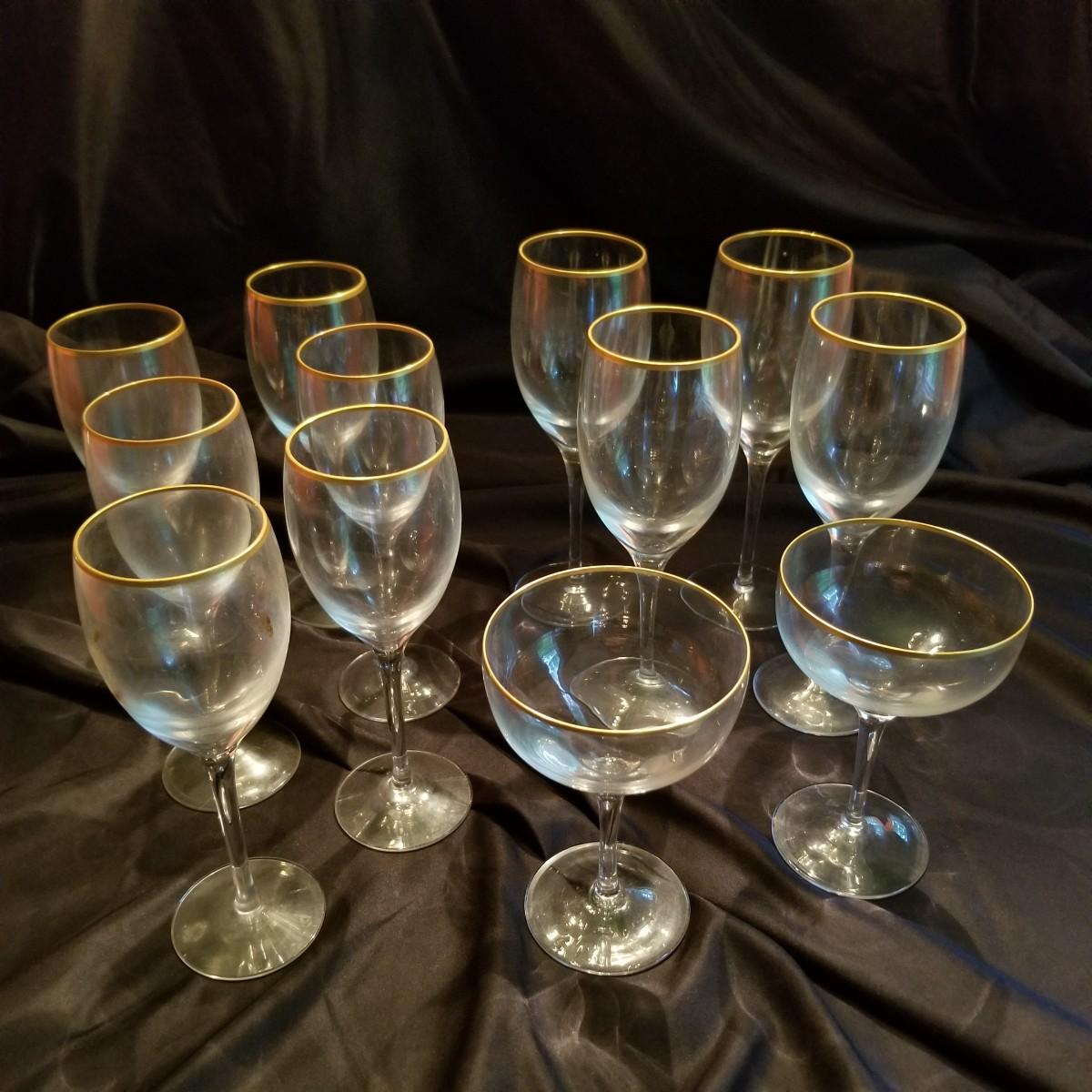 Several pieces of Lenox Gold rim stemware. Included are two champagne goblets, at 5", four tall wine glasses at 8 1/2" each, and six smaller wine glasses at 7 1/2" each. Items are in excellent condition with no nicks or chips. Shipping Available