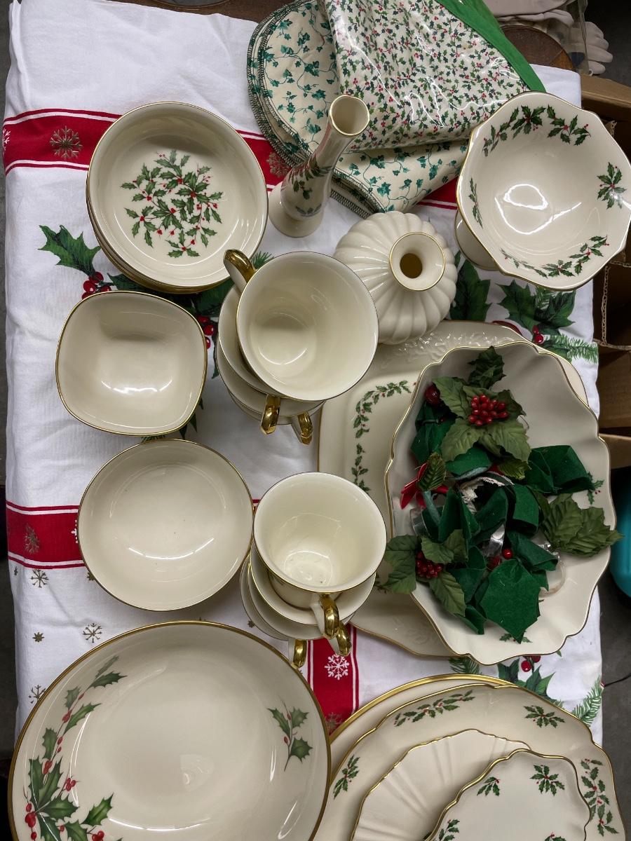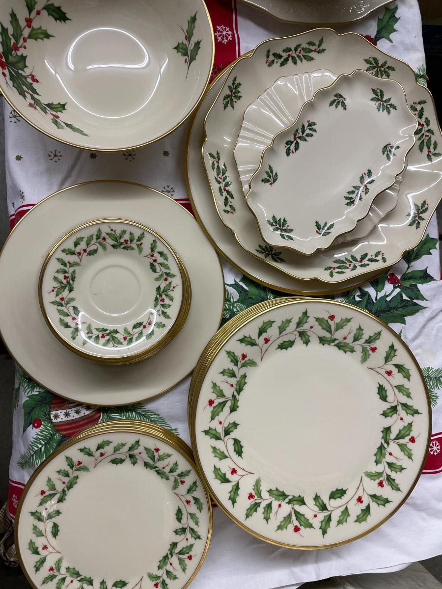 Lenox holiday china set of 9 plates and cups, only 8 salad plates. Comes with many platters and 2 vases, & bowls