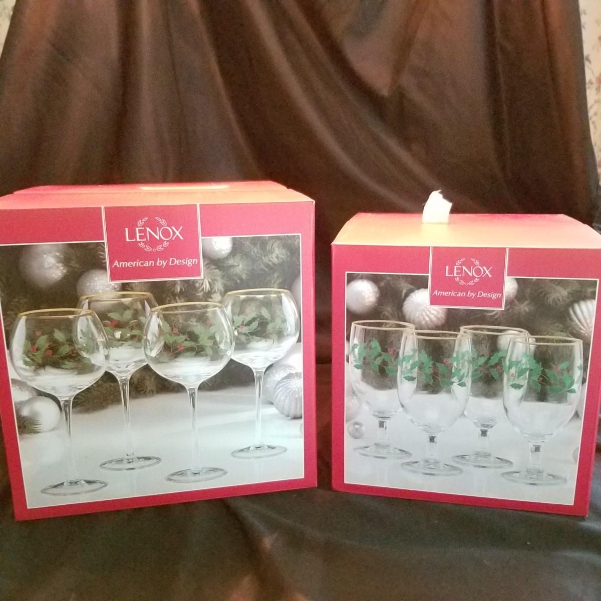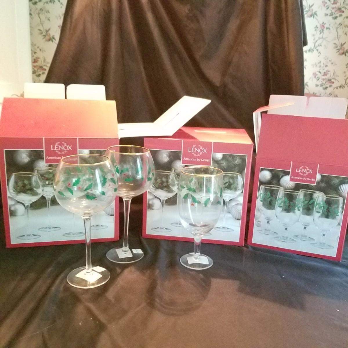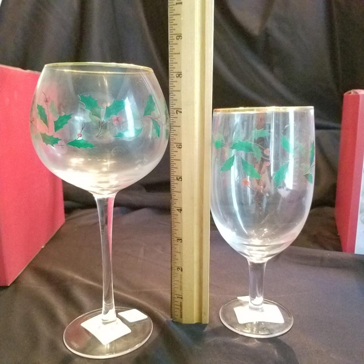 Two boxes of four each balloon glasses, sixteen oz and 8" tall. One box of four iced beverage, twelve oz and 7" tall. All items gold rimmed with holiday design. Boxed items new in box. Also included are seven additional balloon goblets and three beverage glasses, no box. All items in good condition with no chips or nicks. Shipping available.