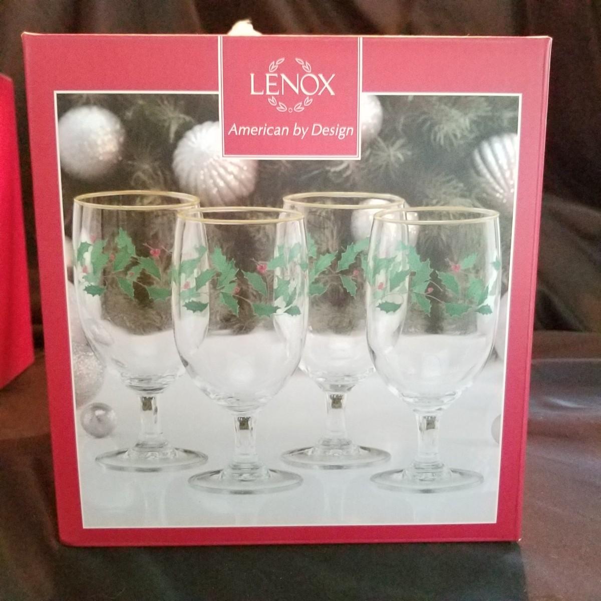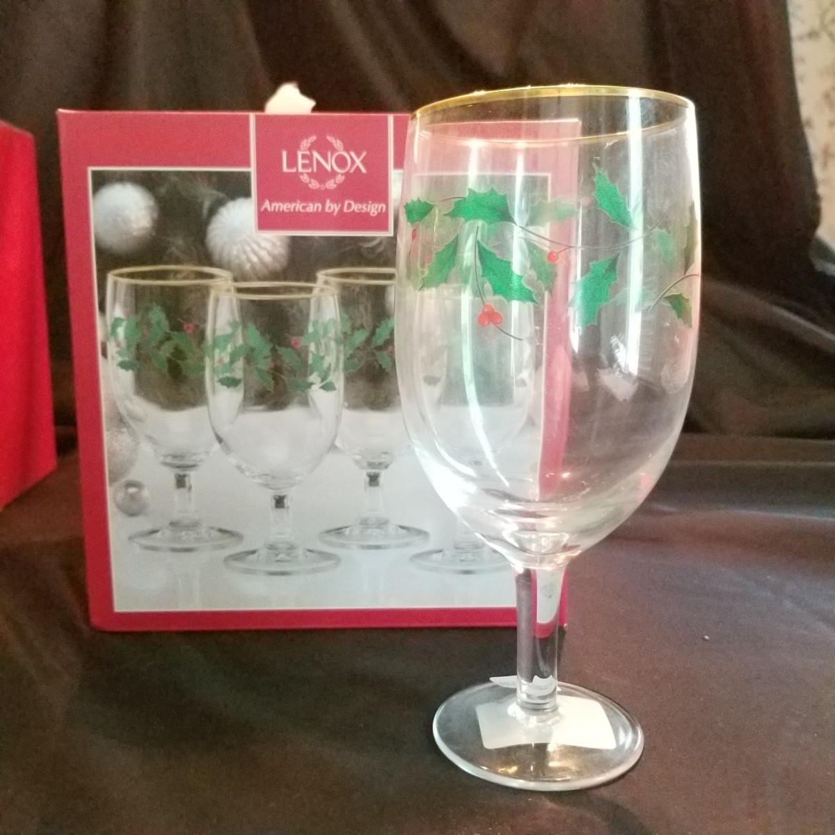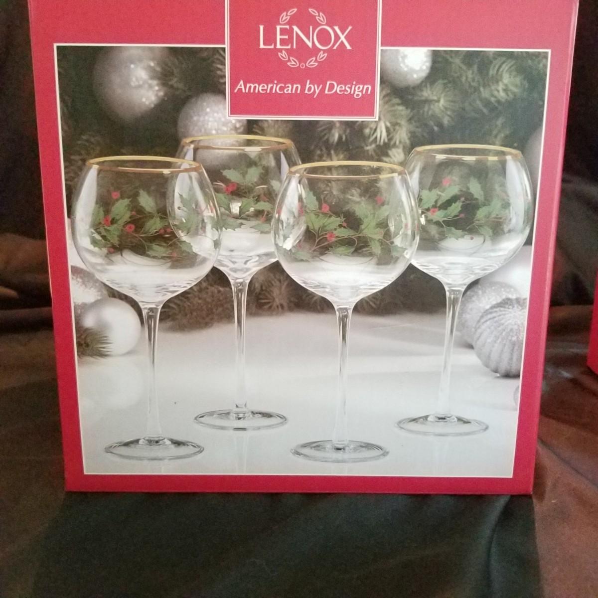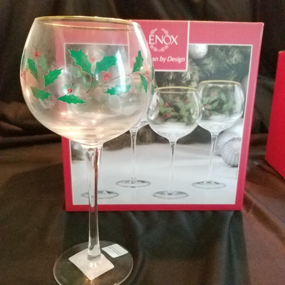 Two boxes of four each balloon glasses, sixteen oz and 8" tall. One box of four iced beverage, twelve oz and 7" tall. All items gold rimmed with holiday design. Boxed items new in box. Also included are seven additional balloon goblets and three beverage glasses, no box. All items in good condition with no chips or nicks. Shipping available.