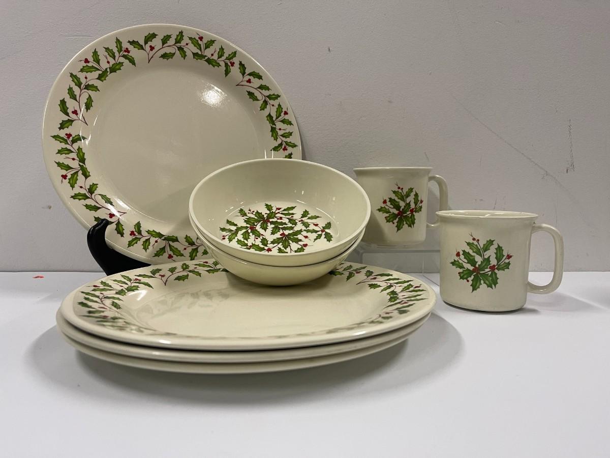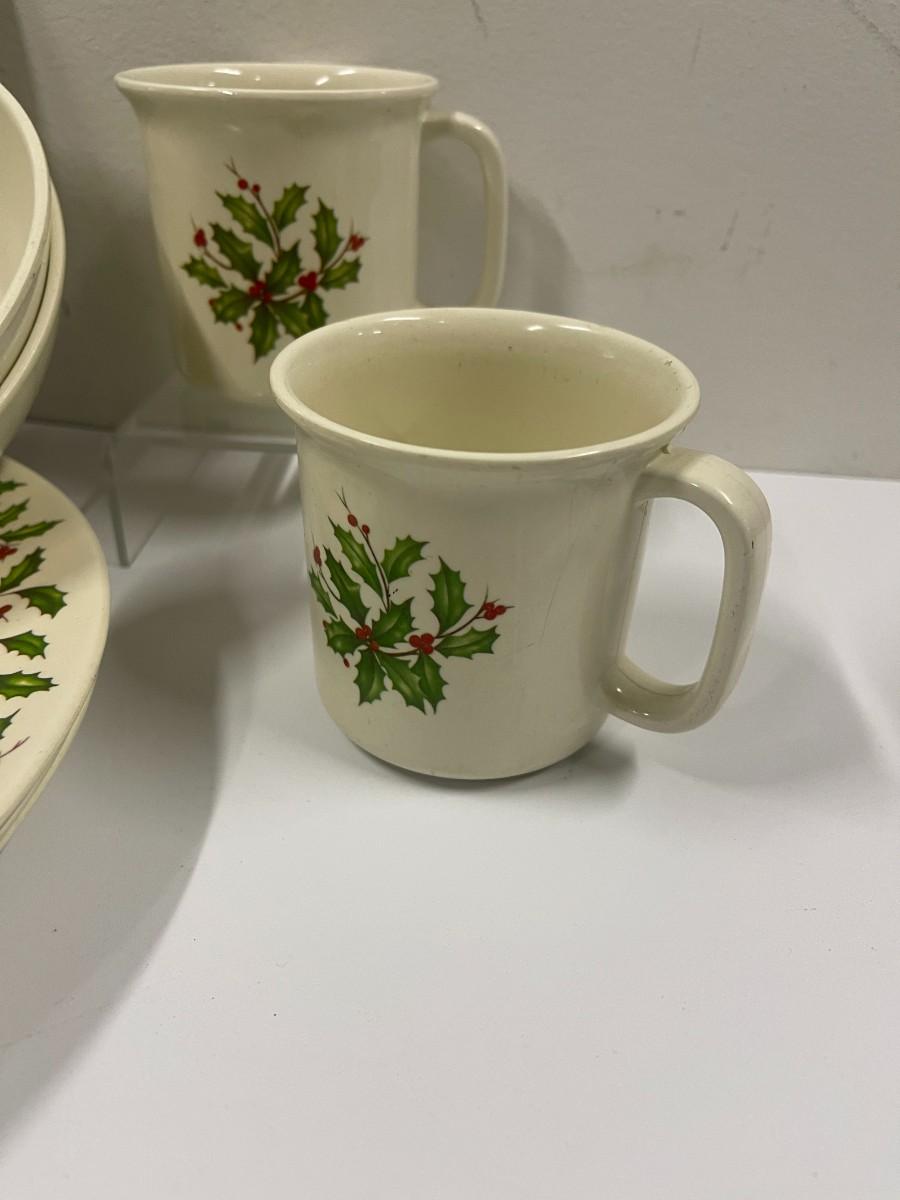 Lenox holiday melamine dish set. Includes 4 melamine dinner plates (10"), 2 cups and 2 matching bowls. All in very good condition.
