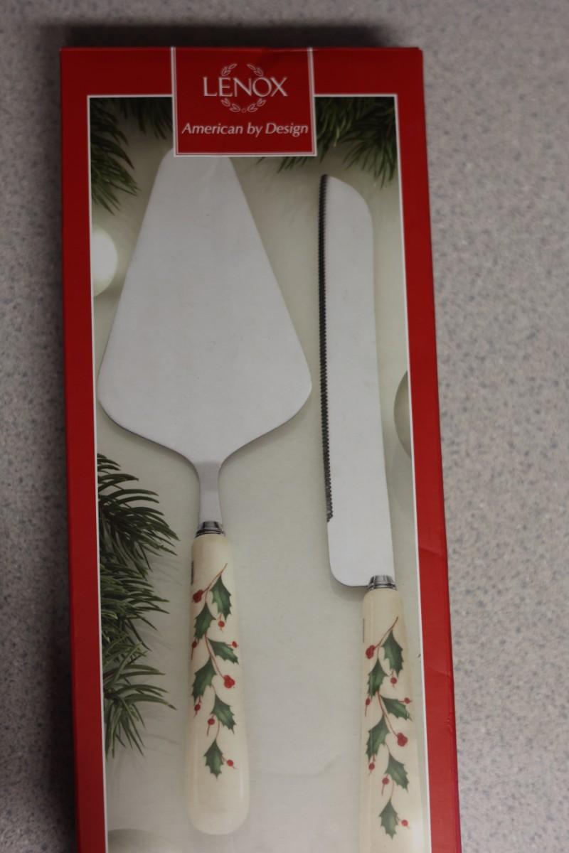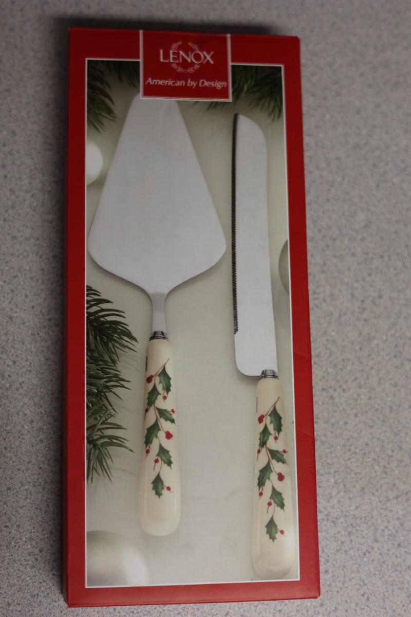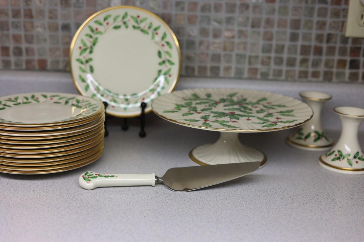 LENOX Holiday Set - (1) Dessert Stand, (1) Stainless Dessert Knife & (2) Servers, (2) Candle Holders, (13) Dessert/Salad Plates