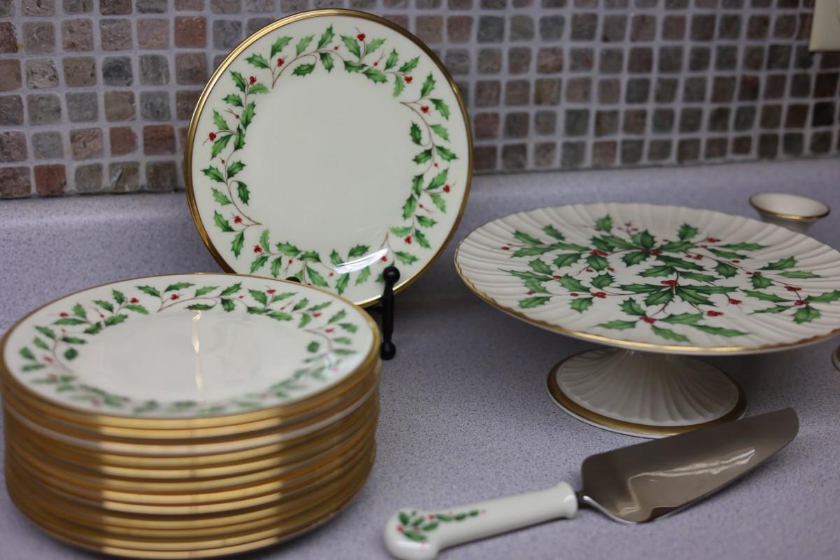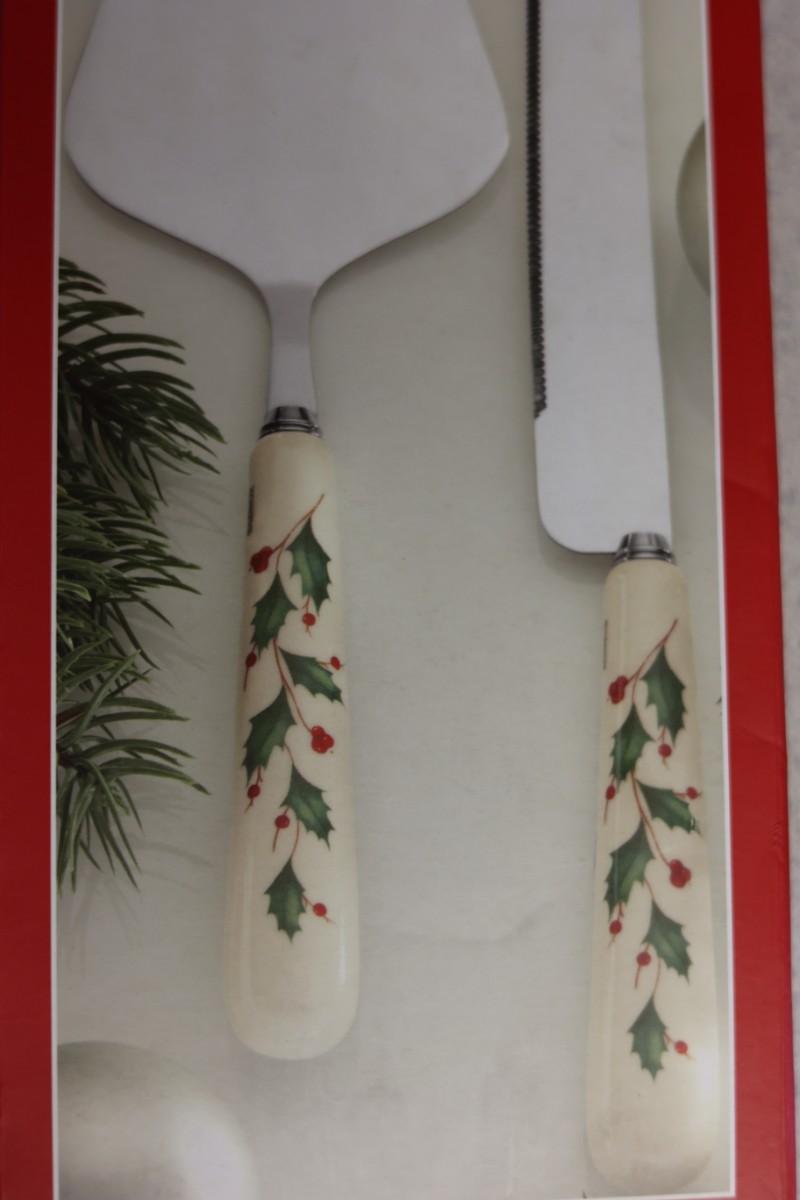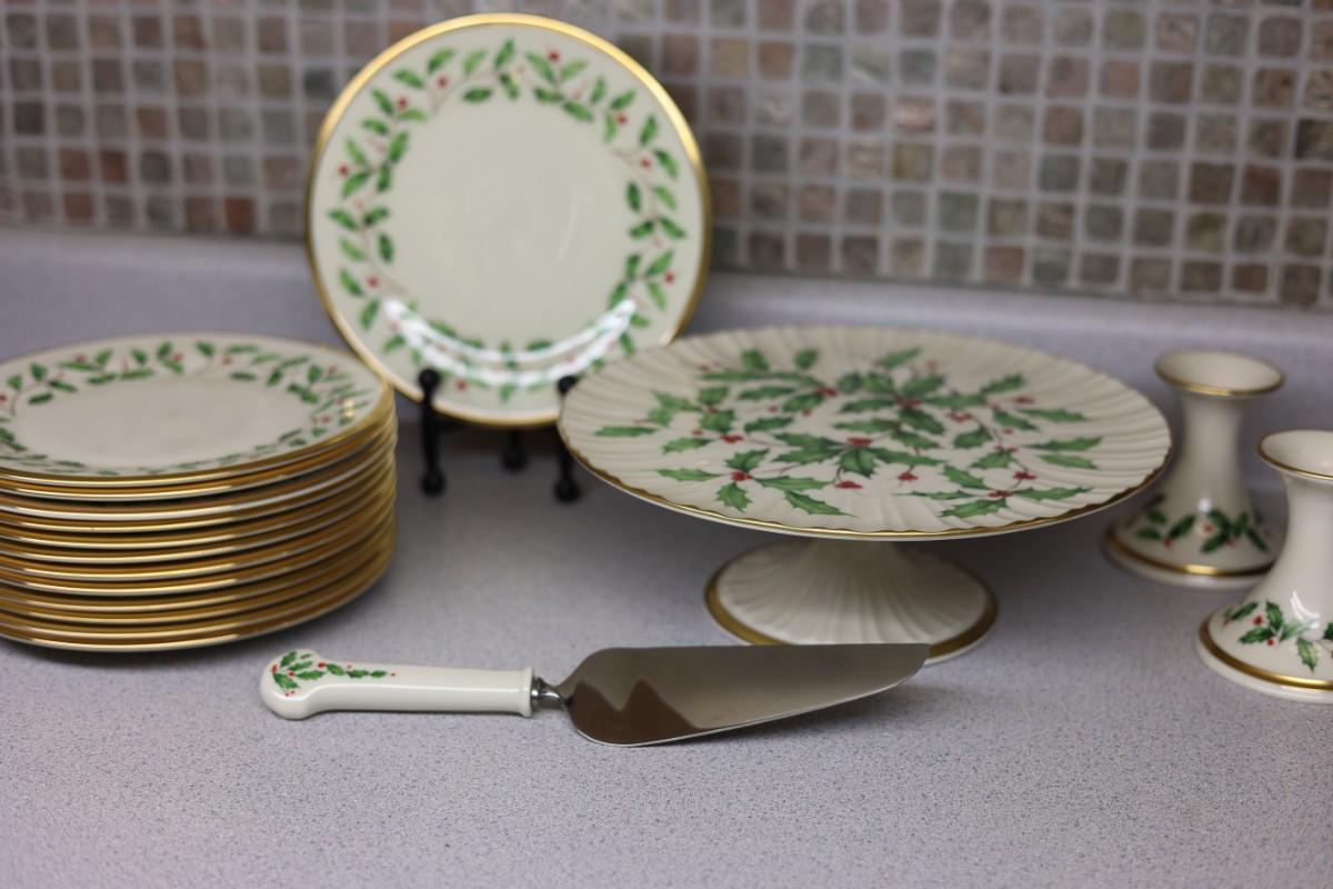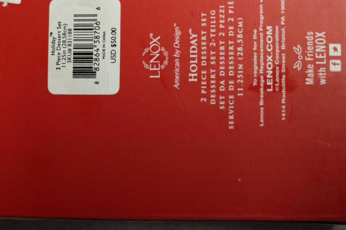 LENOX Holiday Set - (1) Dessert Stand, (1) Stainless Dessert Knife & (2) Servers, (2) Candle Holders, (13) Dessert/Salad Plates