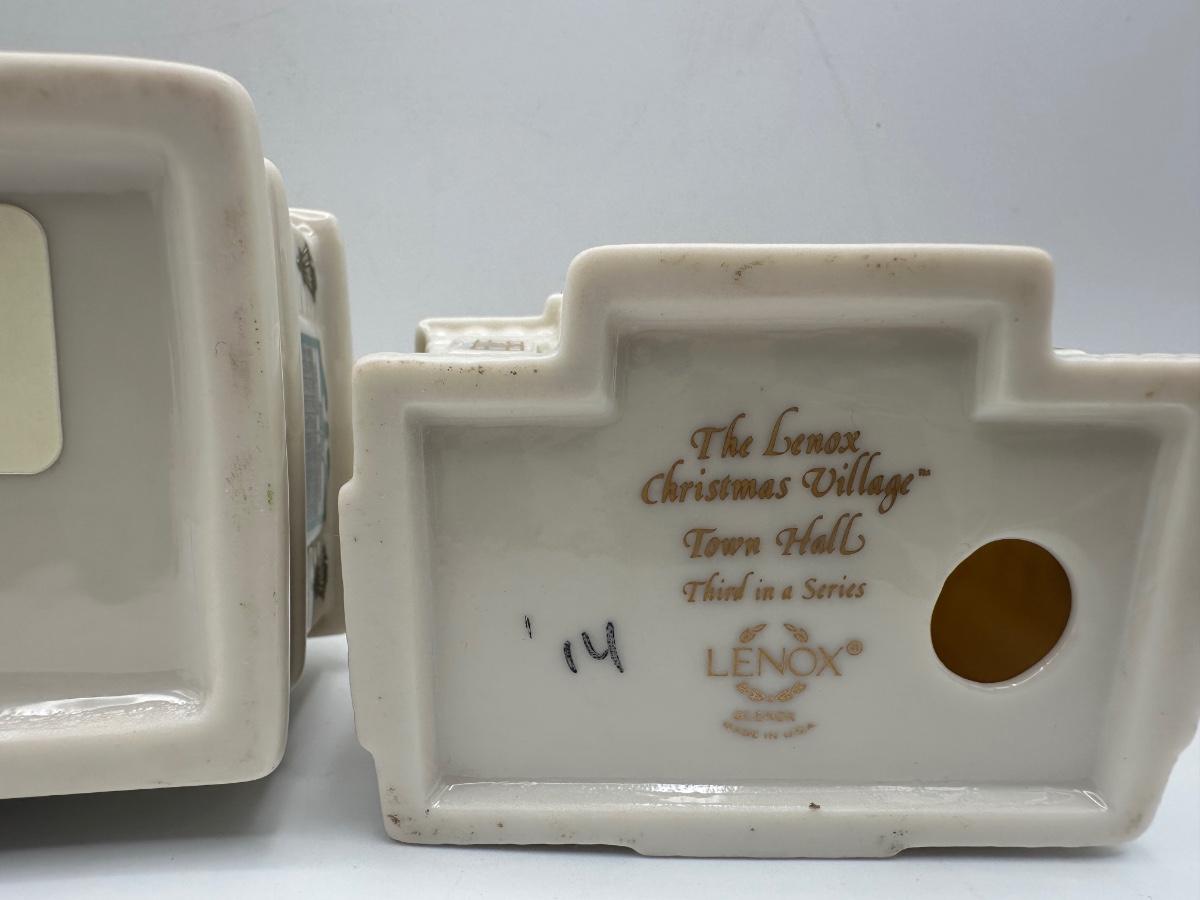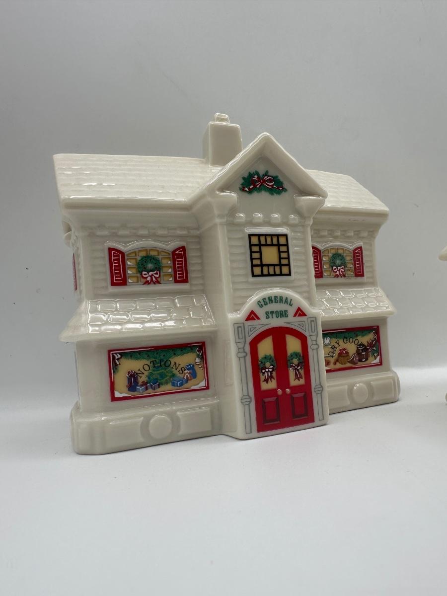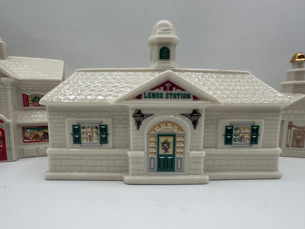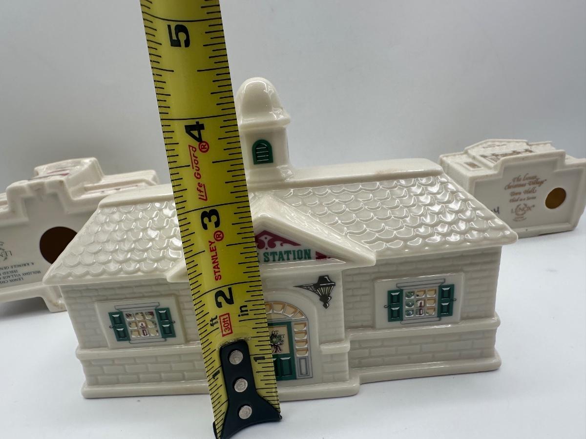 Group of three Lenox holiday village buildings from the Lenox China Holiday Village Collection. Dimensions shown in photos.