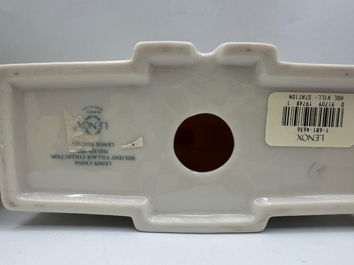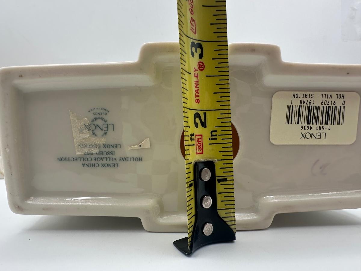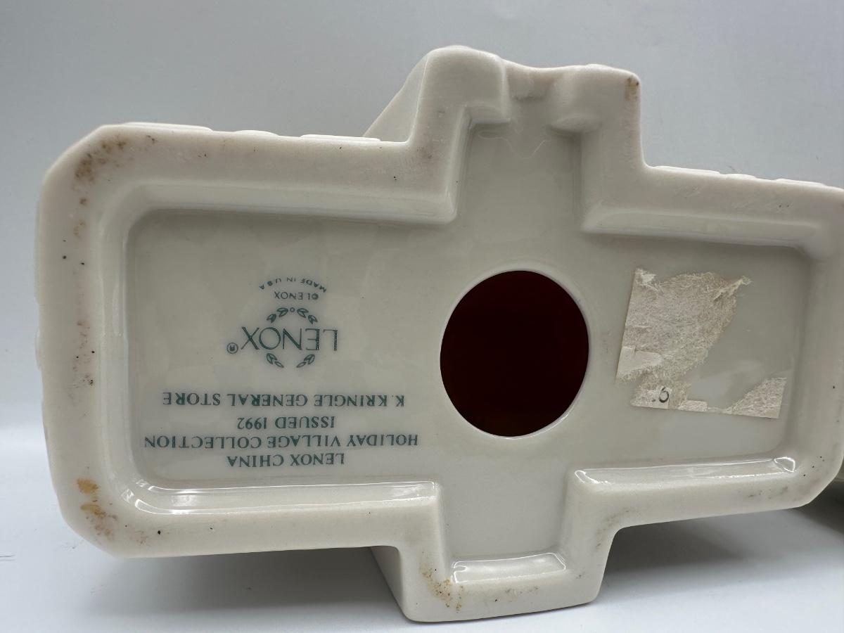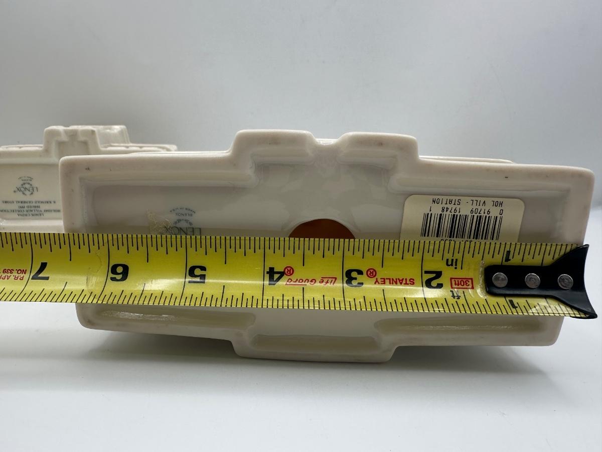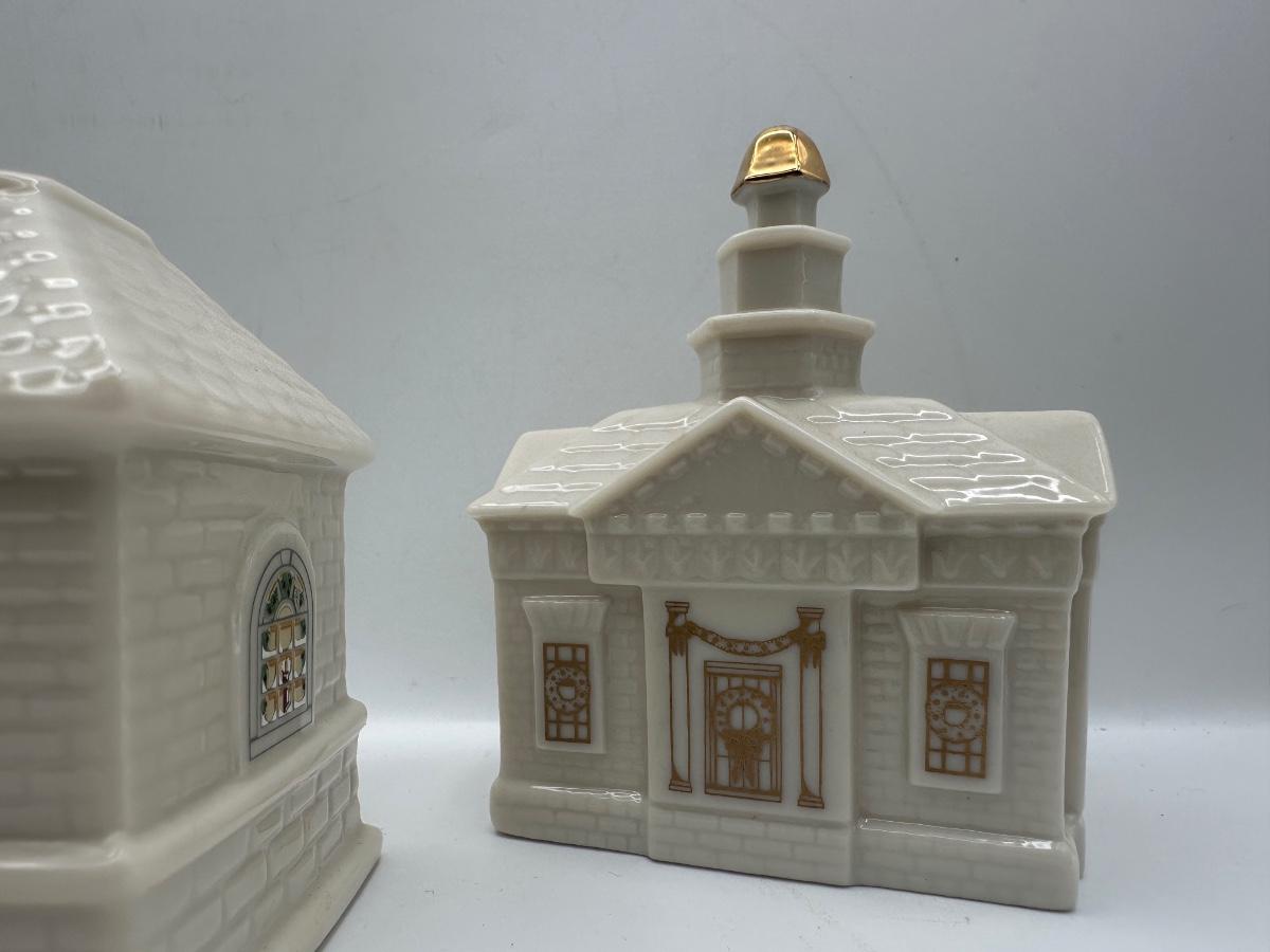 Group of three Lenox holiday village buildings from the Lenox China Holiday Village Collection. Dimensions shown in photos.