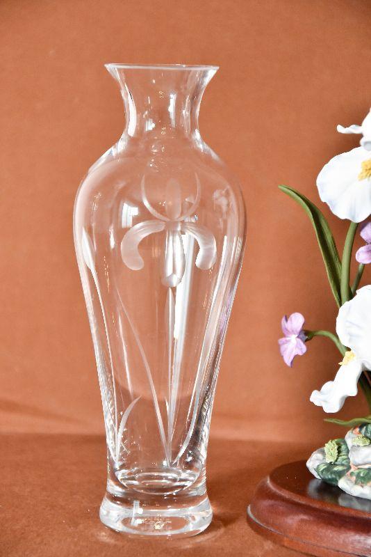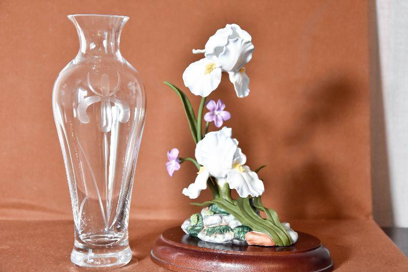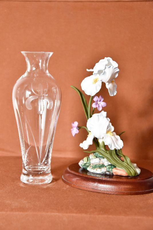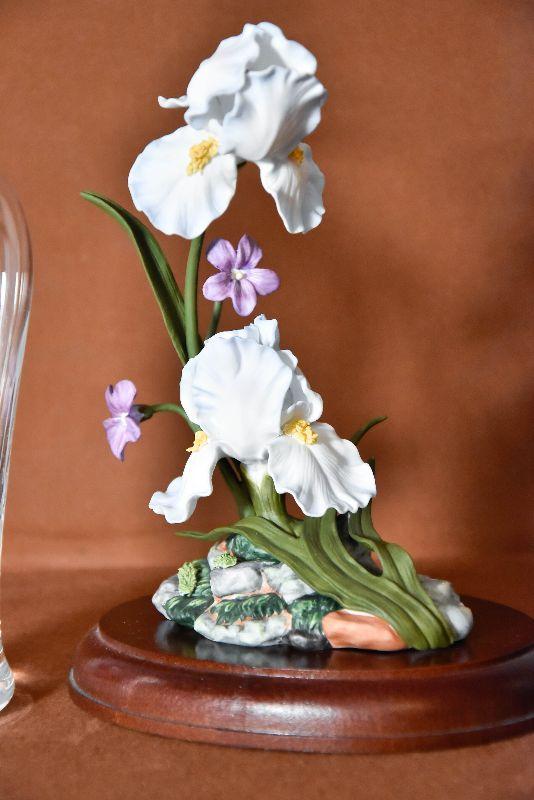 This is a stunning and hard to find Iris Germanica Bone China sculpture. The details and colors are amazing. Created for the Lenox Floral Sculpture Collection., crafted of fine bone china and bronze, and painted entirely by hand. The sculpture's base bears the botanical name of the iris and the distinctive Lenox trademark in pure 24 karat gold. Also included is a vintage etched glass vase with an Iris.