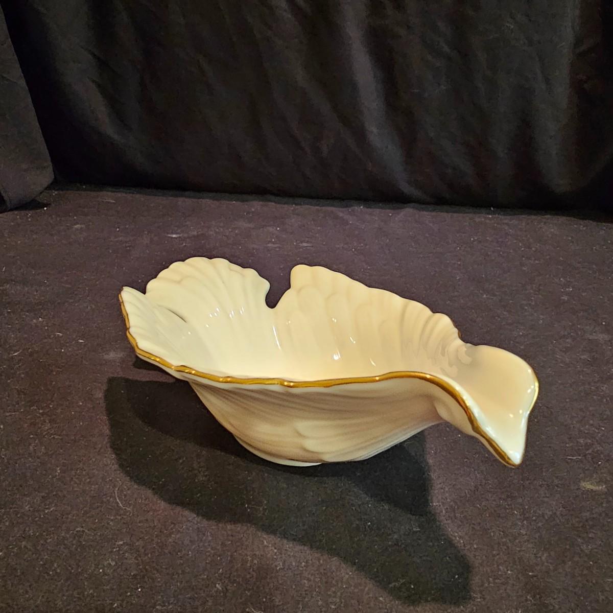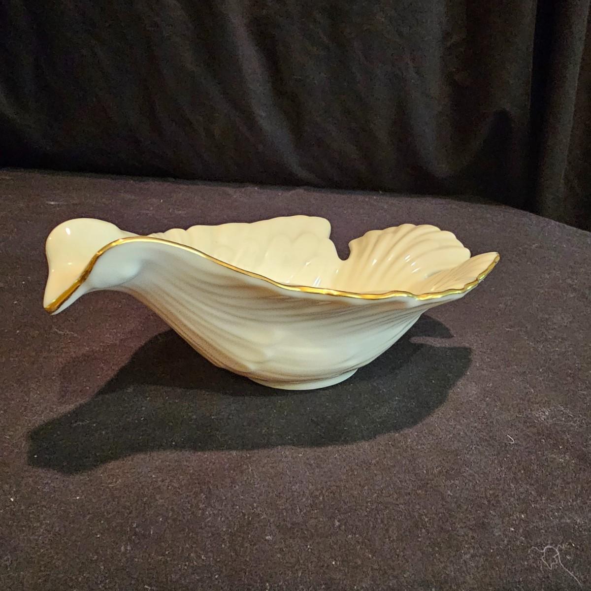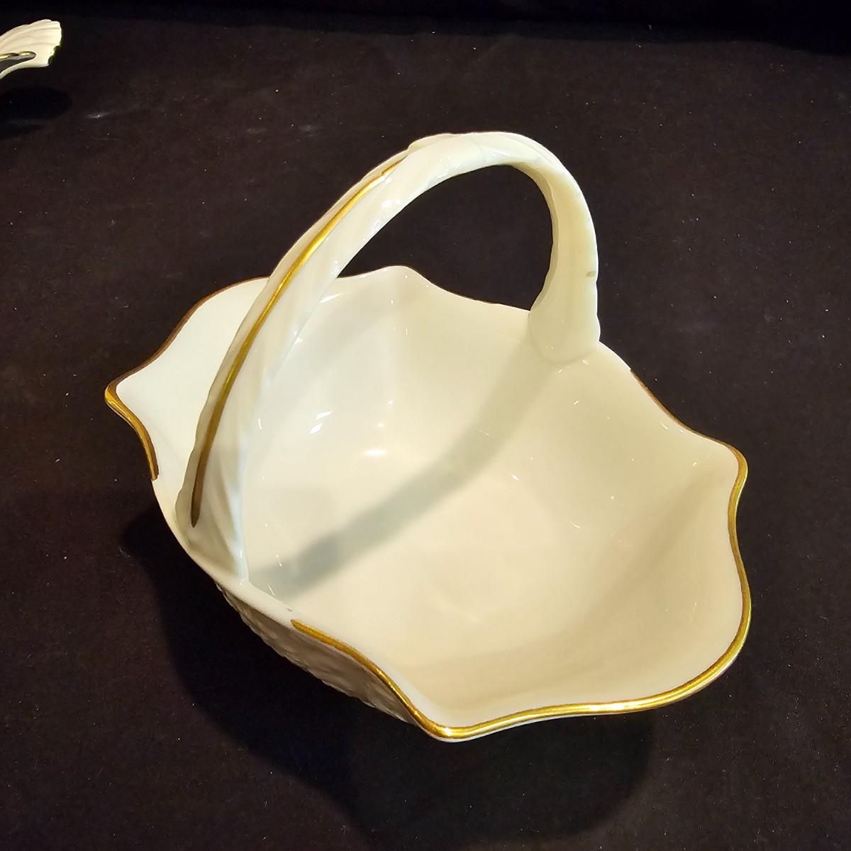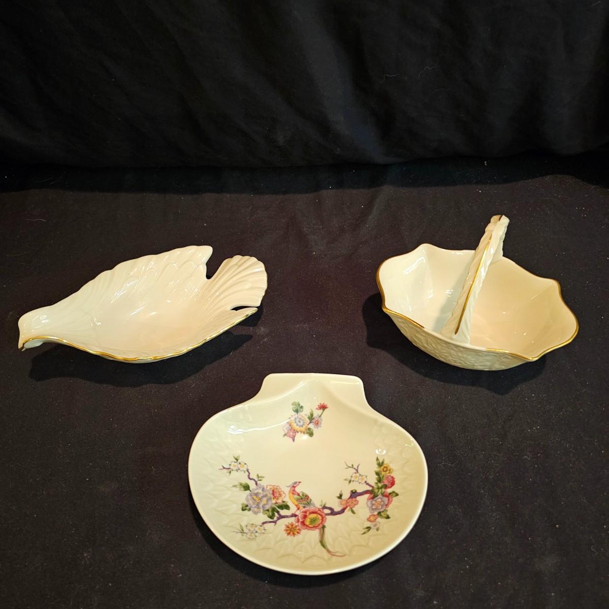 Two Lenox and one Limoges china pieces. Lenox handled basket has imprinted design on side, gold accents and measures 6" x 4.5" x 5"H. Lenox bird bowl is 8" x 4.75". Limoges shell bowl has floral pattern inside, measures 6" x 5.5". See photos for details. Shipping available.