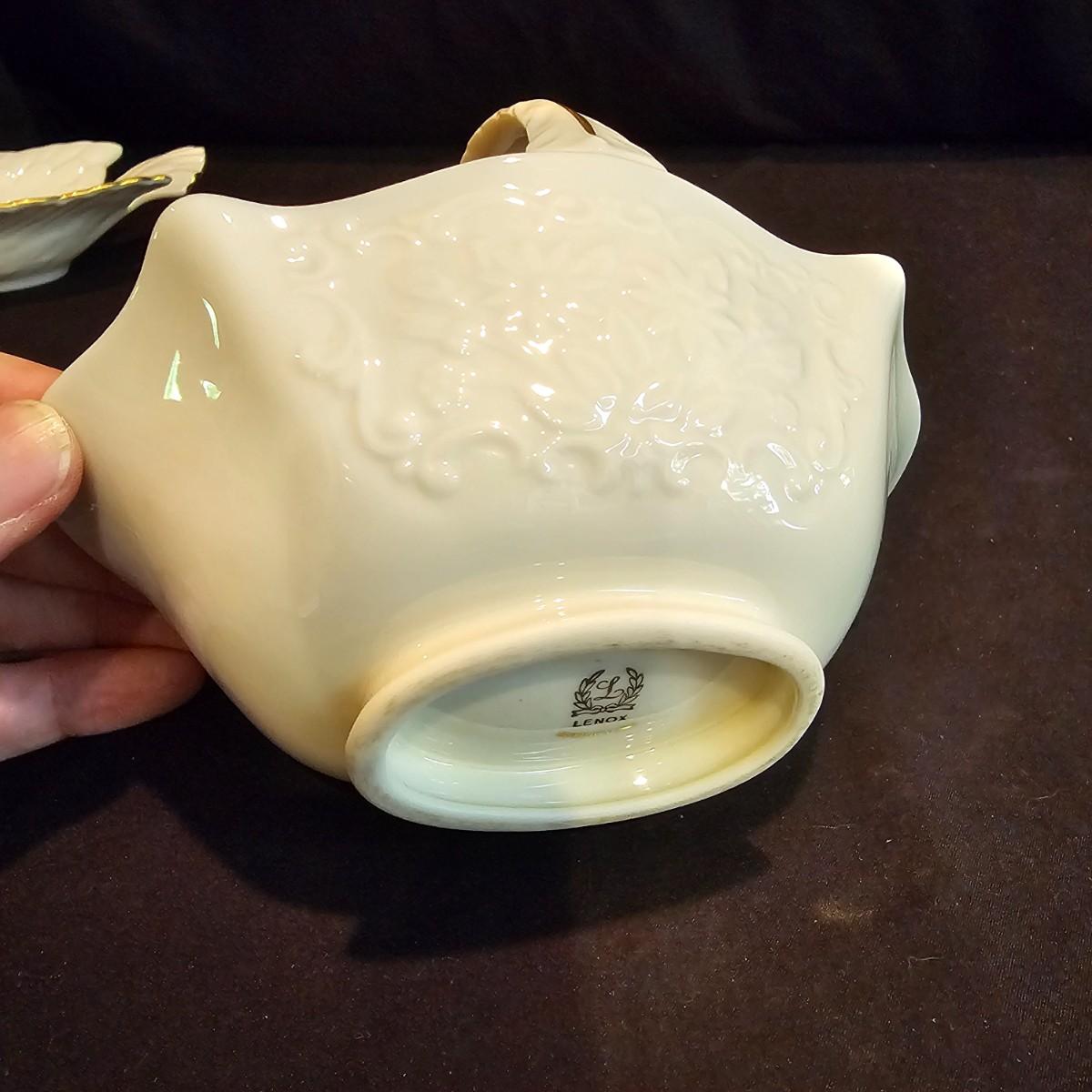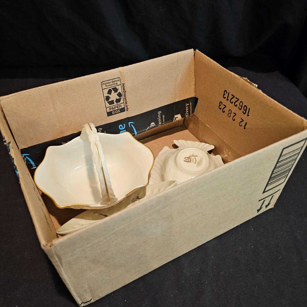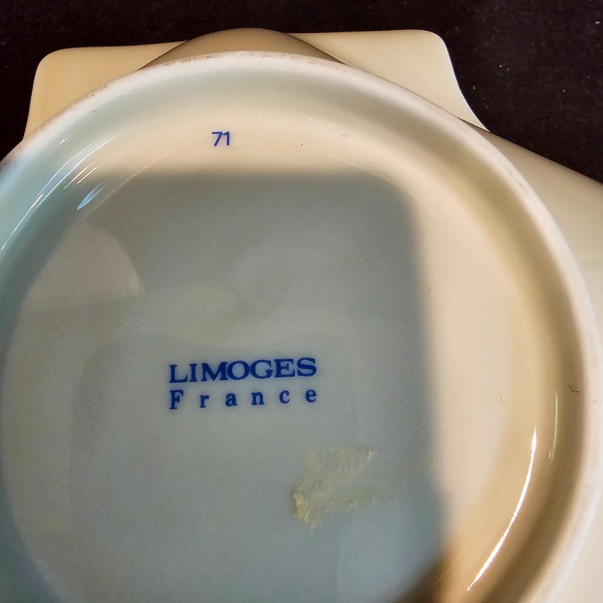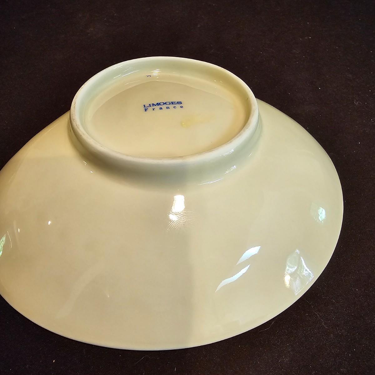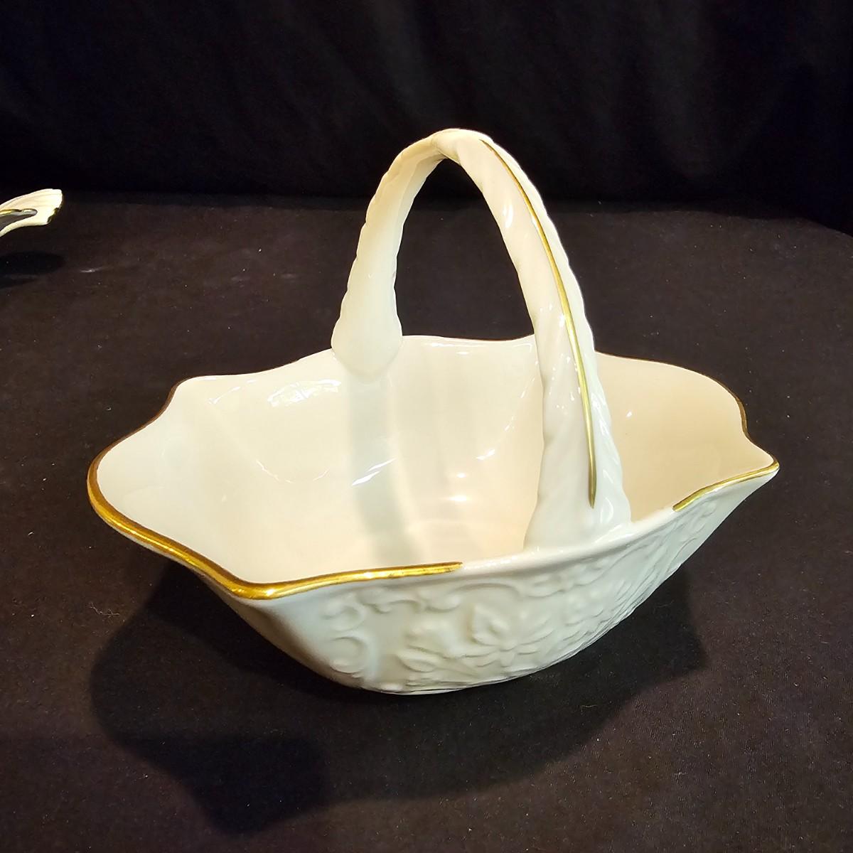 Two Lenox and one Limoges china pieces. Lenox handled basket has imprinted design on side, gold accents and measures 6" x 4.5" x 5"H. Lenox bird bowl is 8" x 4.75". Limoges shell bowl has floral pattern inside, measures 6" x 5.5". See photos for details. Shipping available.
