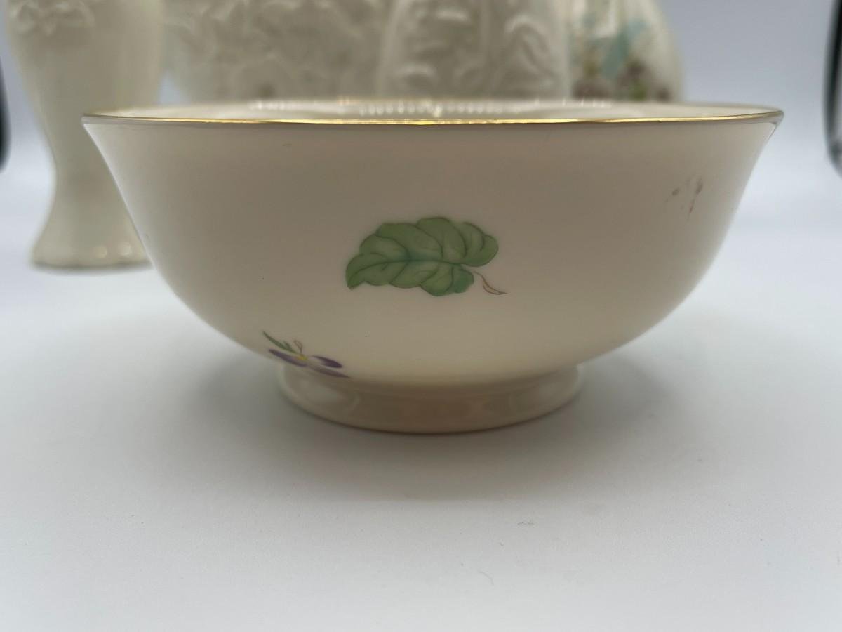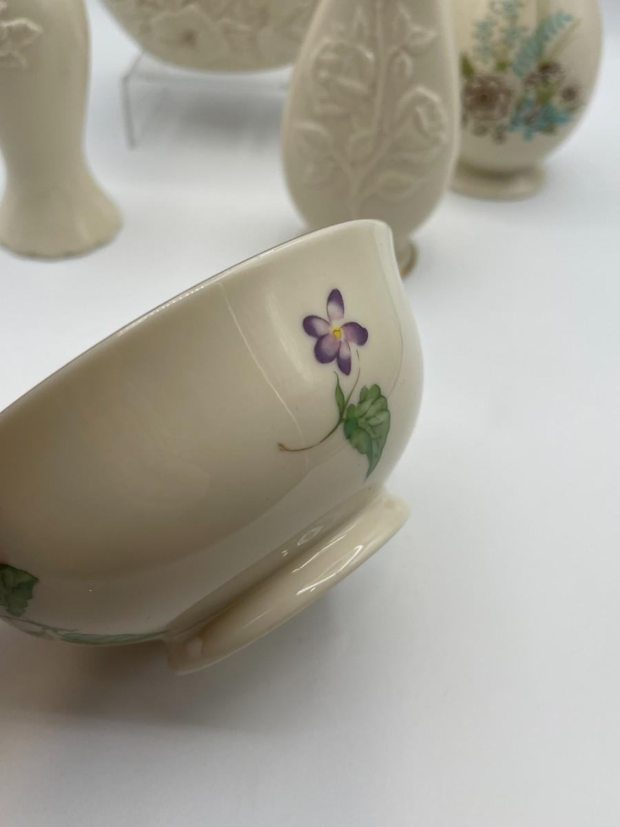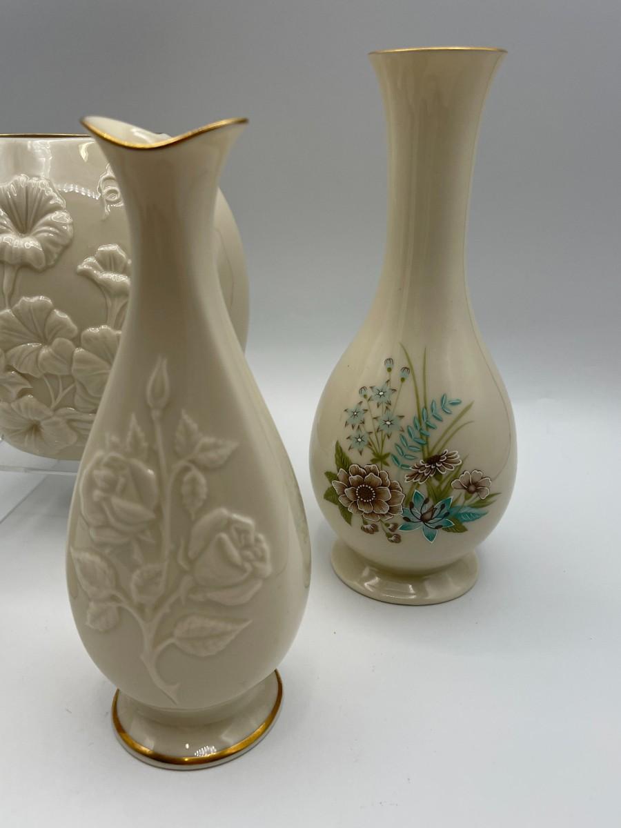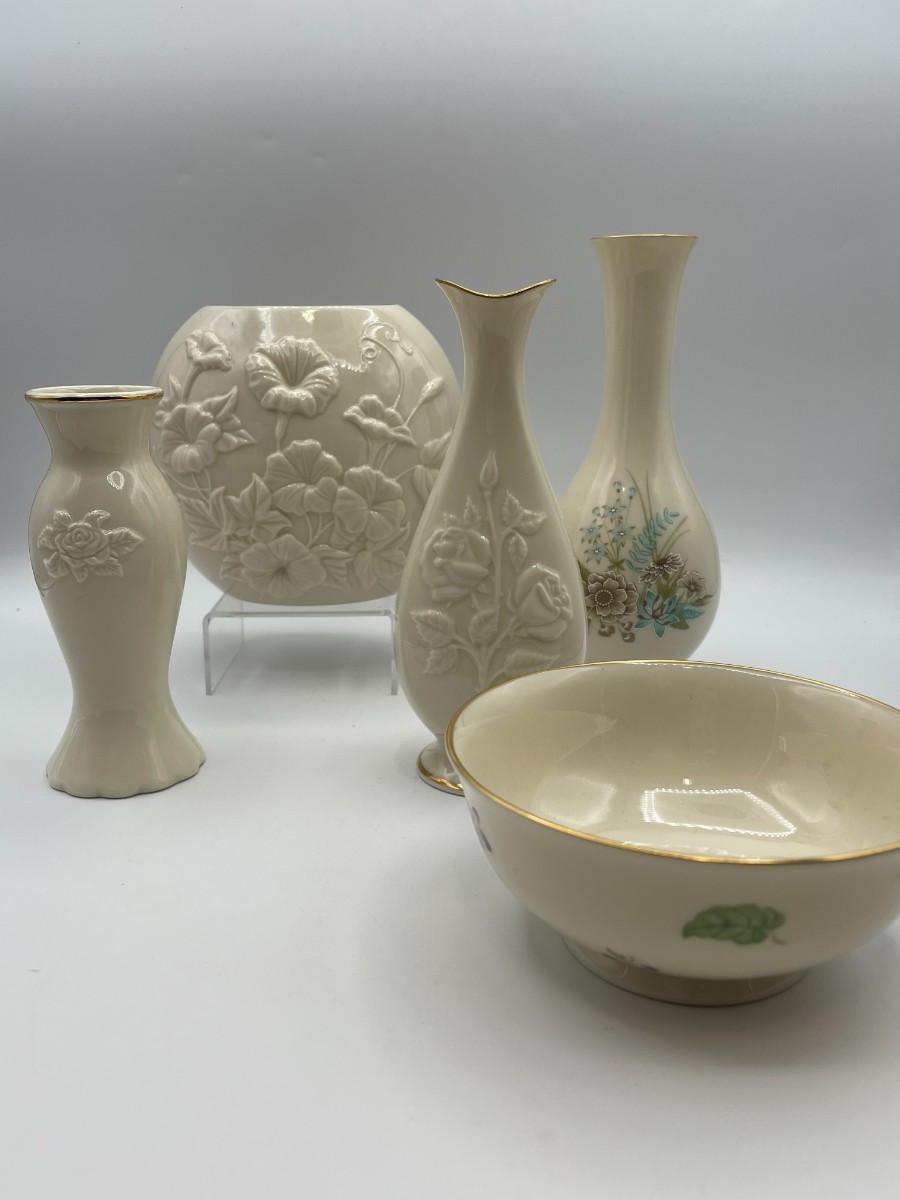 Attention Lenox lovers! Lot of five Lenox items: Four vases, one bowl. Includes Four Seasons Vase Collection, "Summer," featuring morning glories & a hummingbird, which is 6" H. Various sizes. Bowl: approx. 5.5" W at mouth -- Smallest vase: 6" H -- Taller vases: approx. 7" H # 789