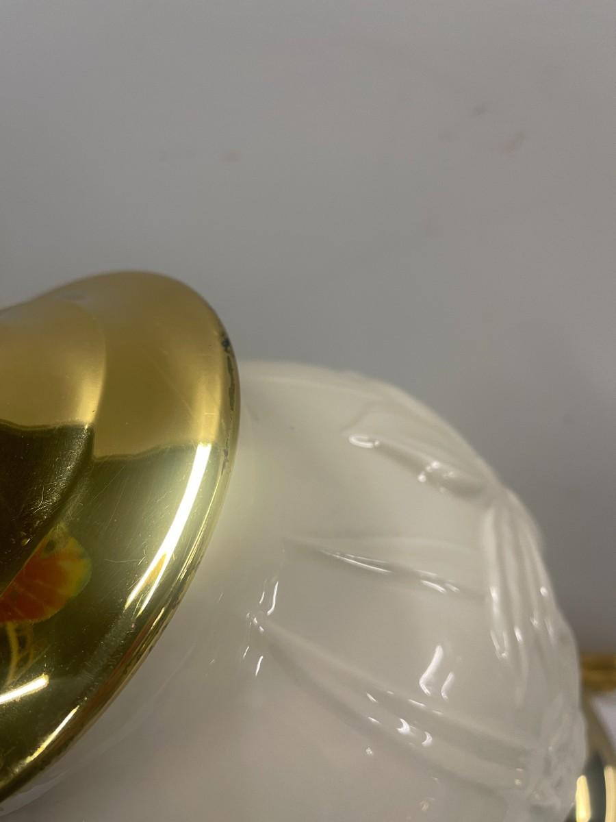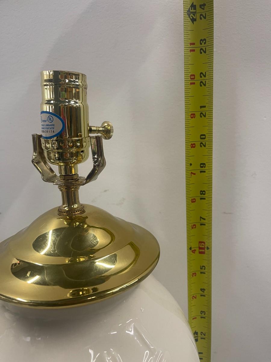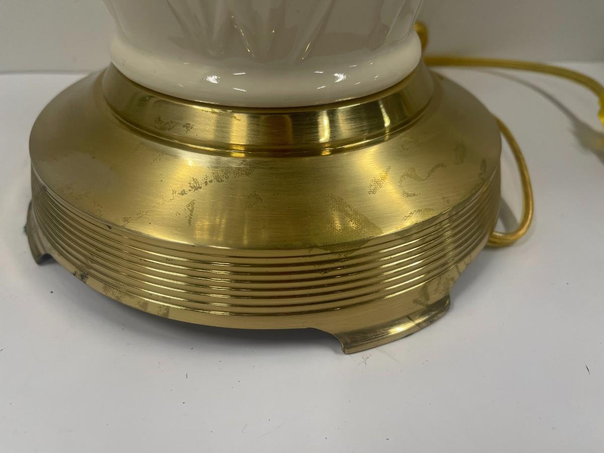 Illuminate your living space with the beautiful Lenox porcelain lamp! With its intricate floral design and ivory porcelain finish, this lamp brings sophistication and elegance to any room. Crafted from only the finest brass, it makes for a perfect centerpiece or accent piece that will add a touch of timeless class to your home. Plus, its durable construction ensures you'll have this stunning piece of art for years to come. Add a touch of grace to your living space today with the Lenox porcelain lamp!. The lamp has never been used but has some wear to the brass from being stored for so long. 22" high. Lamp does not come with harp, finial or shade. # 1193