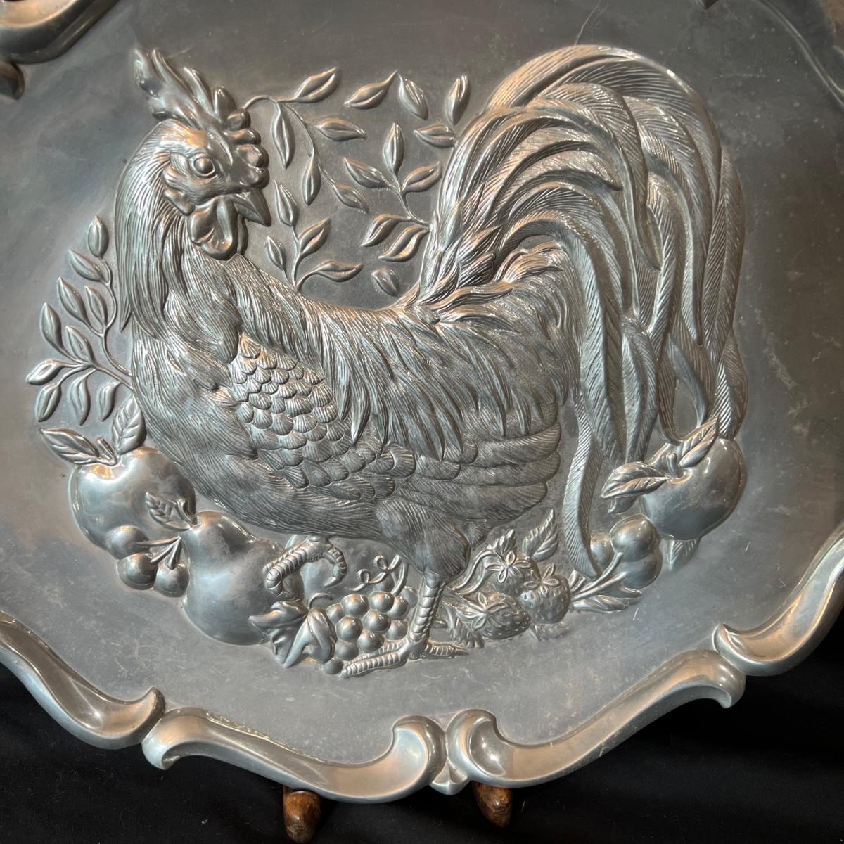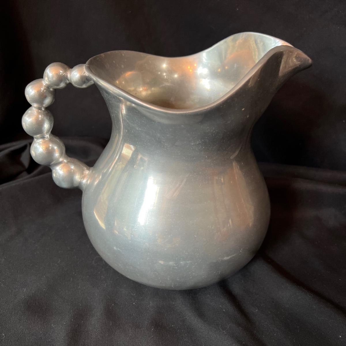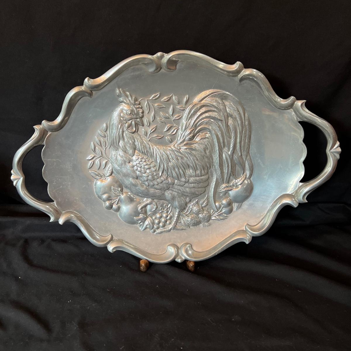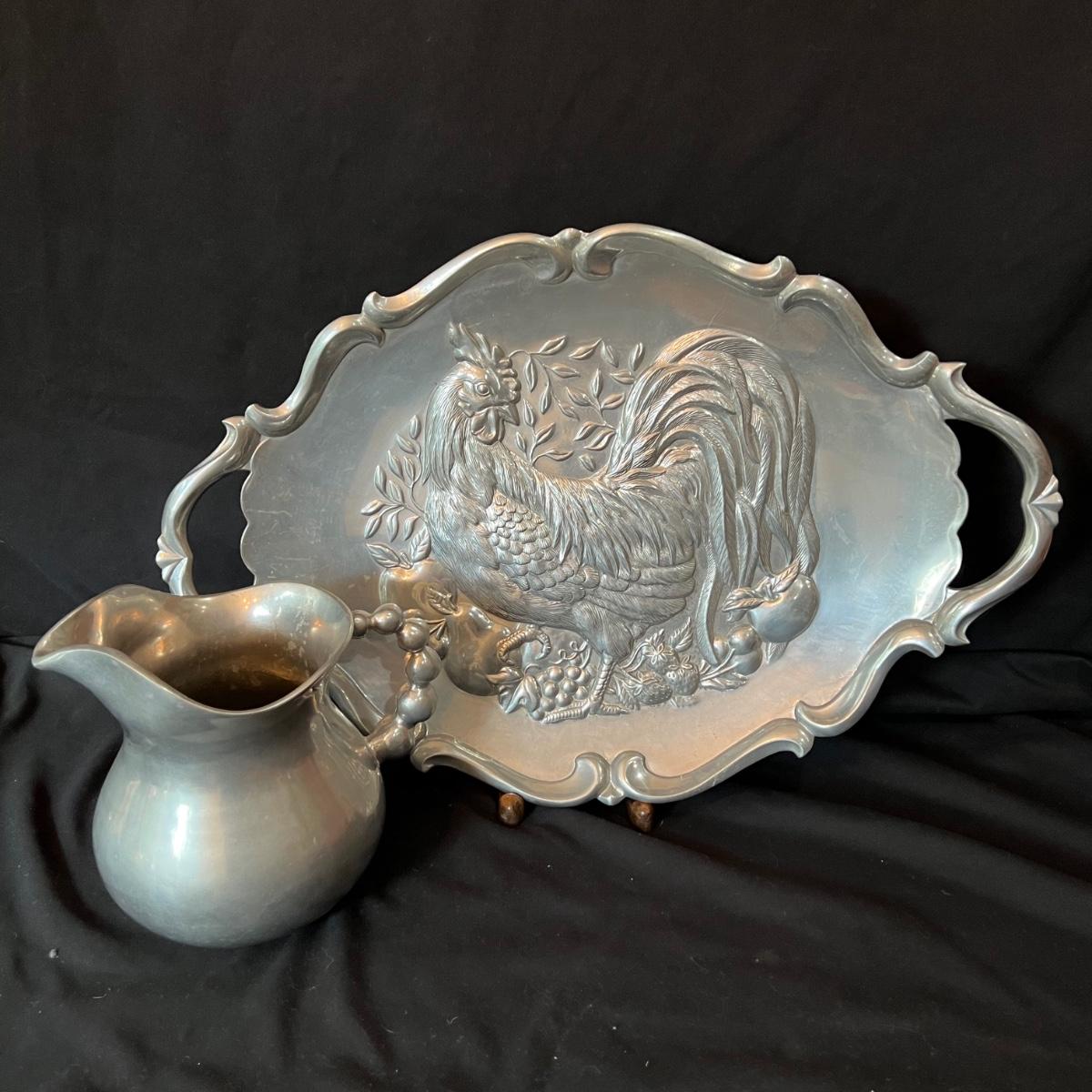 The pewter pitcher is 9” x 5.5” x 8.5”H. The handle is a melded balls moving from large to smaller at the top. The oval silver cast rooster platter is 23.5” x 4” x 15.5H".