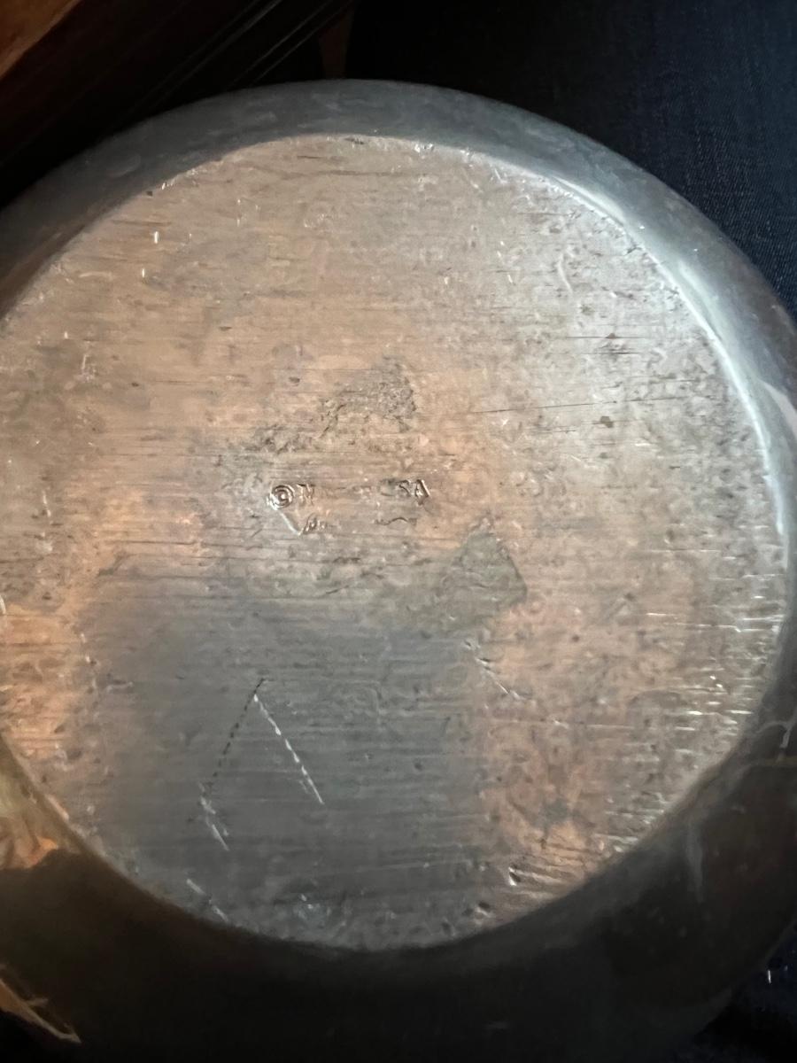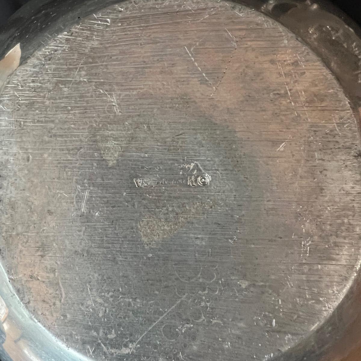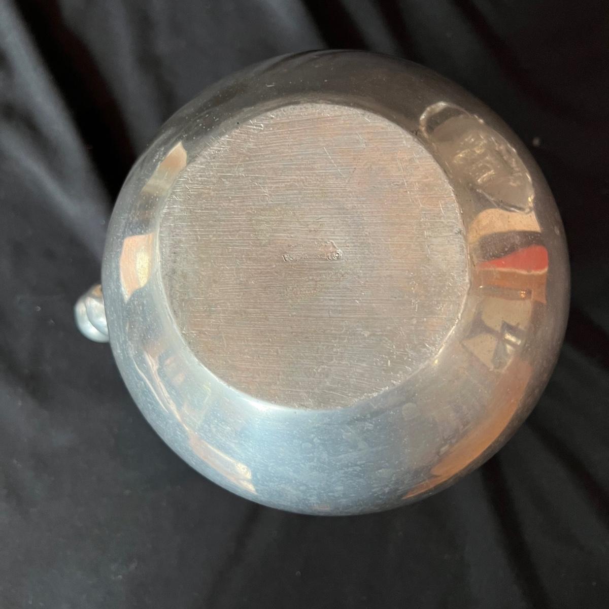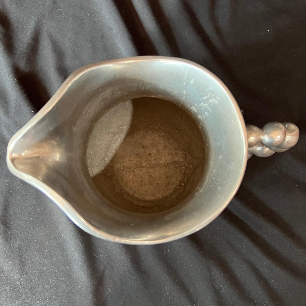 The pewter pitcher is 9” x 5.5” x 8.5”H. The handle is a melded balls moving from large to smaller at the top. The oval silver cast rooster platter is 23.5” x 4” x 15.5H".