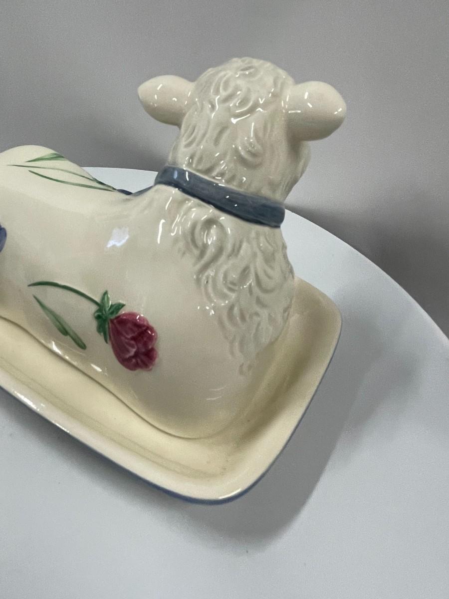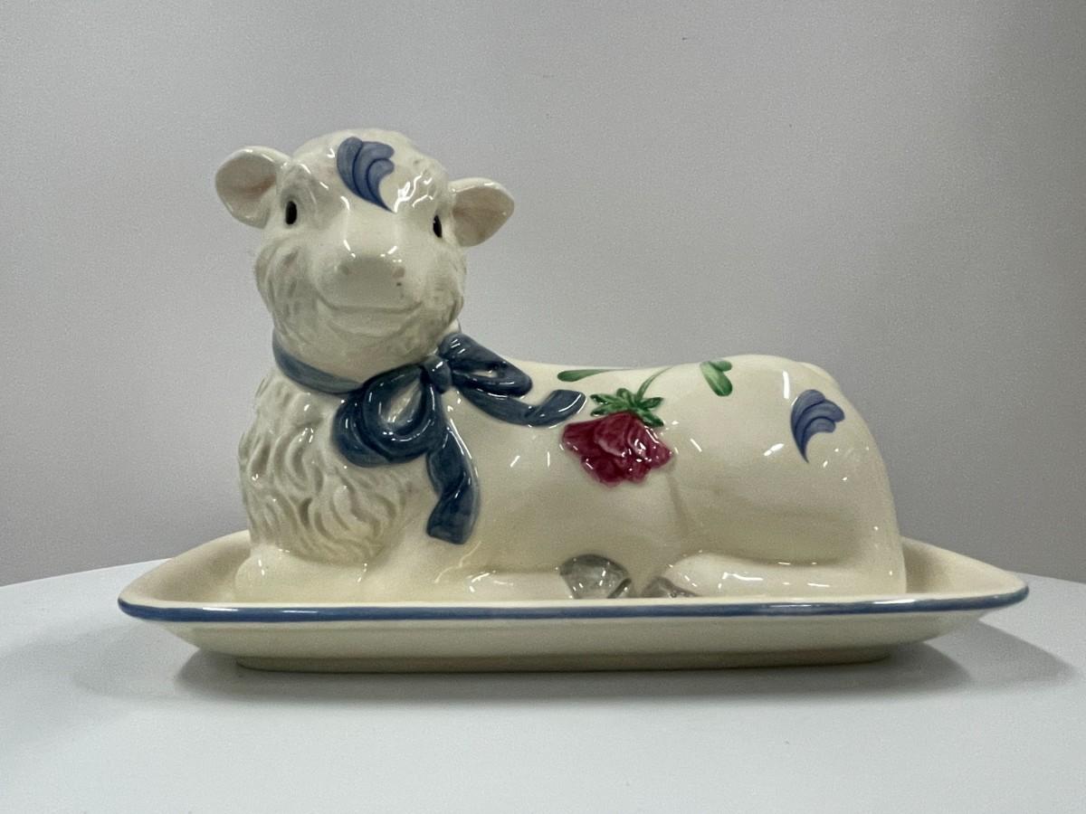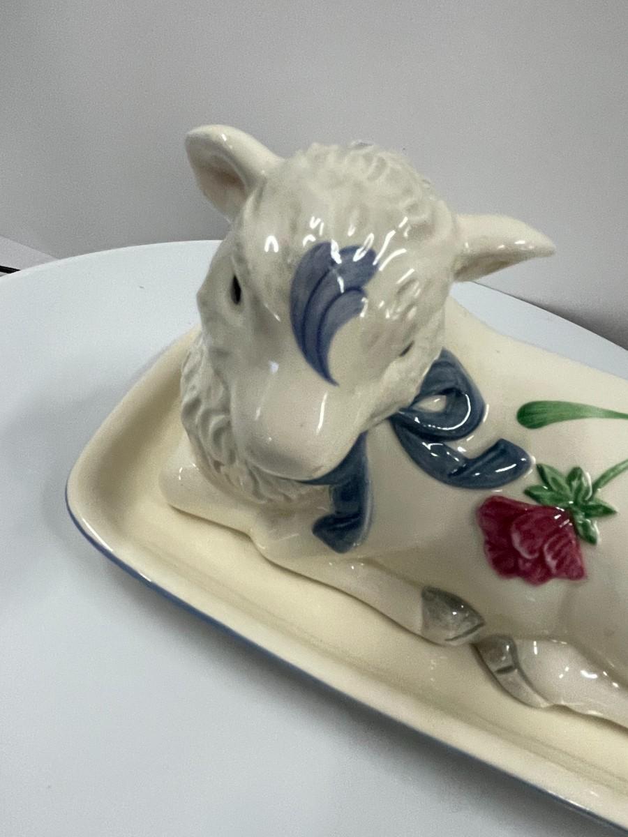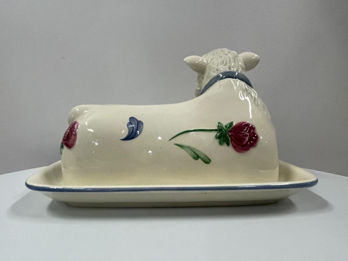 Lenox Poppies on Blue Barnyard Collection lamb butter dish. Excellent, like new condition. 7" x 4" x 4 1/2" tall. Comes with original box but box shows wear and has some staining. # 1282