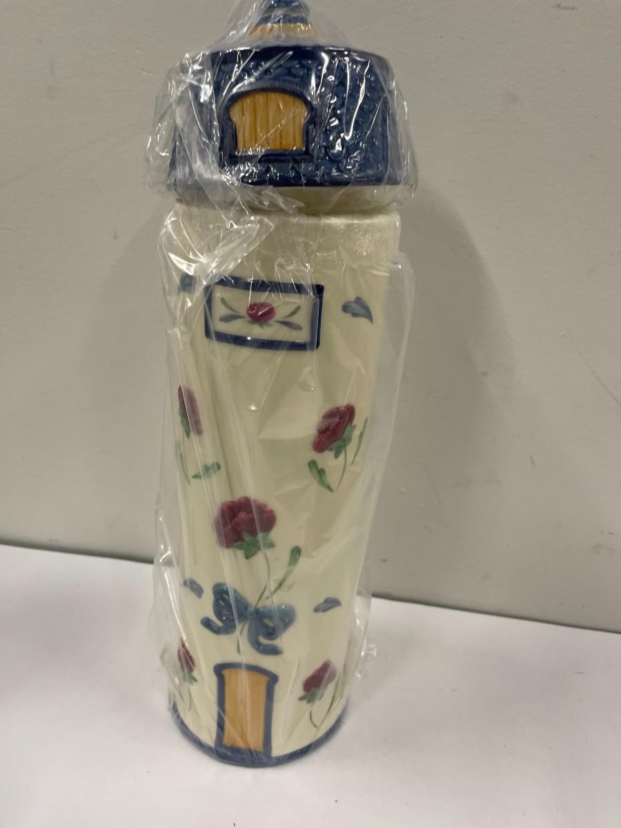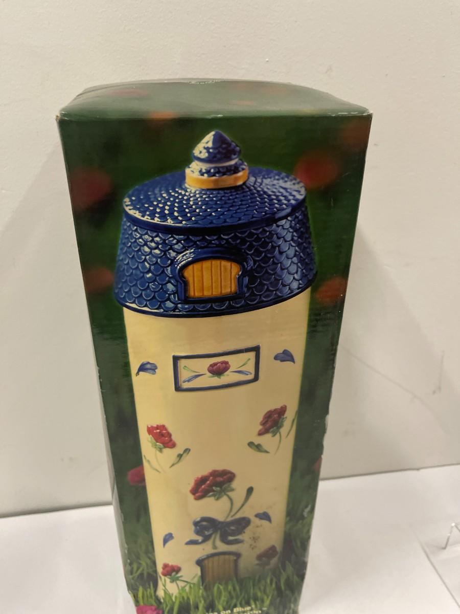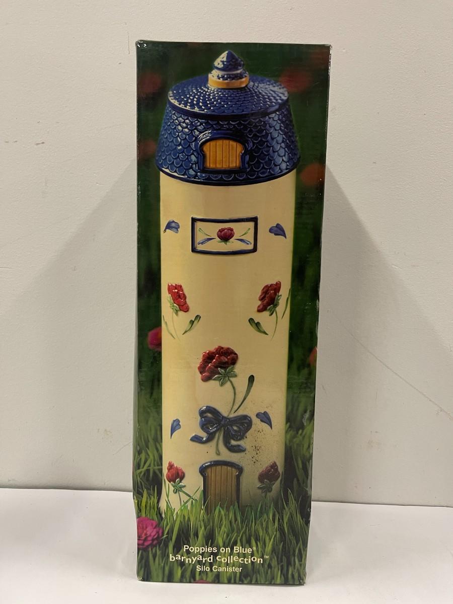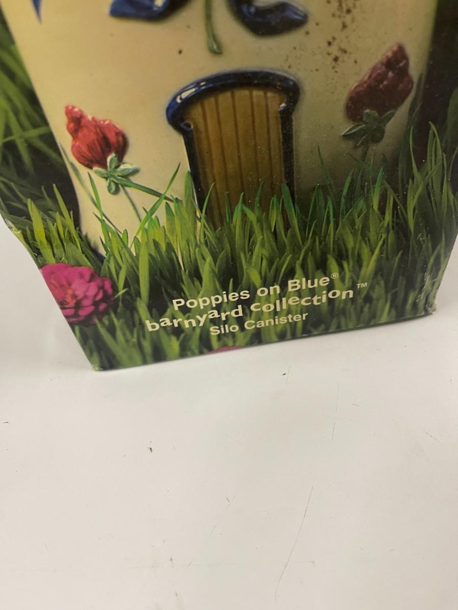 Lenox Poppies on Blue Barnyard Collection Silo Canister 15 1/2". Box has been opened and is damaged but canister is unused.