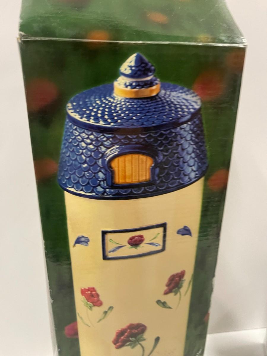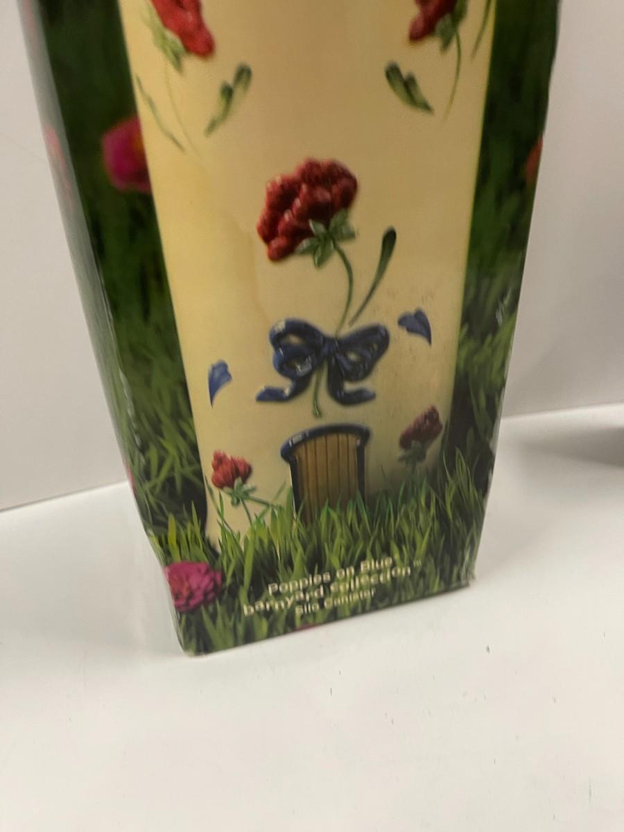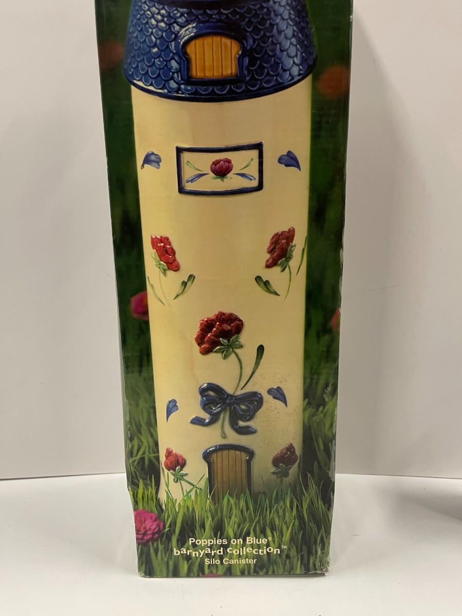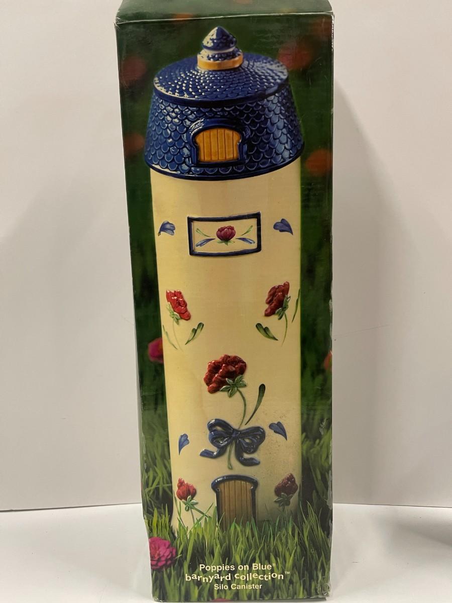 Lenox Poppies on Blue Barnyard Collection Silo Canister, new in box. Box shows wear. Approx 17" high.