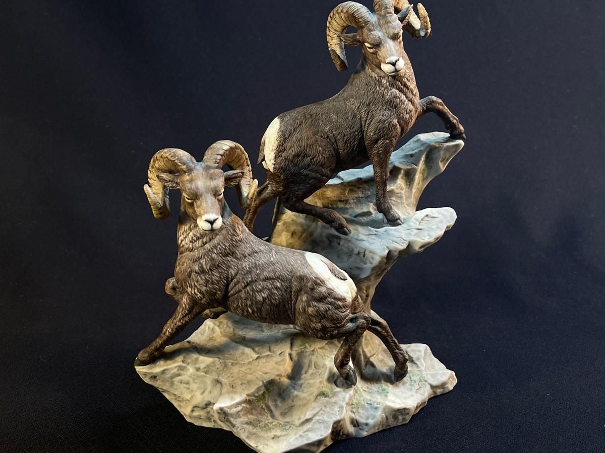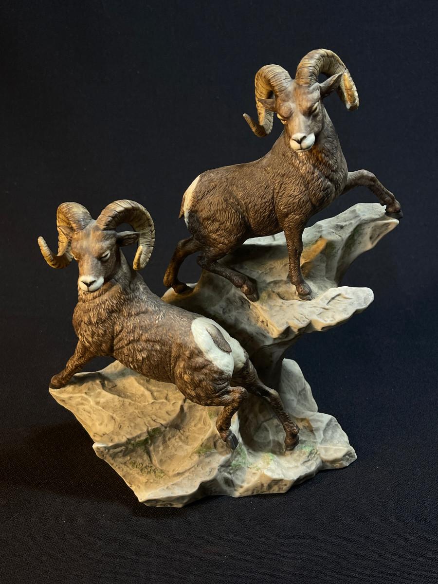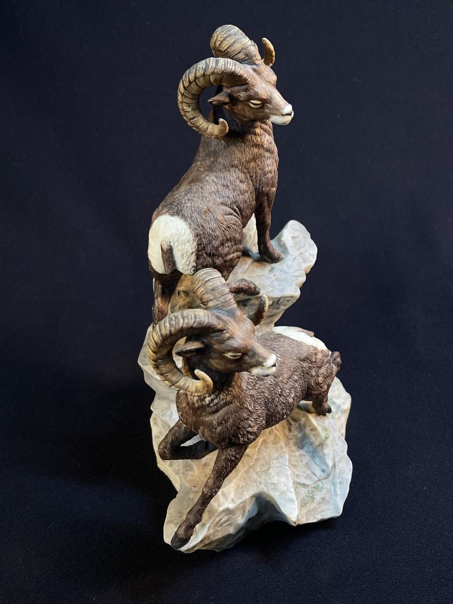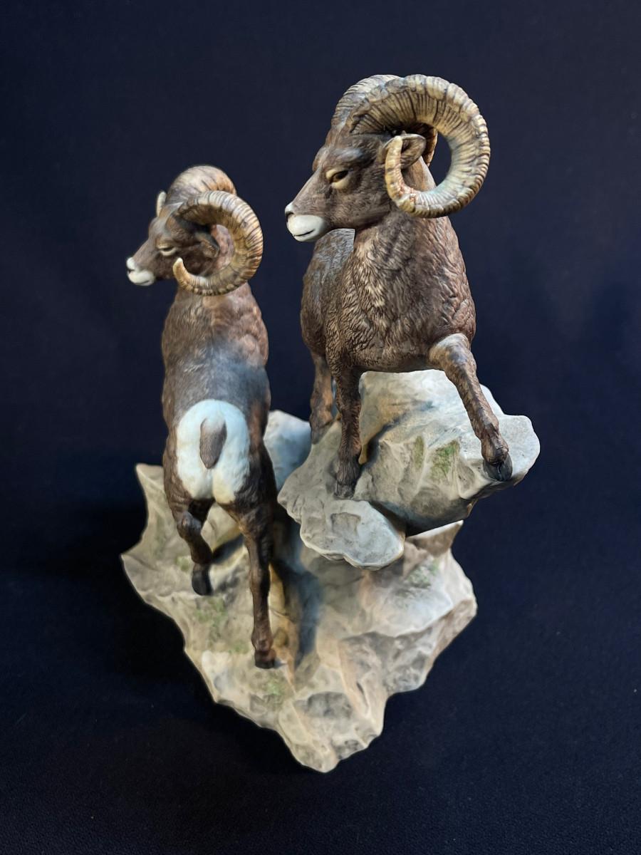 2 Bighorn Sheep posed on rocky incline in fine porcelain.