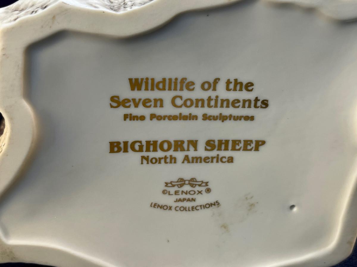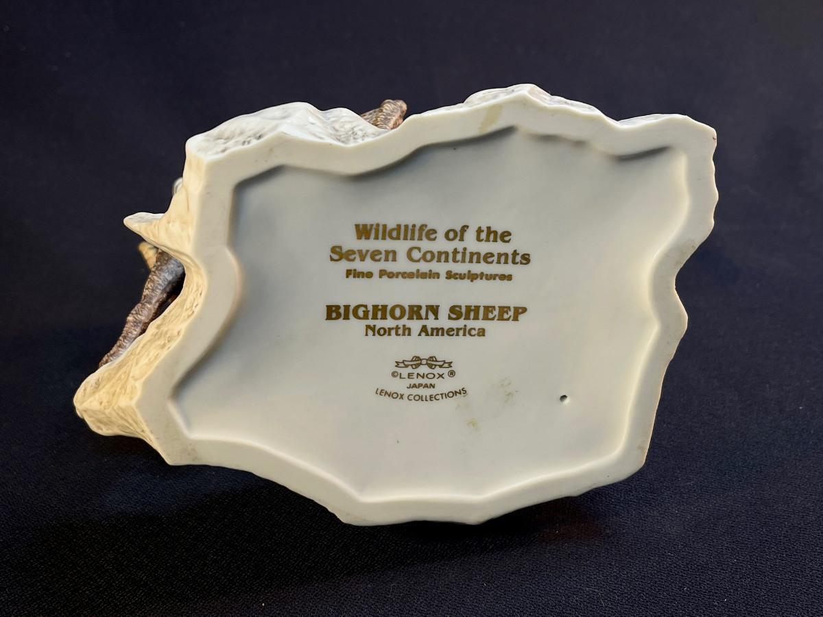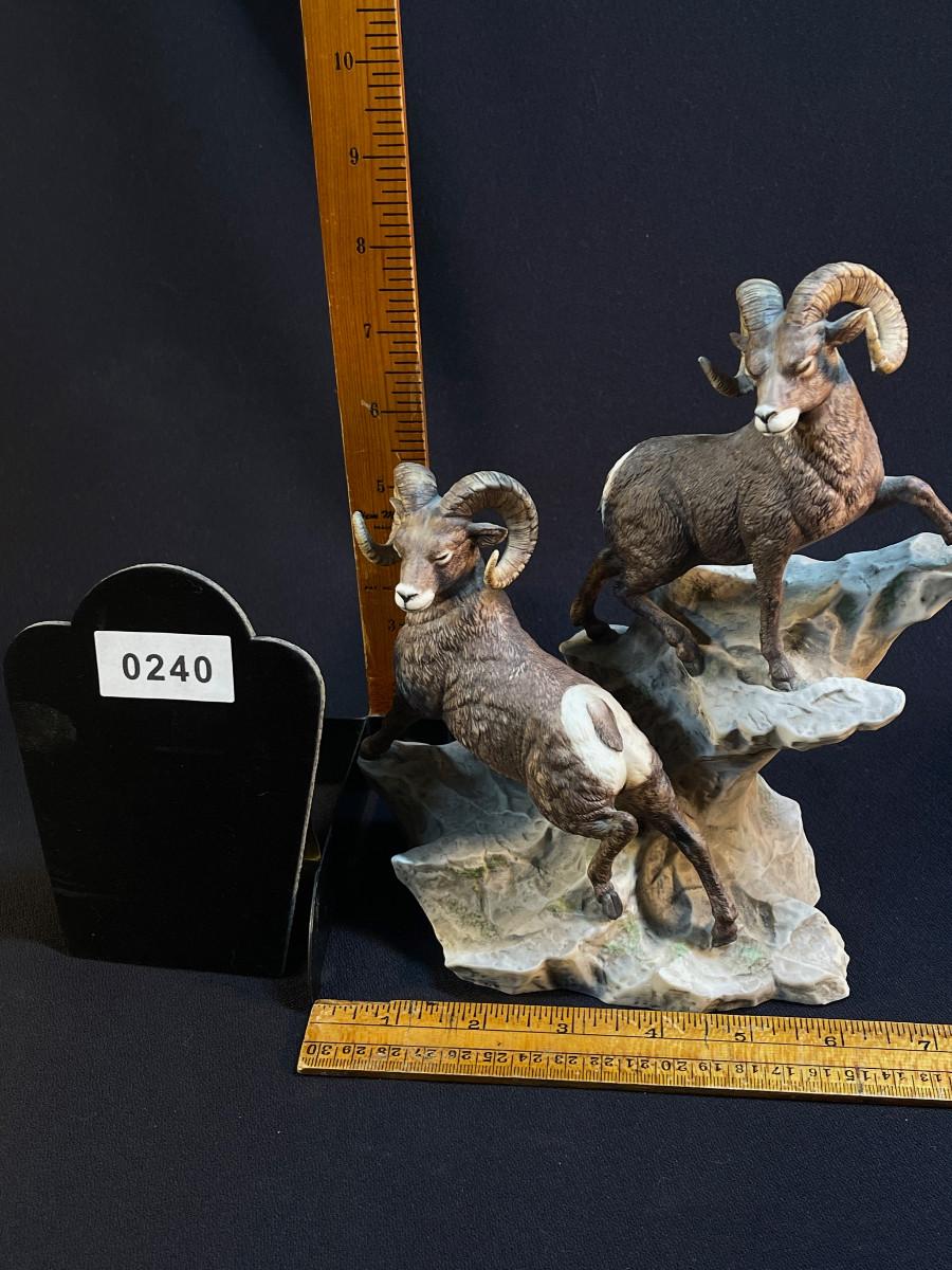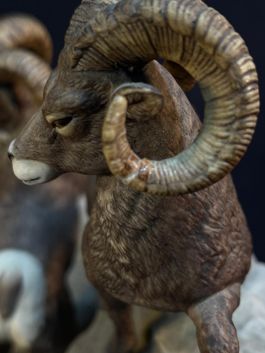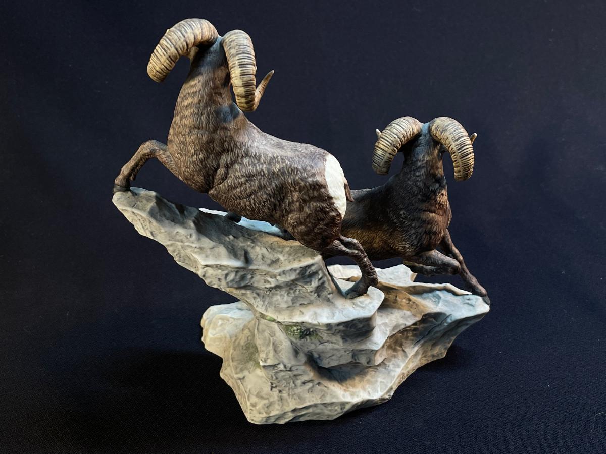 2 Bighorn Sheep posed on rocky incline in fine porcelain.