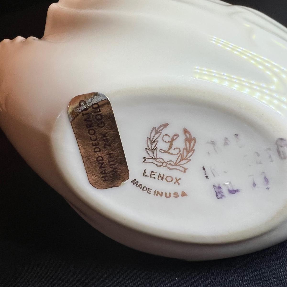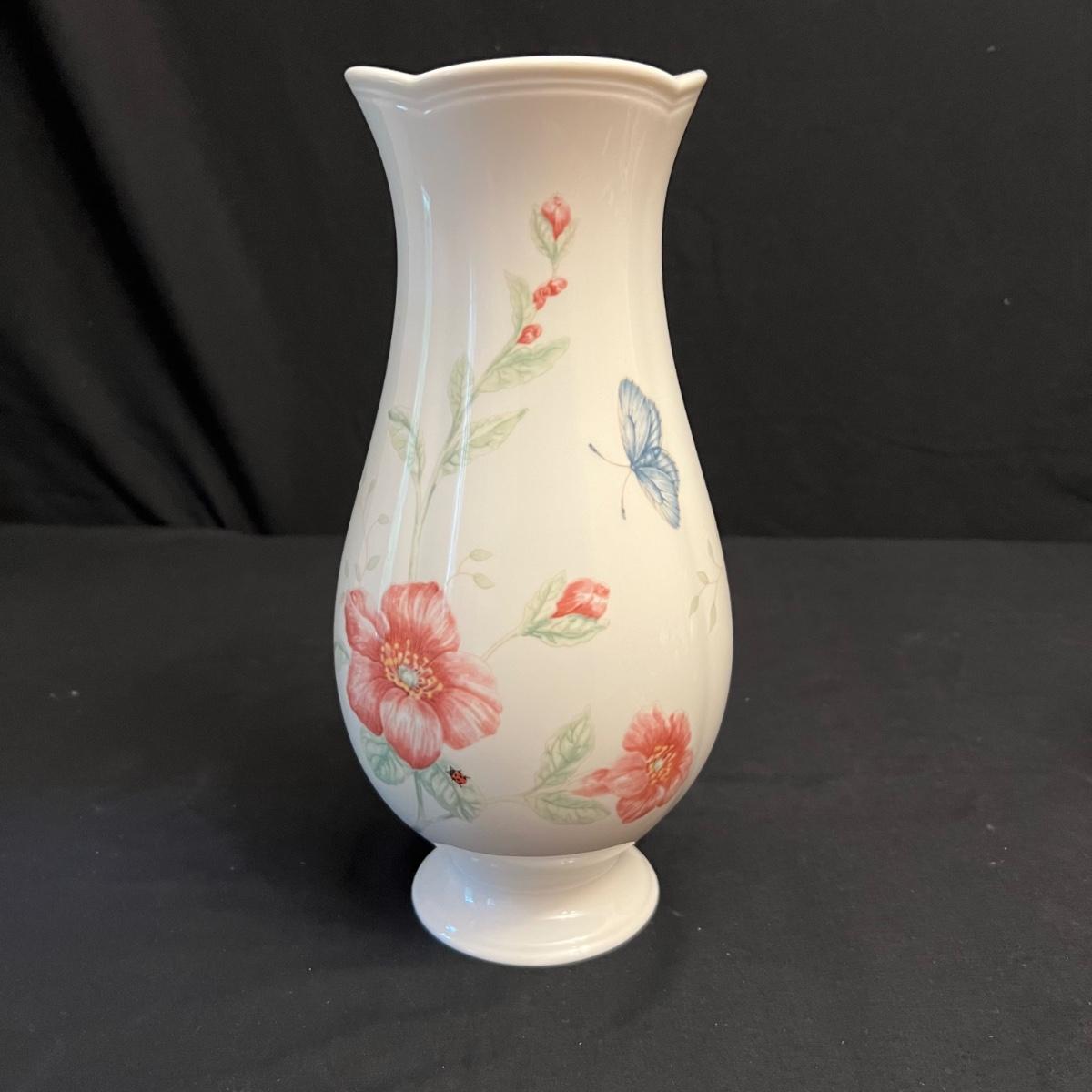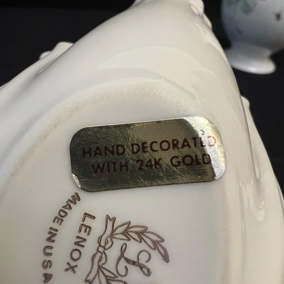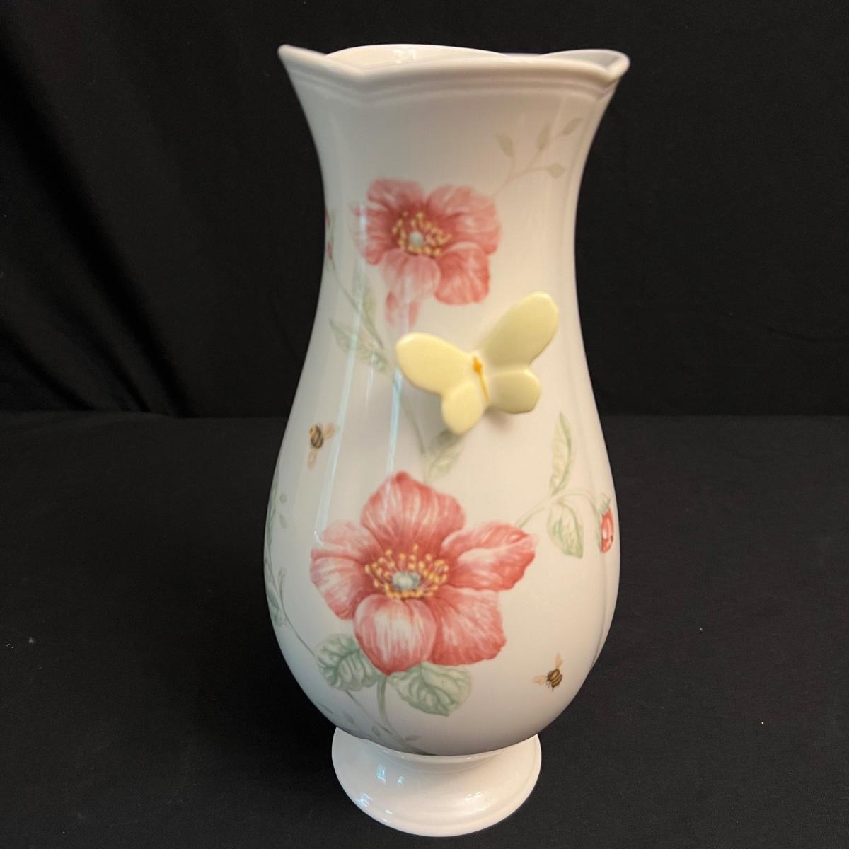 These four Lenox items includes three similarly glazed pieces - a swan with 24K gold embellishments, a small vase, and a larger vase. The ‘Butterfly Meadow’ vase with pink flowers and a pale yellow butterfly measures 3.5”D x 10.5”H.