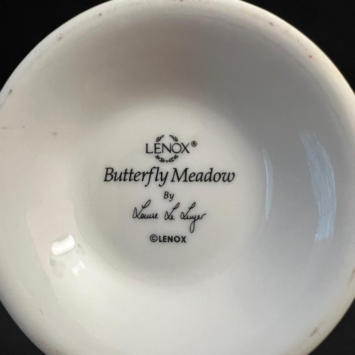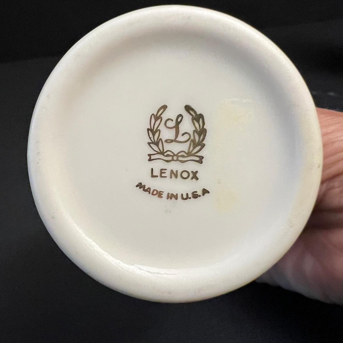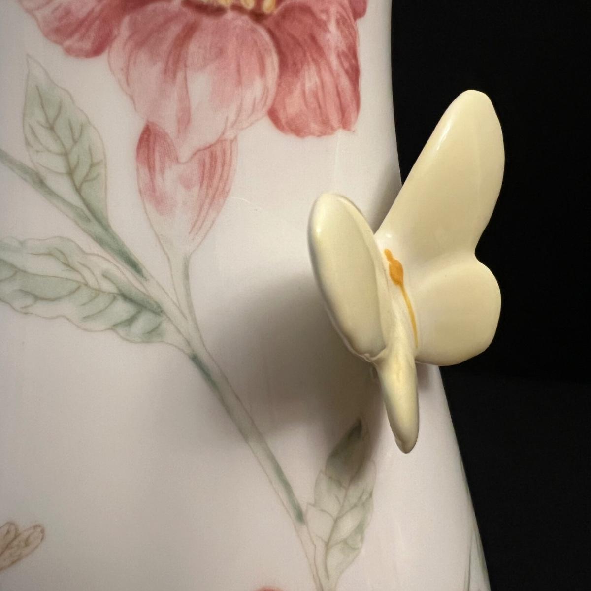 These four Lenox items includes three similarly glazed pieces - a swan with 24K gold embellishments, a small vase, and a larger vase. The ‘Butterfly Meadow’ vase with pink flowers and a pale yellow butterfly measures 3.5”D x 10.5”H.