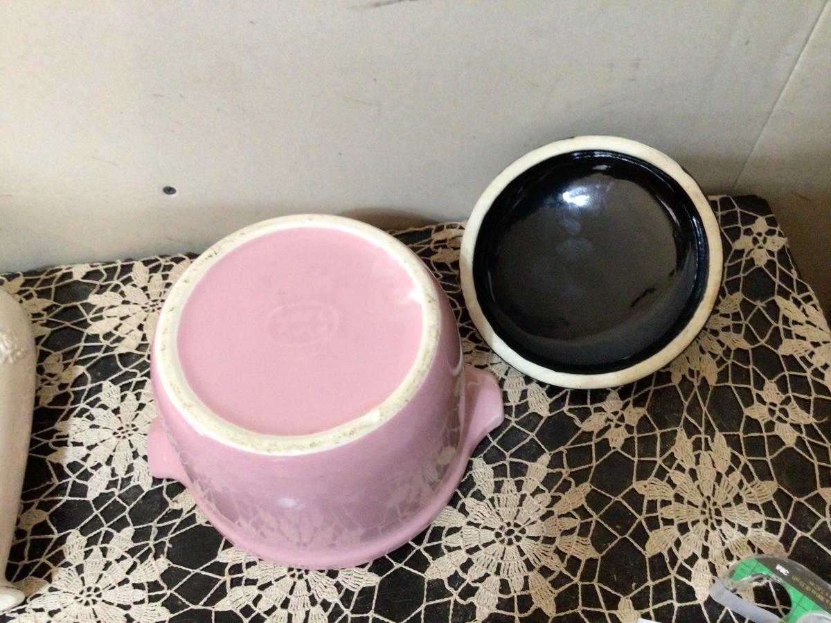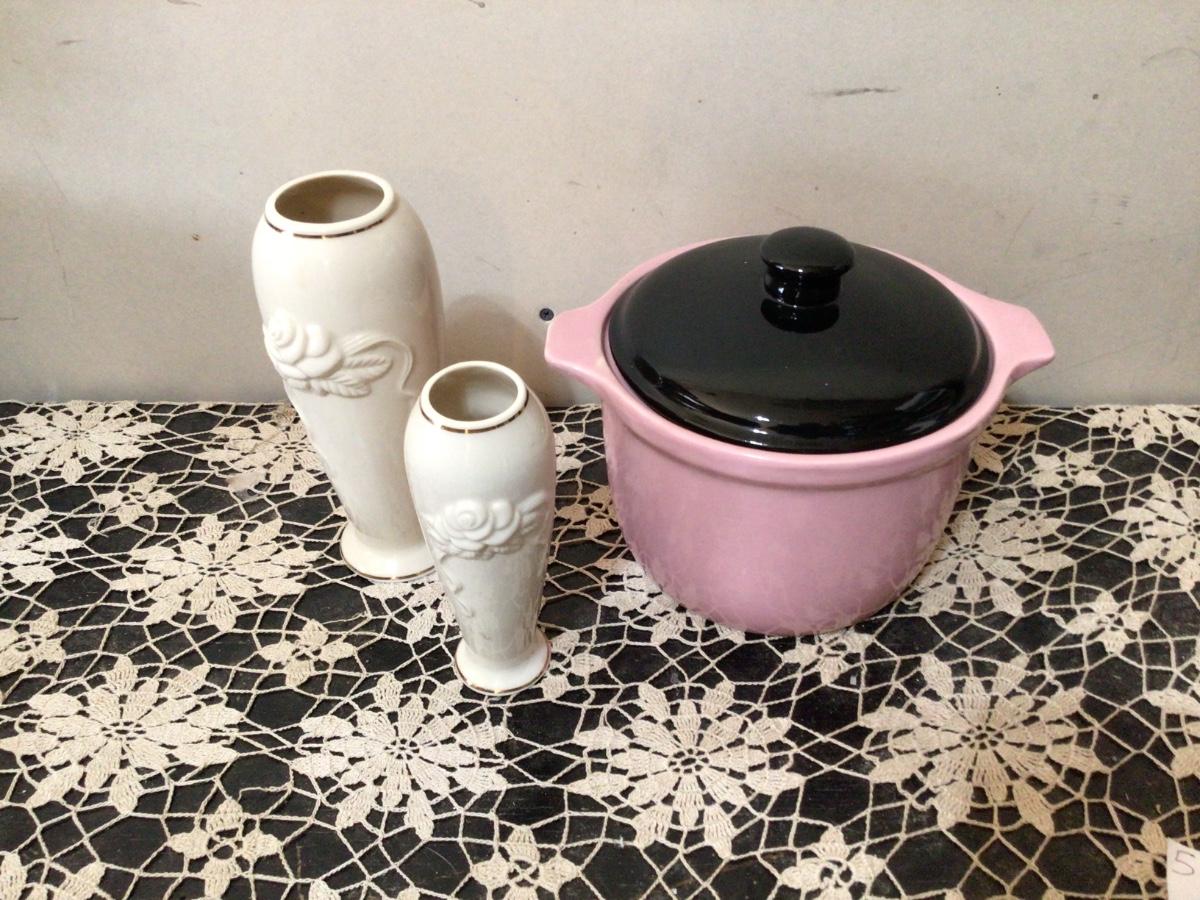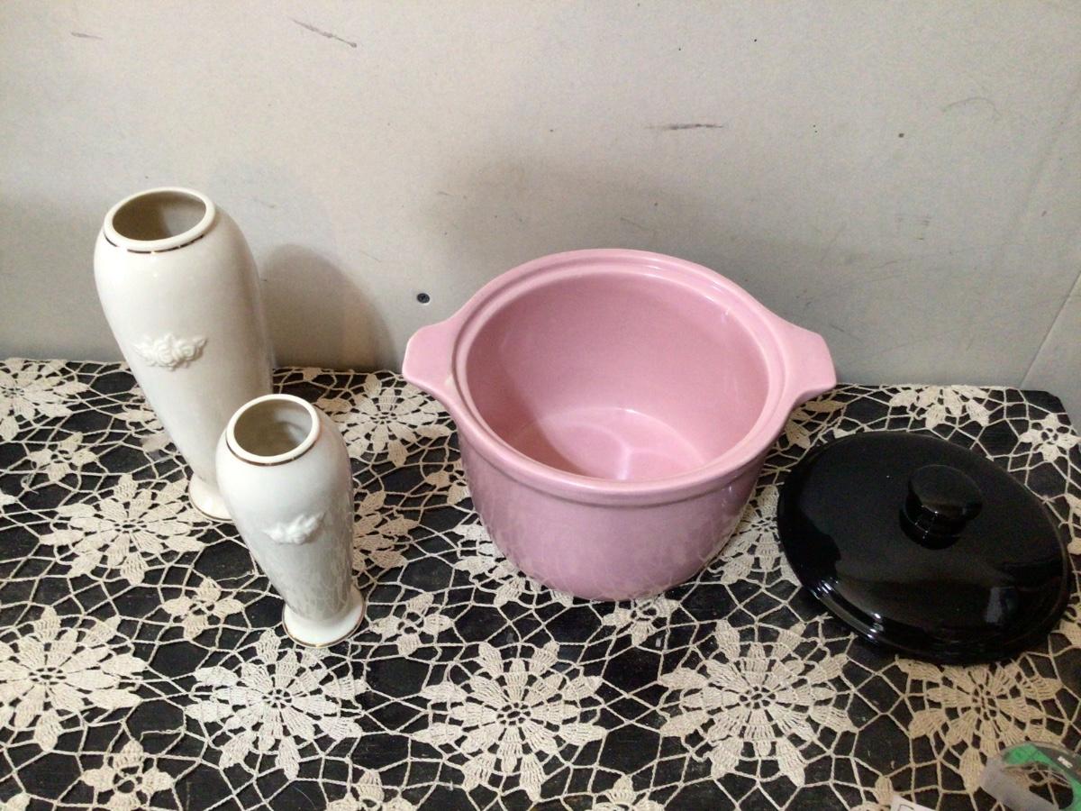 You get large and small Lenox white and gold flower vases. You get a nice pink and black casserole covered dish. The casserole has been damaged and repaired very nicely. See pic.