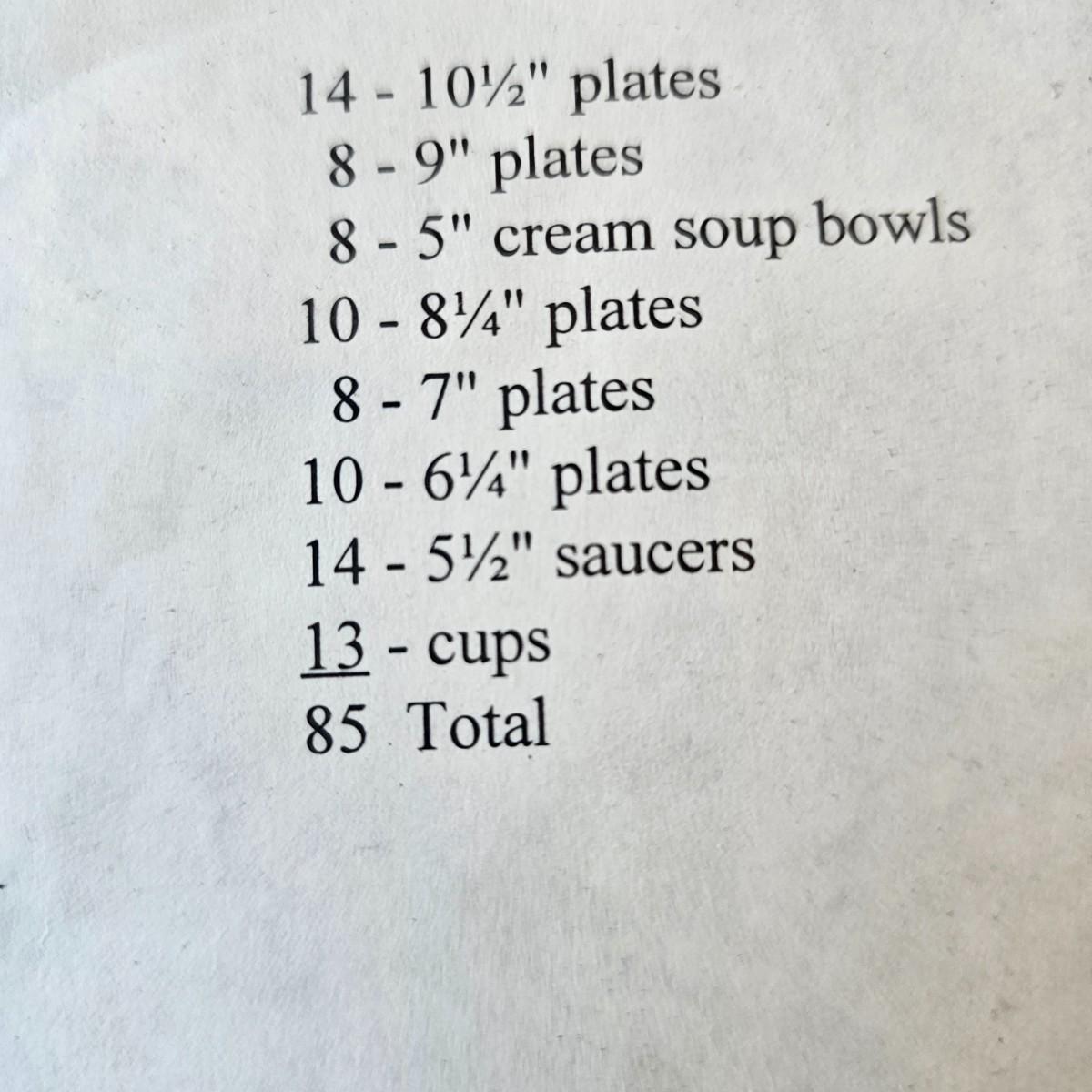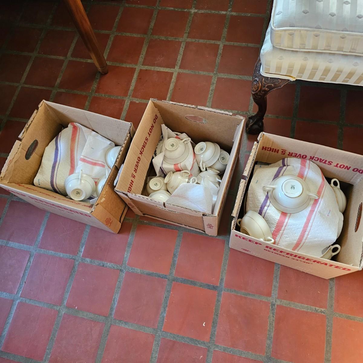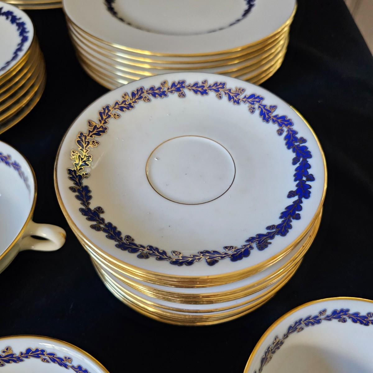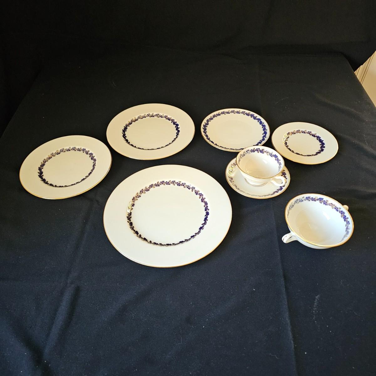 85 pieces of Lenox fine China in the Shenandoah Cobalt Blue pattern. Oak leaves and acorns in cobalt blue are surrounded by gold outlines as well as the rims on the China itself. Lenox crest stamped on bottom of pieces. Also includes a detailed list of items, sizes and count number. See photos for details. Local pickup only.