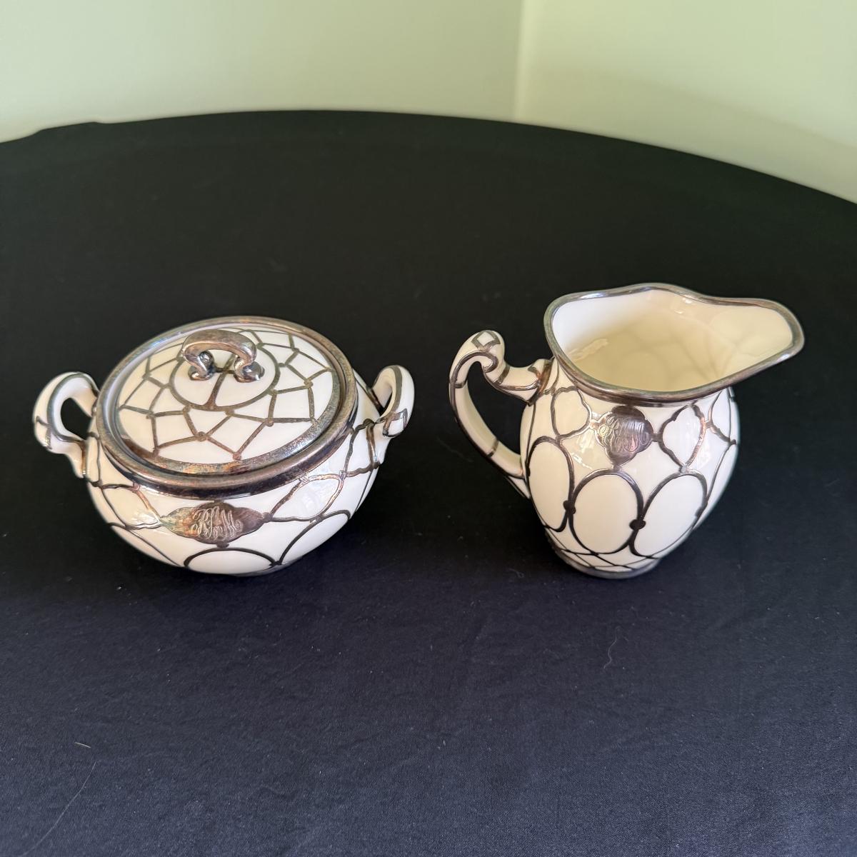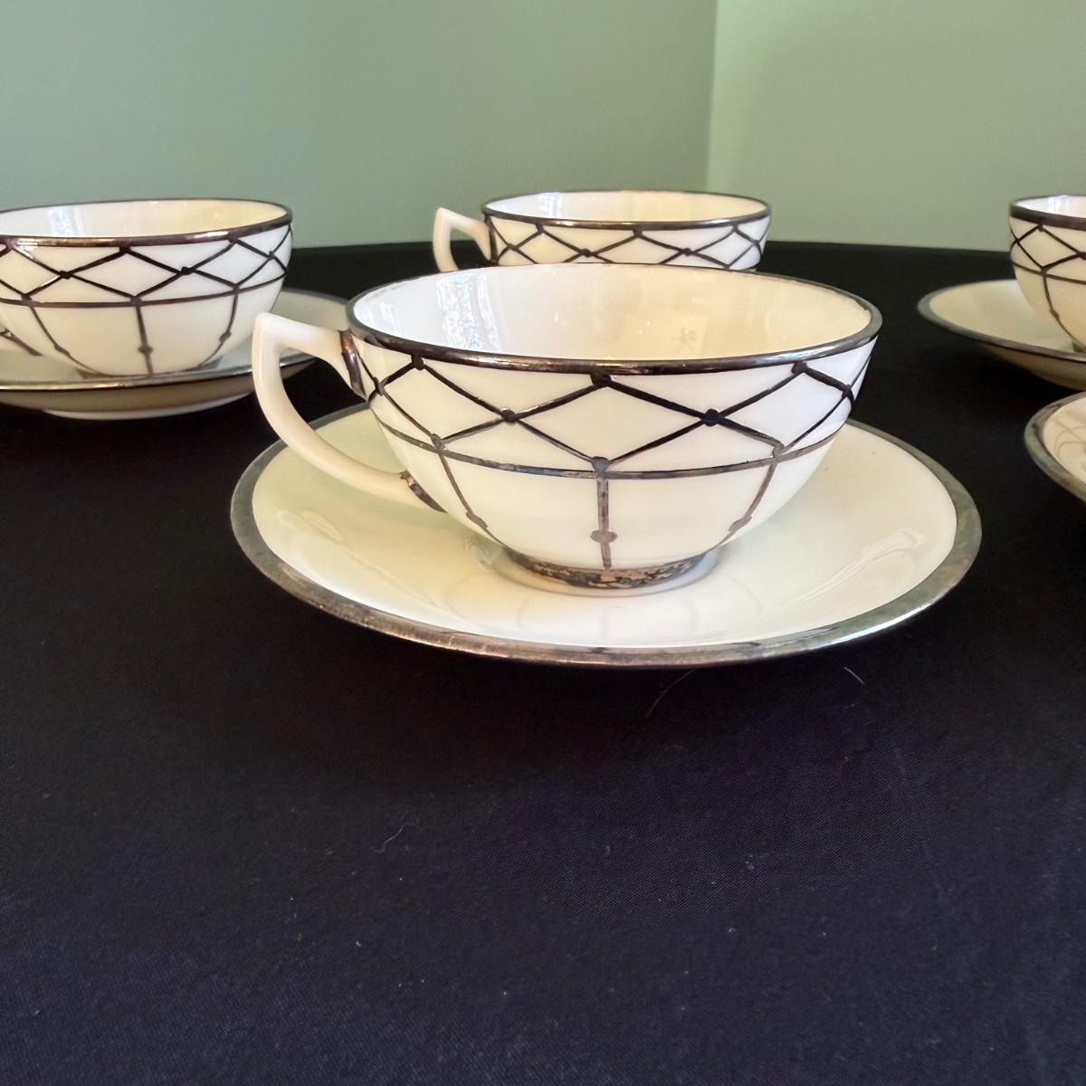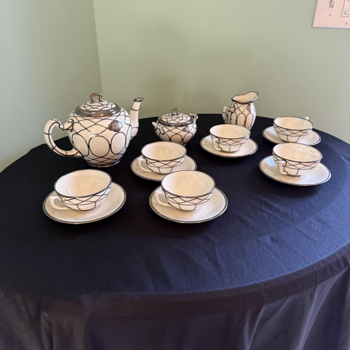 This lot contains a gorgeous ornate Lenox tea set with what appears to be a silver plated overlay. This tea set includes a tea pot, creamer, sugar bowl with lid, and six tea cups and saucers. The teapot, creamer and sugar bowl all have small monograms on them, see pictures for details. The teapot has a ceramic interior infuser and the inside of the lip has been chipped, see pictures for details. It measures 9” x 4” x 4.75”H. The saucers measure 5.25”D and the teacups measures and the cup measure 3.5”D x 1.75”H. Included is a picture of receipt when the set was originally purchased. Shipping available.