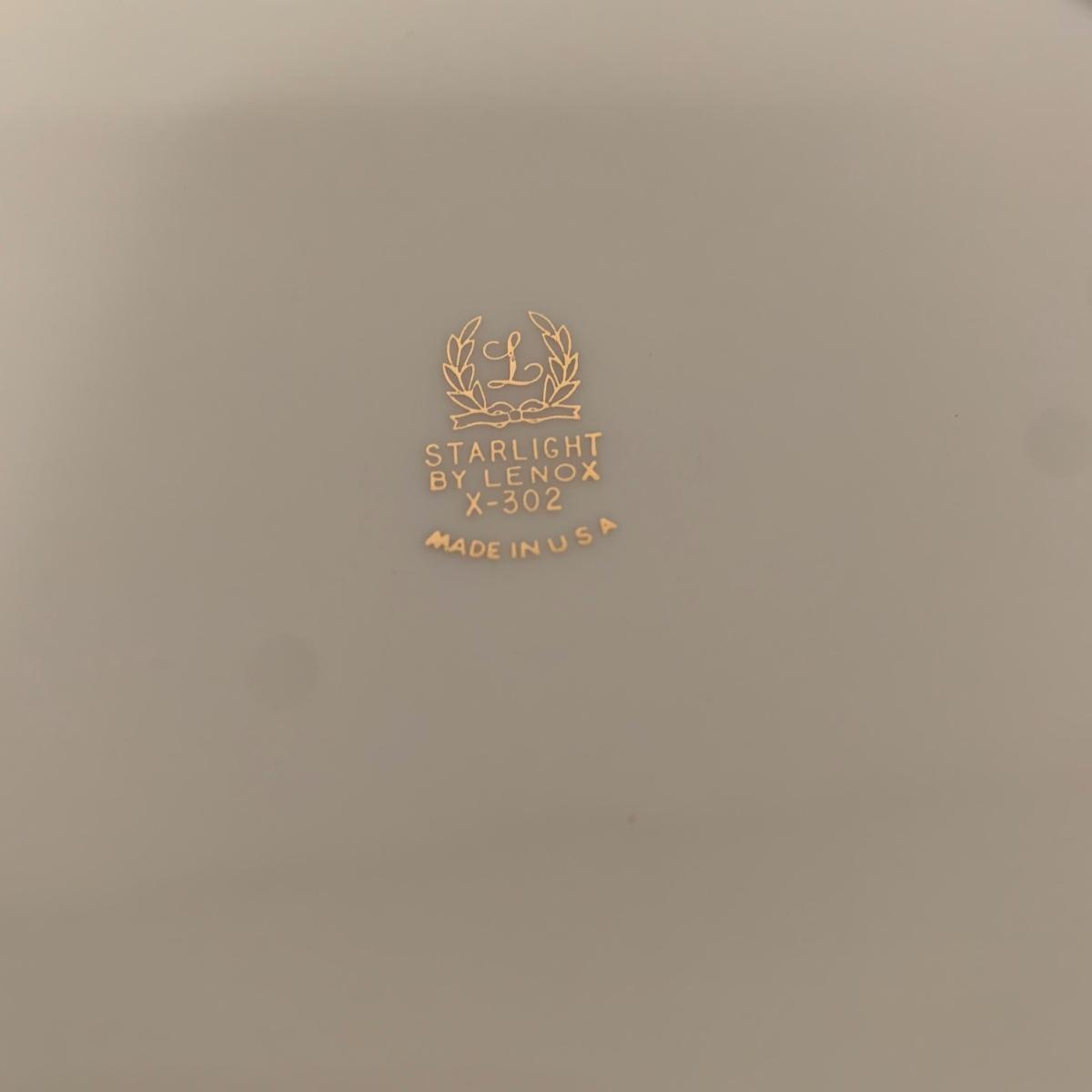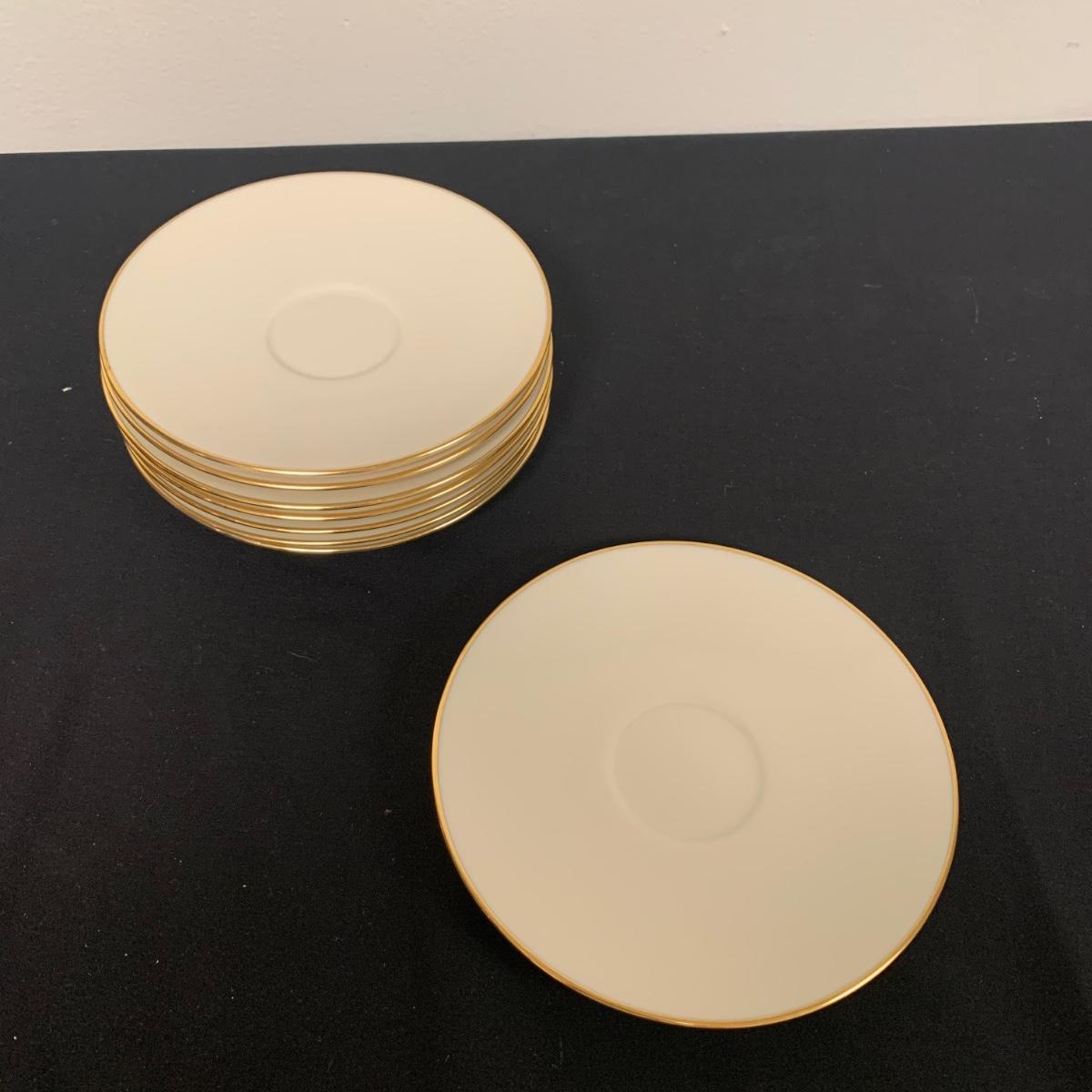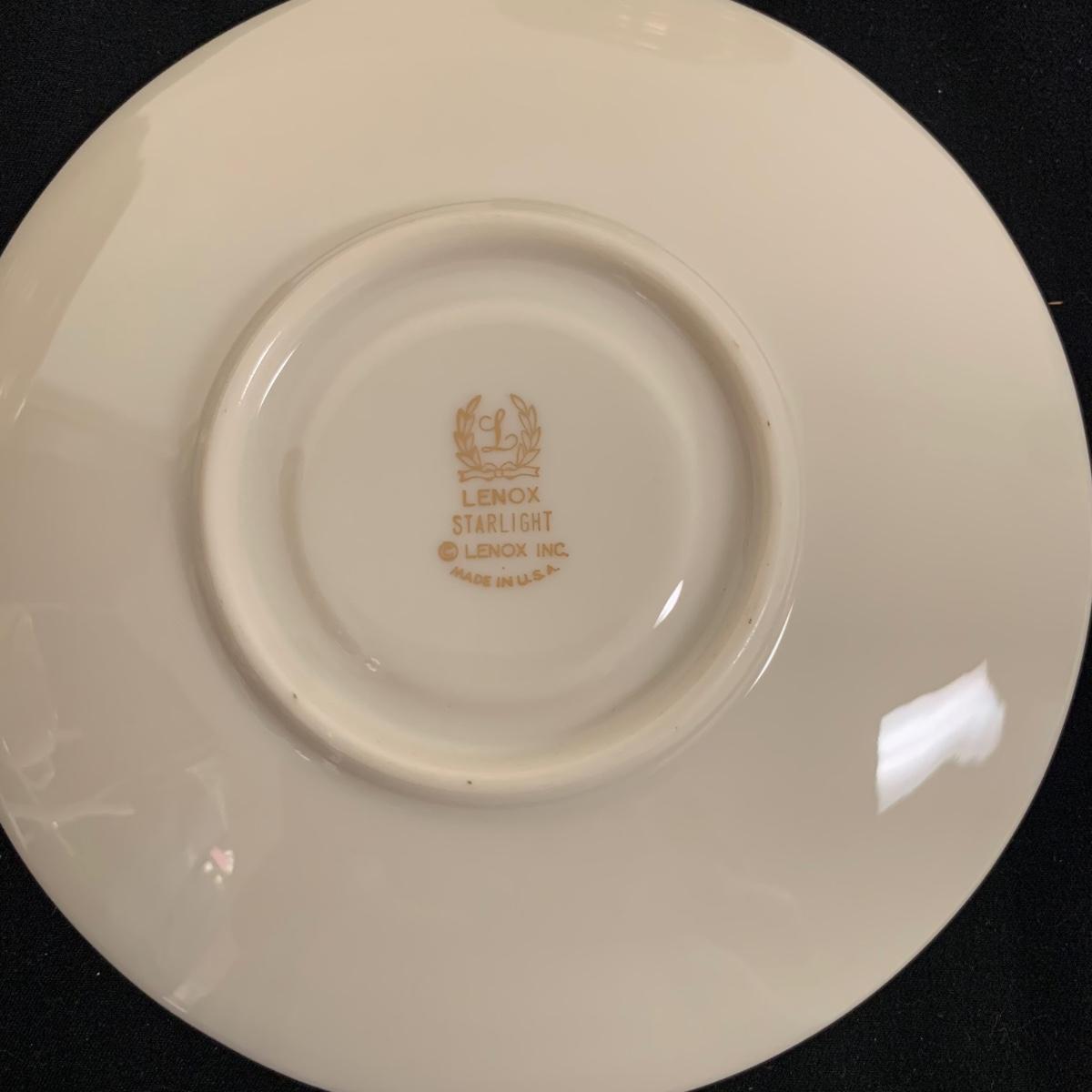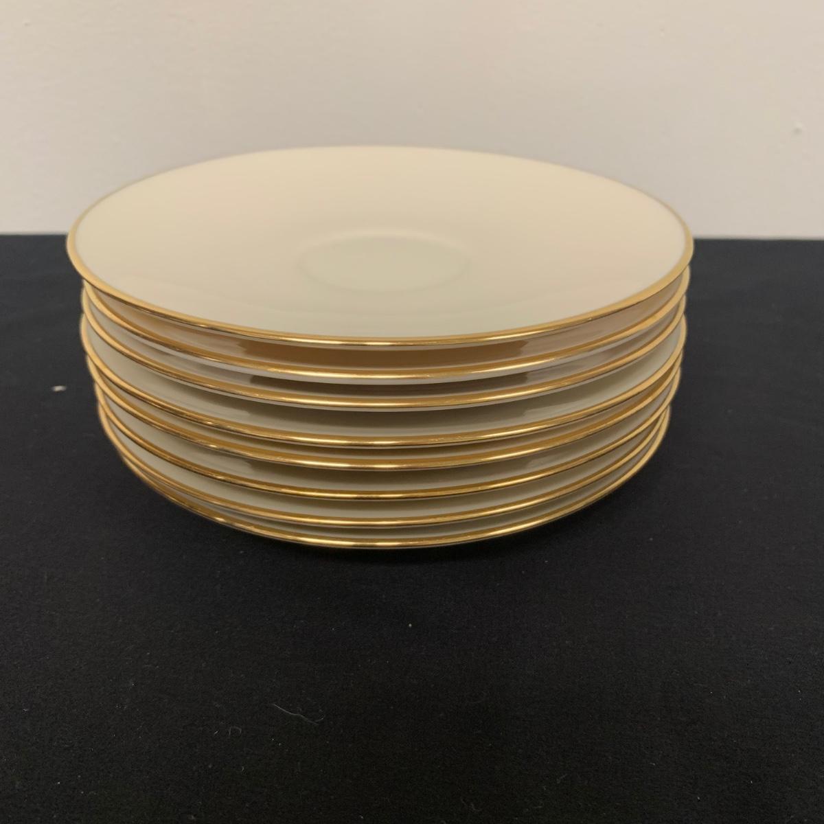 This lot includes Lenox china plates, saucers, and teacups. 16 large plates, 16 saucers, and 7 tea cups. Entire lot not photographed. The large plates measure about 10.5in x 10.5in. Shipping available.