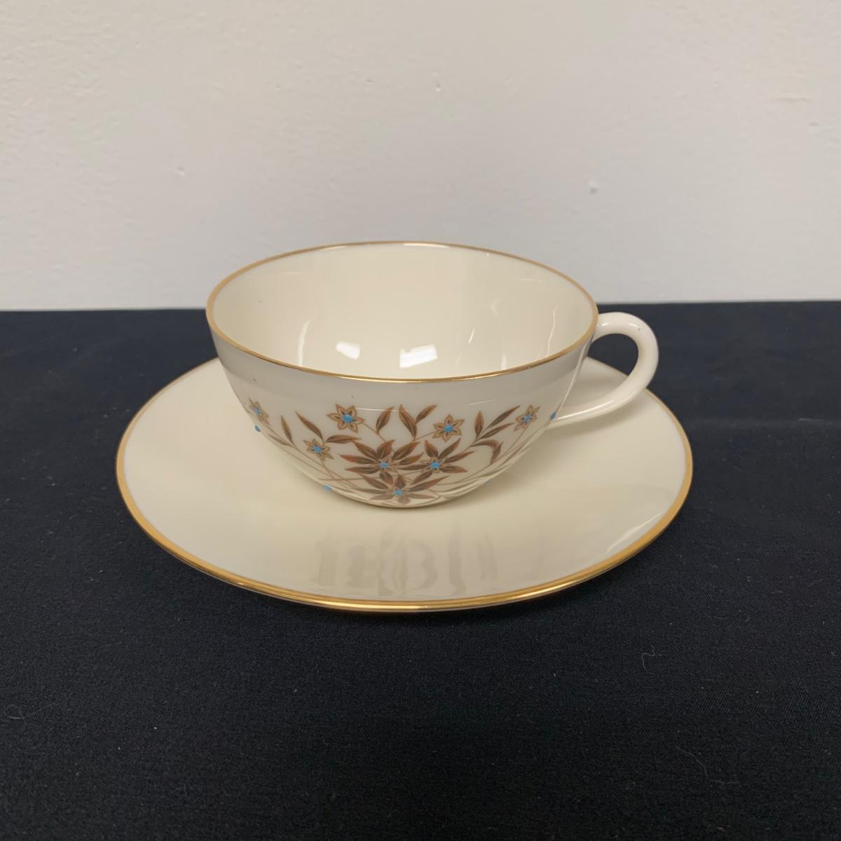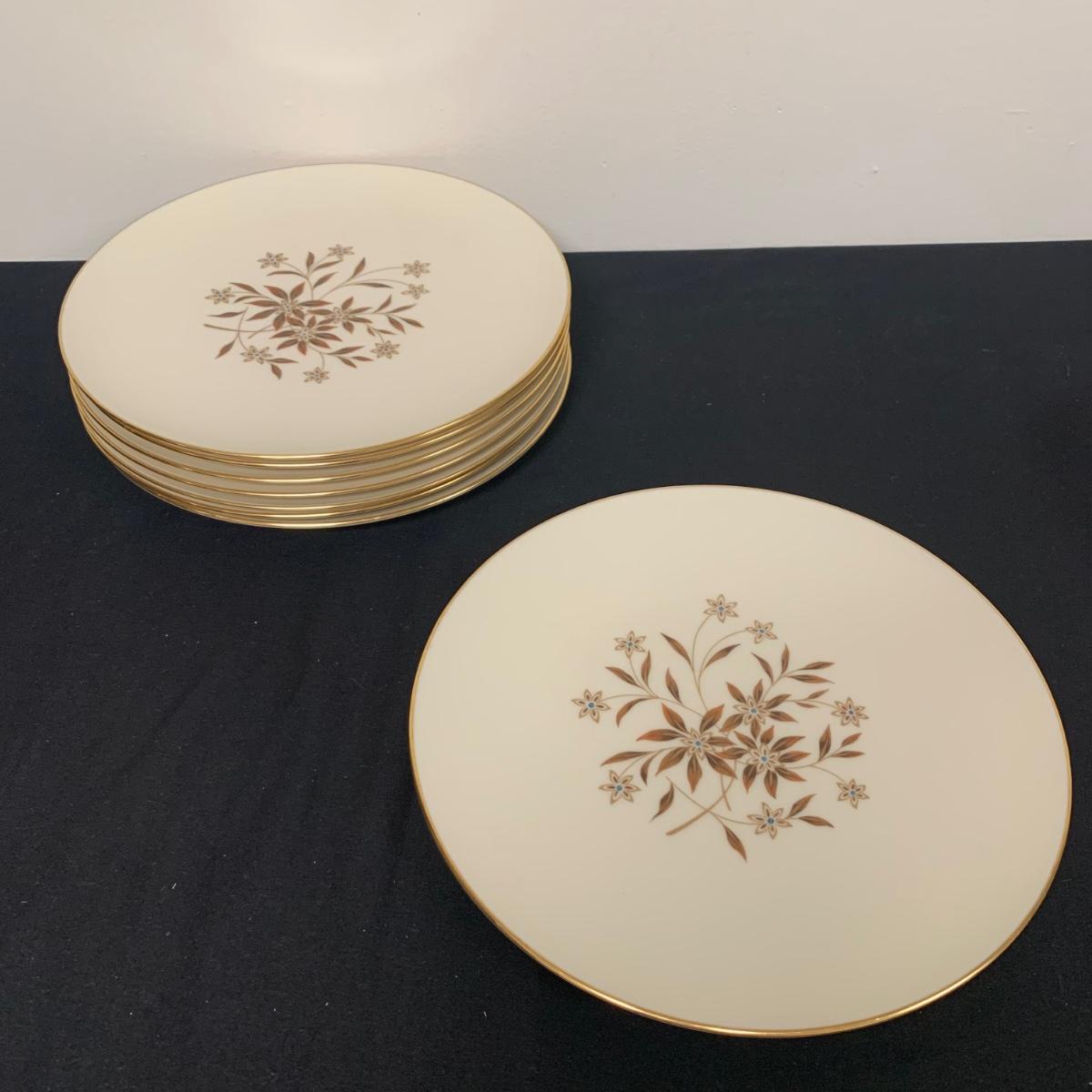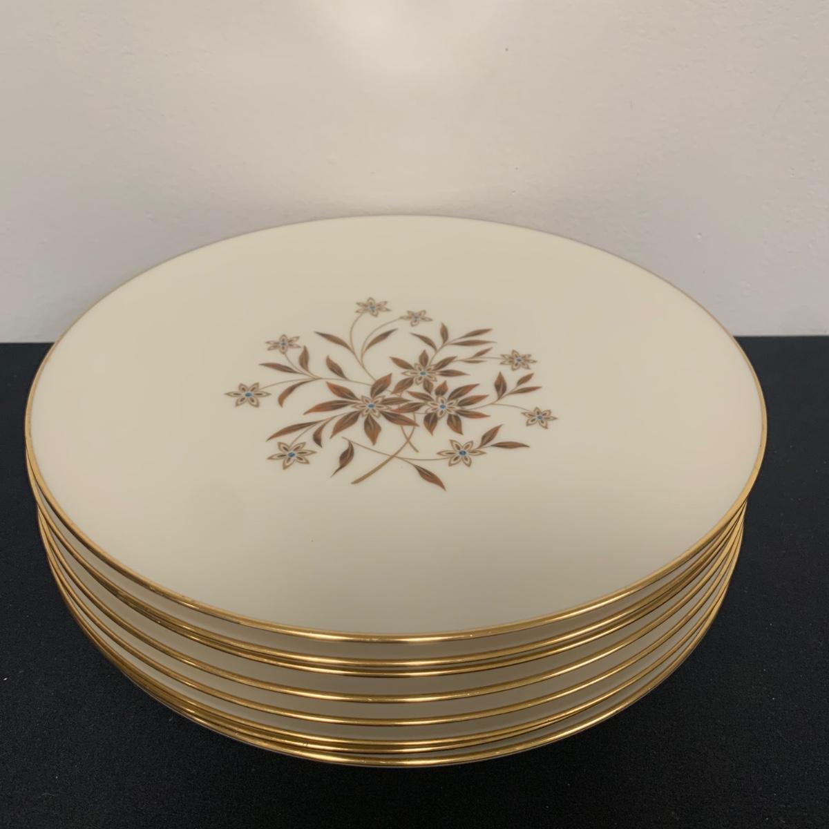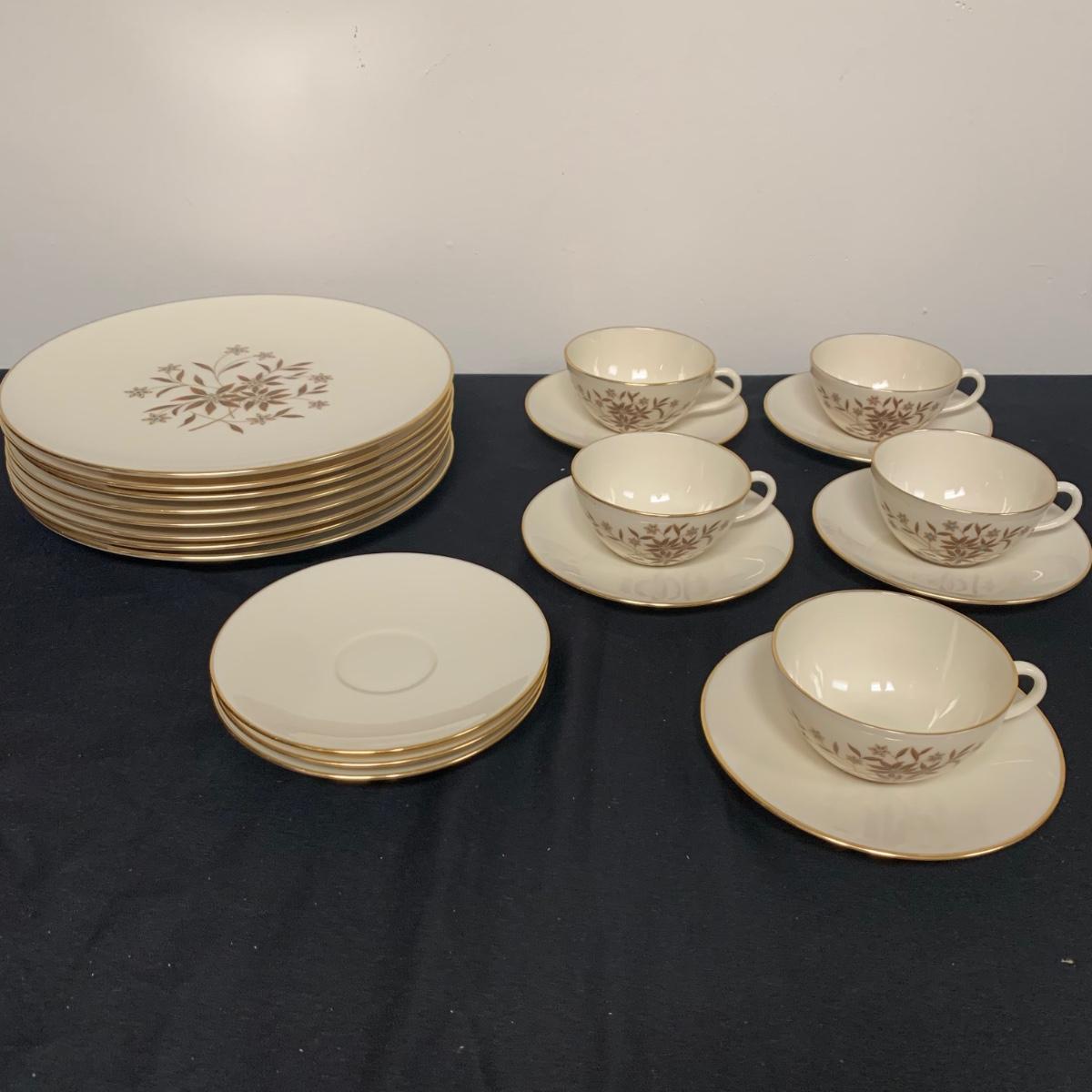 This lot includes Lenox china plates, saucers, and teacups. 16 large plates, 16 saucers, and 7 tea cups. Entire lot not photographed. The large plates measure about 10.5in x 10.5in. Shipping available.