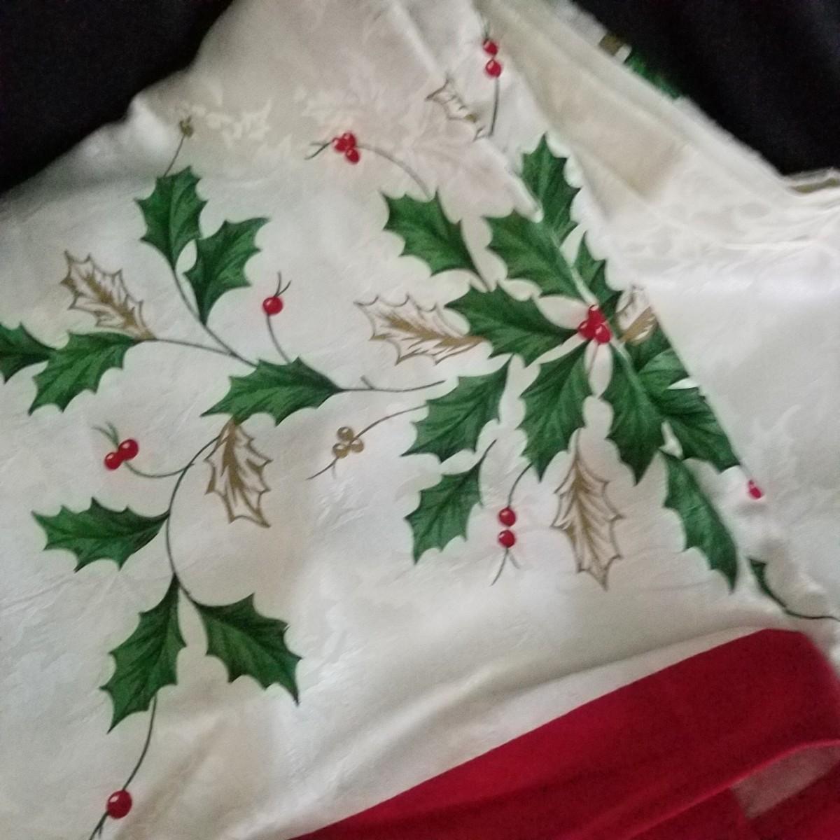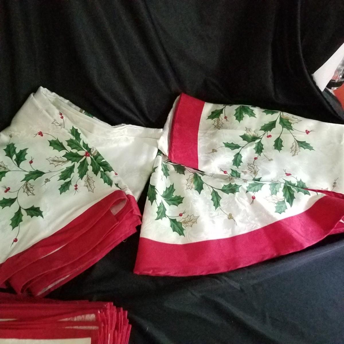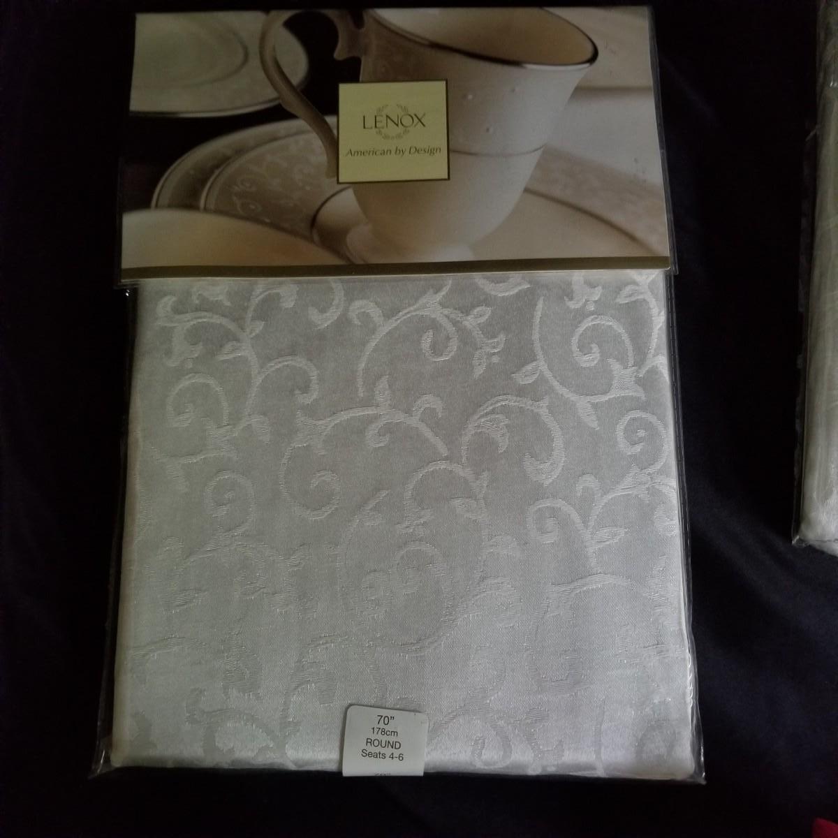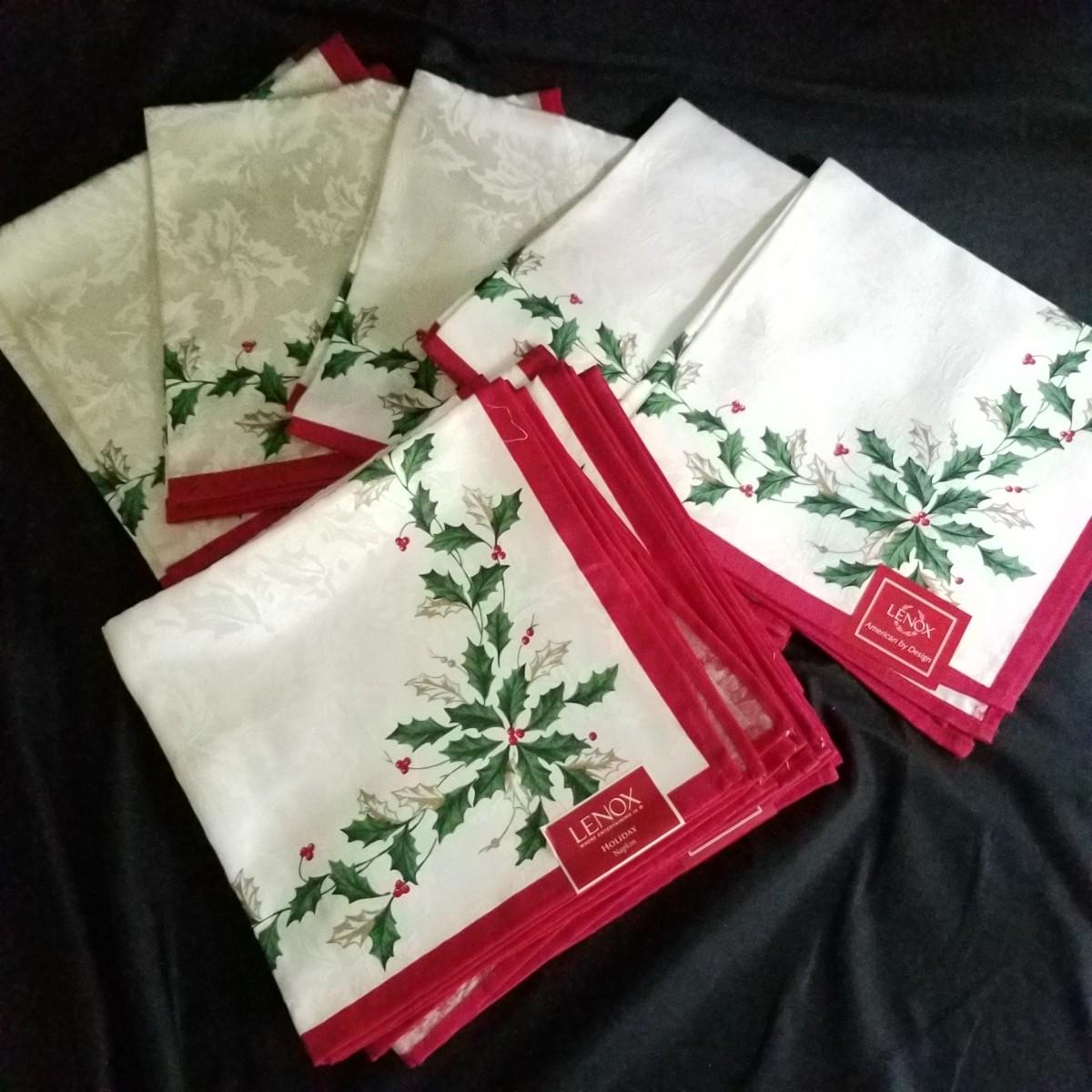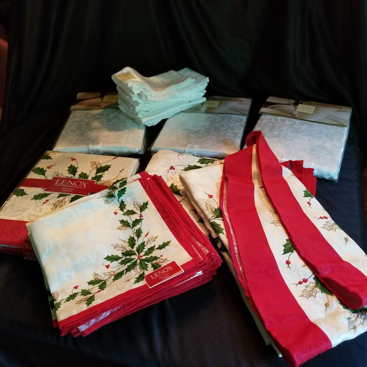 Lenox tablecloths and napkins. Three new Opal Innocence pattern tablecloths, 70" round, 60" x 84" oblong, 60" x 120" oblong. Includes twelve matching 18" square napkins. Also one new Holiday tablecloth, 60" x 104" oblong. Two used holiday tablecloths, one 70" round and the other 60" x 84" oblong. There are fourteen holiday napkins as well, each 20" square. All opened items in good shape. Shipping available.