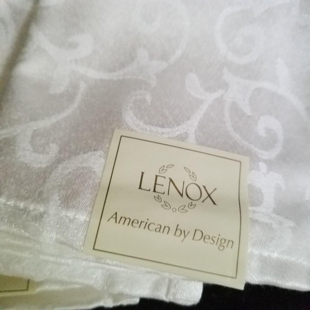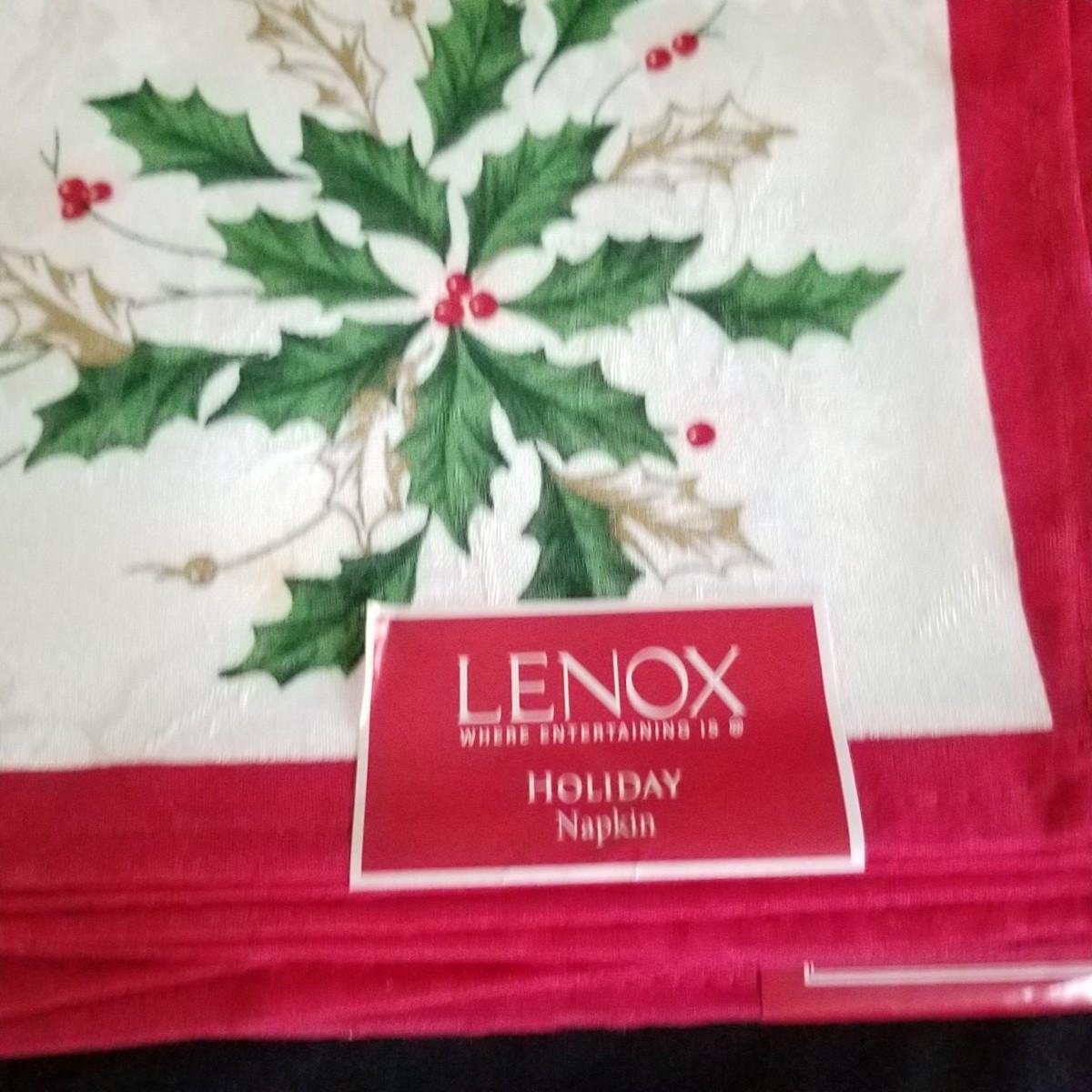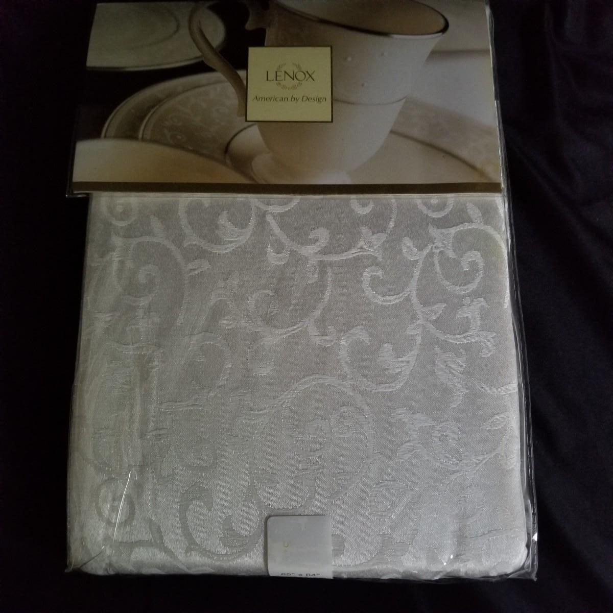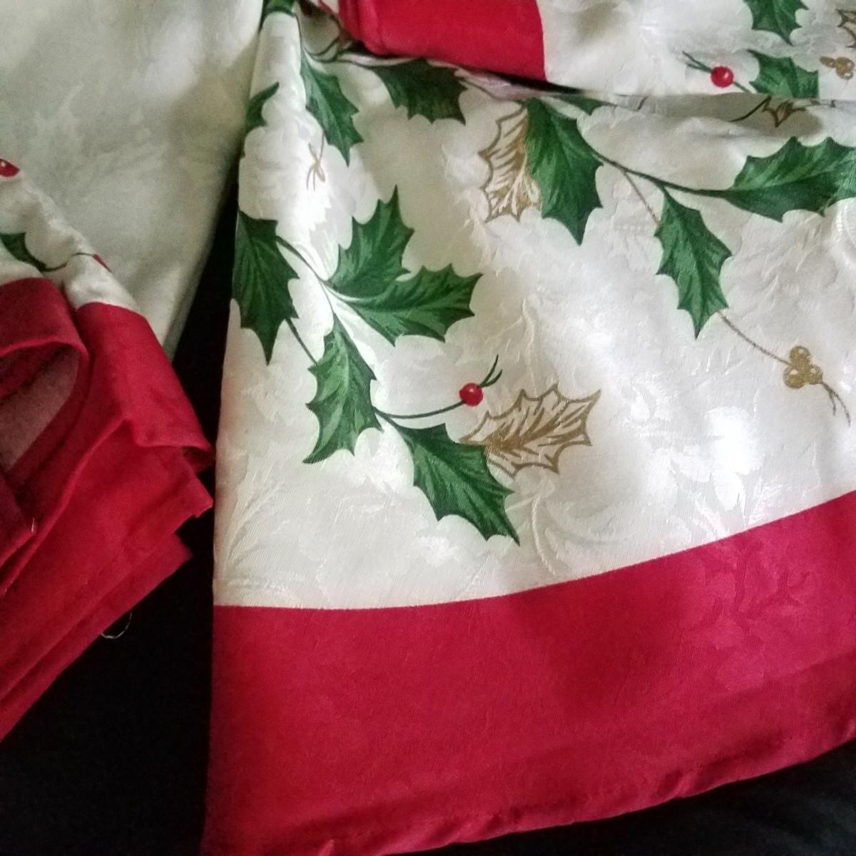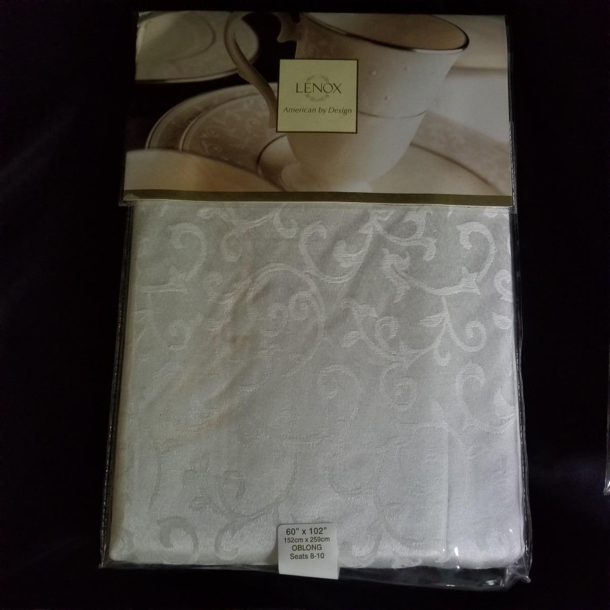 Lenox tablecloths and napkins. Three new Opal Innocence pattern tablecloths, 70" round, 60" x 84" oblong, 60" x 120" oblong. Includes twelve matching 18" square napkins. Also one new Holiday tablecloth, 60" x 104" oblong. Two used holiday tablecloths, one 70" round and the other 60" x 84" oblong. There are fourteen holiday napkins as well, each 20" square. All opened items in good shape. Shipping available.