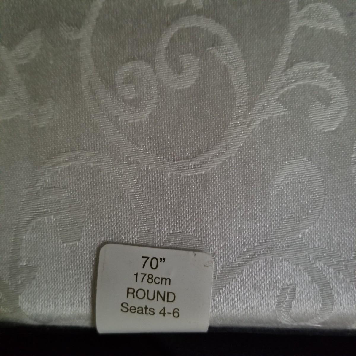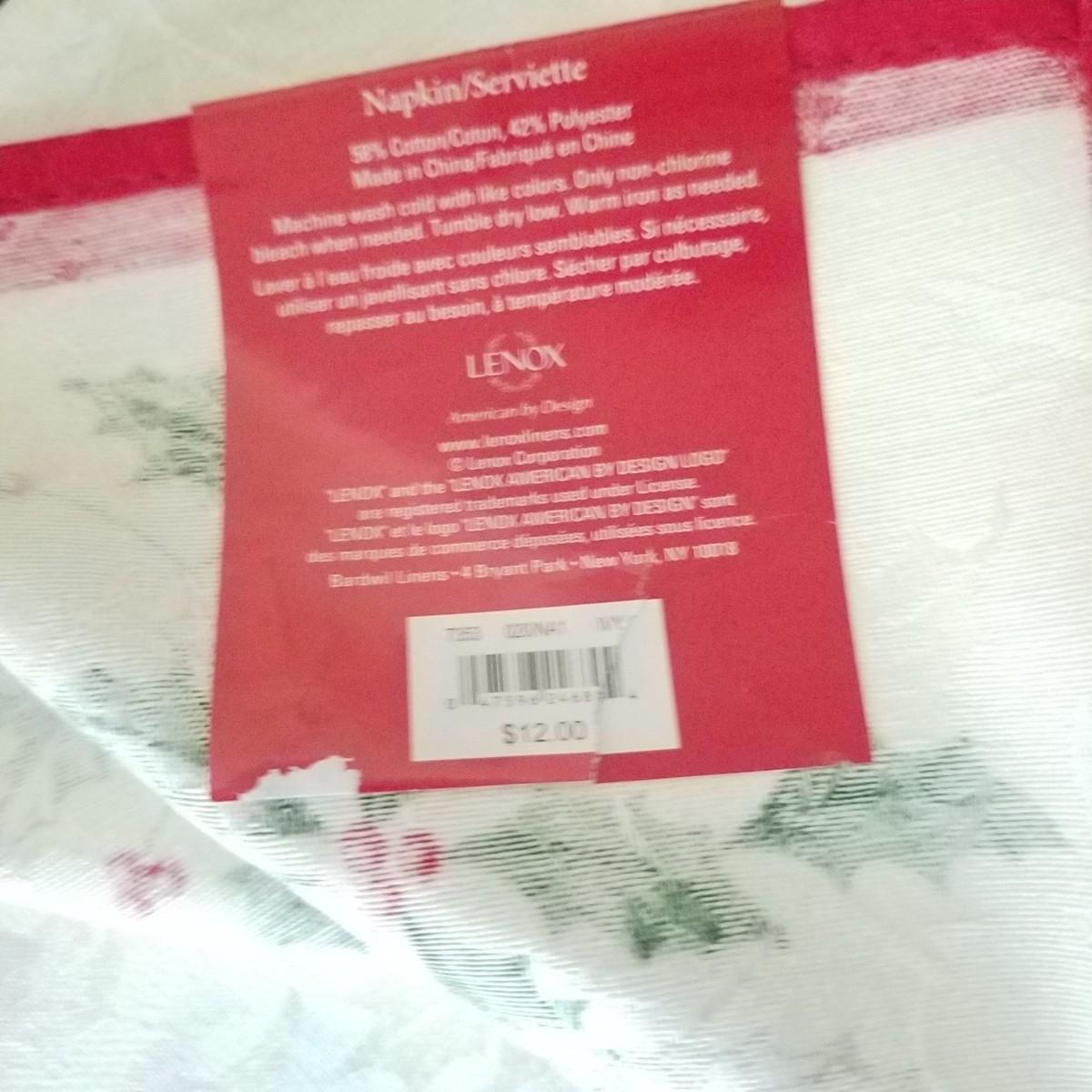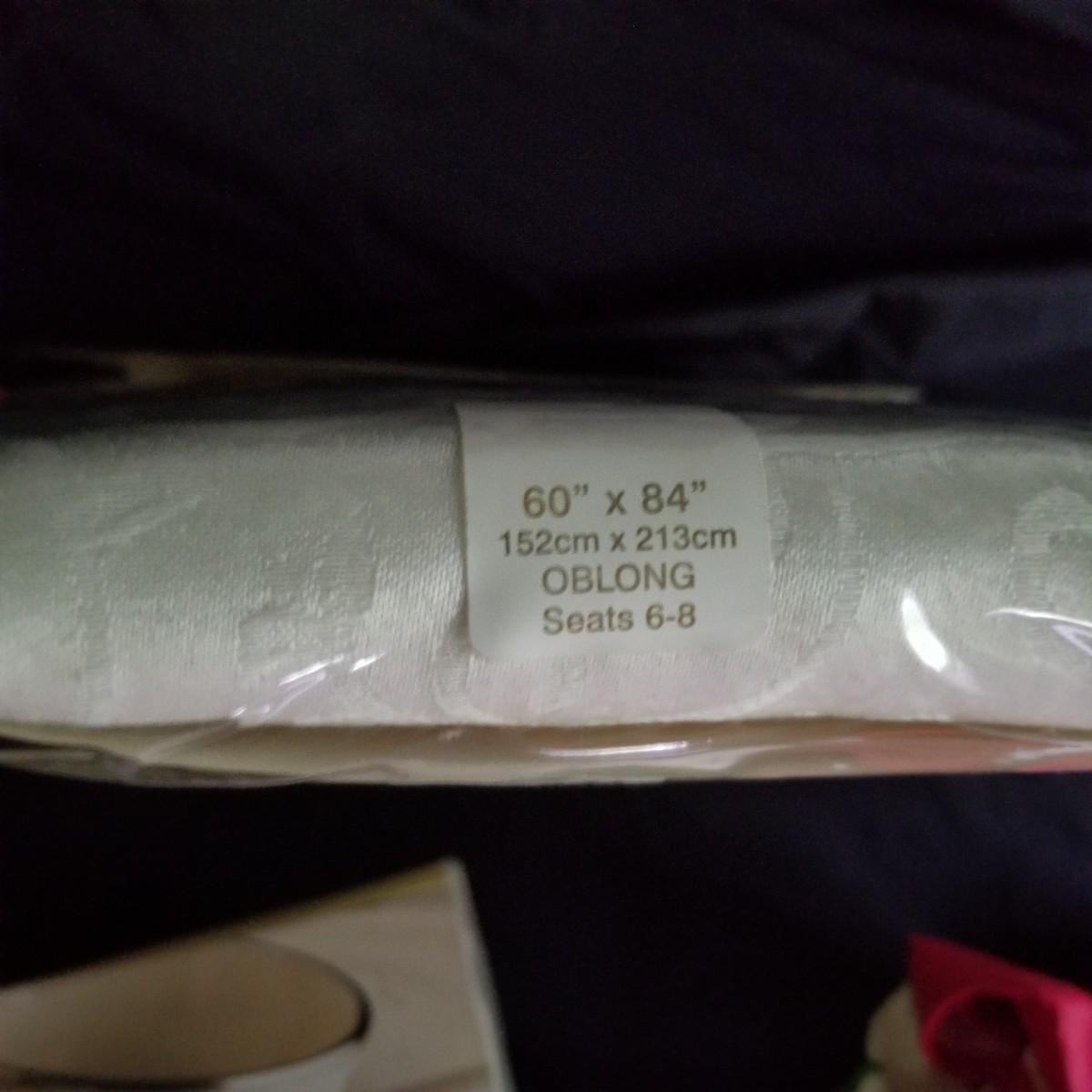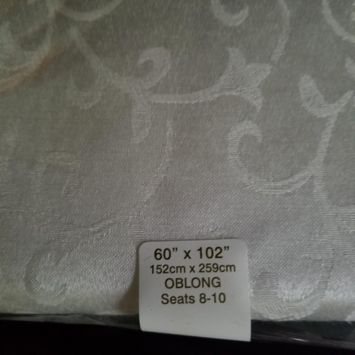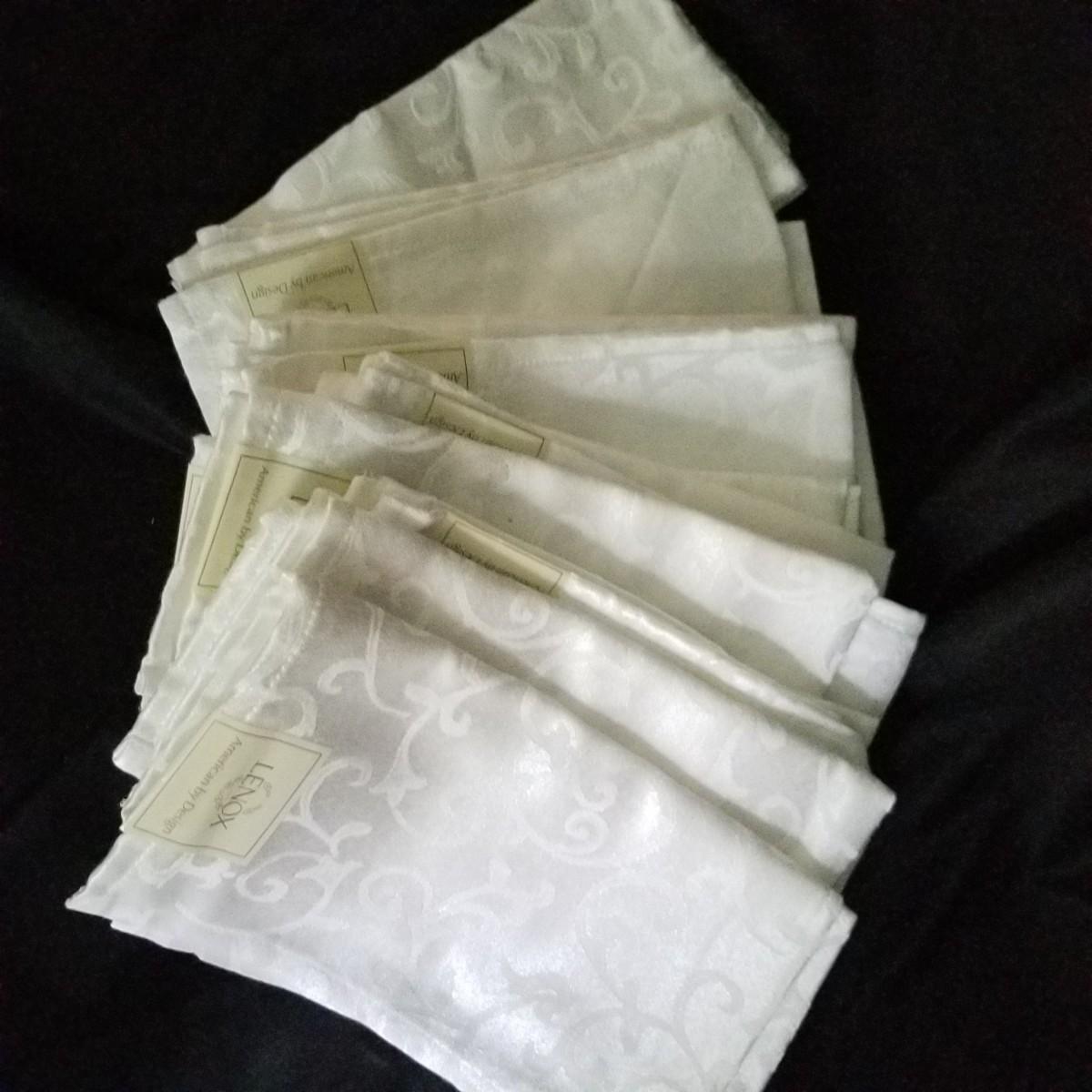 Lenox tablecloths and napkins. Three new Opal Innocence pattern tablecloths, 70" round, 60" x 84" oblong, 60" x 120" oblong. Includes twelve matching 18" square napkins. Also one new Holiday tablecloth, 60" x 104" oblong. Two used holiday tablecloths, one 70" round and the other 60" x 84" oblong. There are fourteen holiday napkins as well, each 20" square. All opened items in good shape. Shipping available.