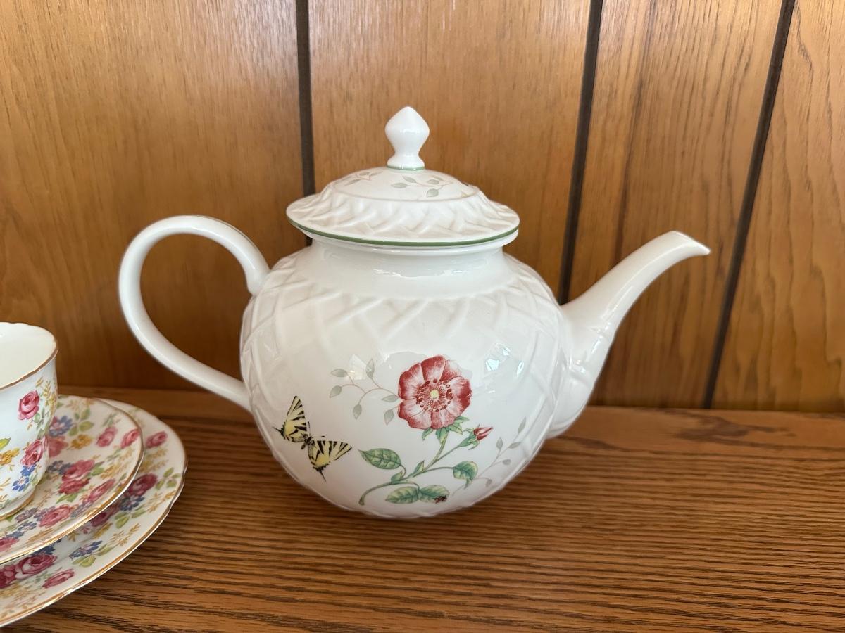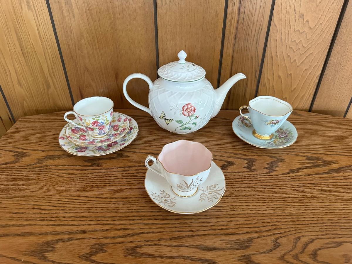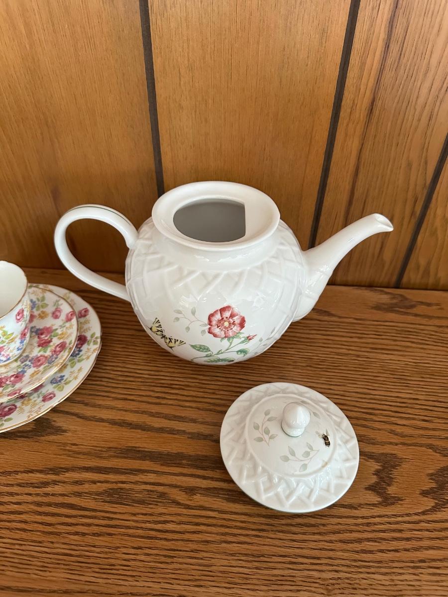 LENOX TEAPOT AND BONE CHINA TEA CUPS AND SAUCERS