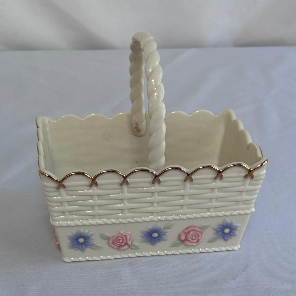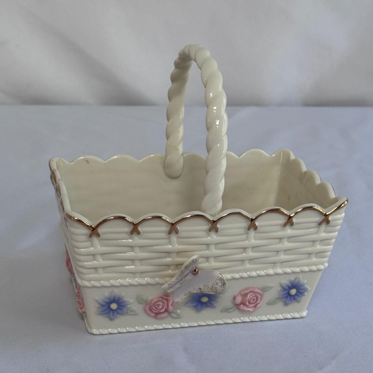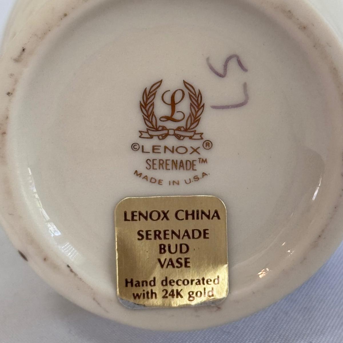 This lot includes one Lenox Tucker pitcher, one Lenox Smithsonian Saxony vase, one basket with a gold butterfly plus pink and blue flowers by Lenox, and one Lenox serenade bud vase. All items are stamped with Lenox on the bottom. All items, excluding the basket had a sticker on the bottom that reads “hand decorated with 24k gold.” The saxony vase is the largest item that measures 6” x 11”H. Shipping available. Shipping can be costly. We suggest contacting our preferred local shipping provider, Postage Express, with dimensions and getting an estimate before bidding: (828) 255-9250 or shipping@postageexpressnc.com.