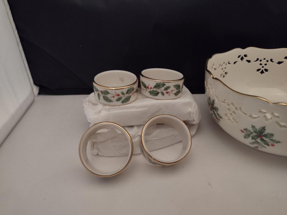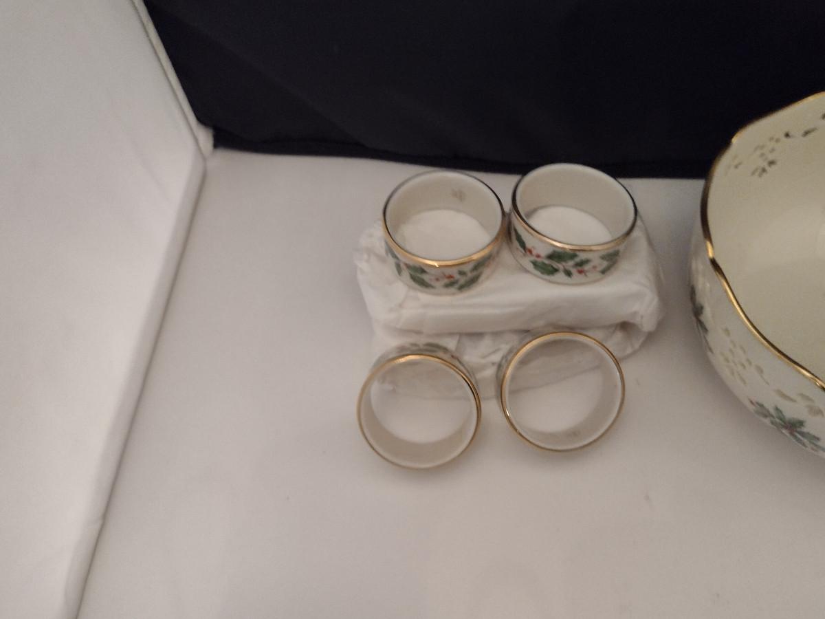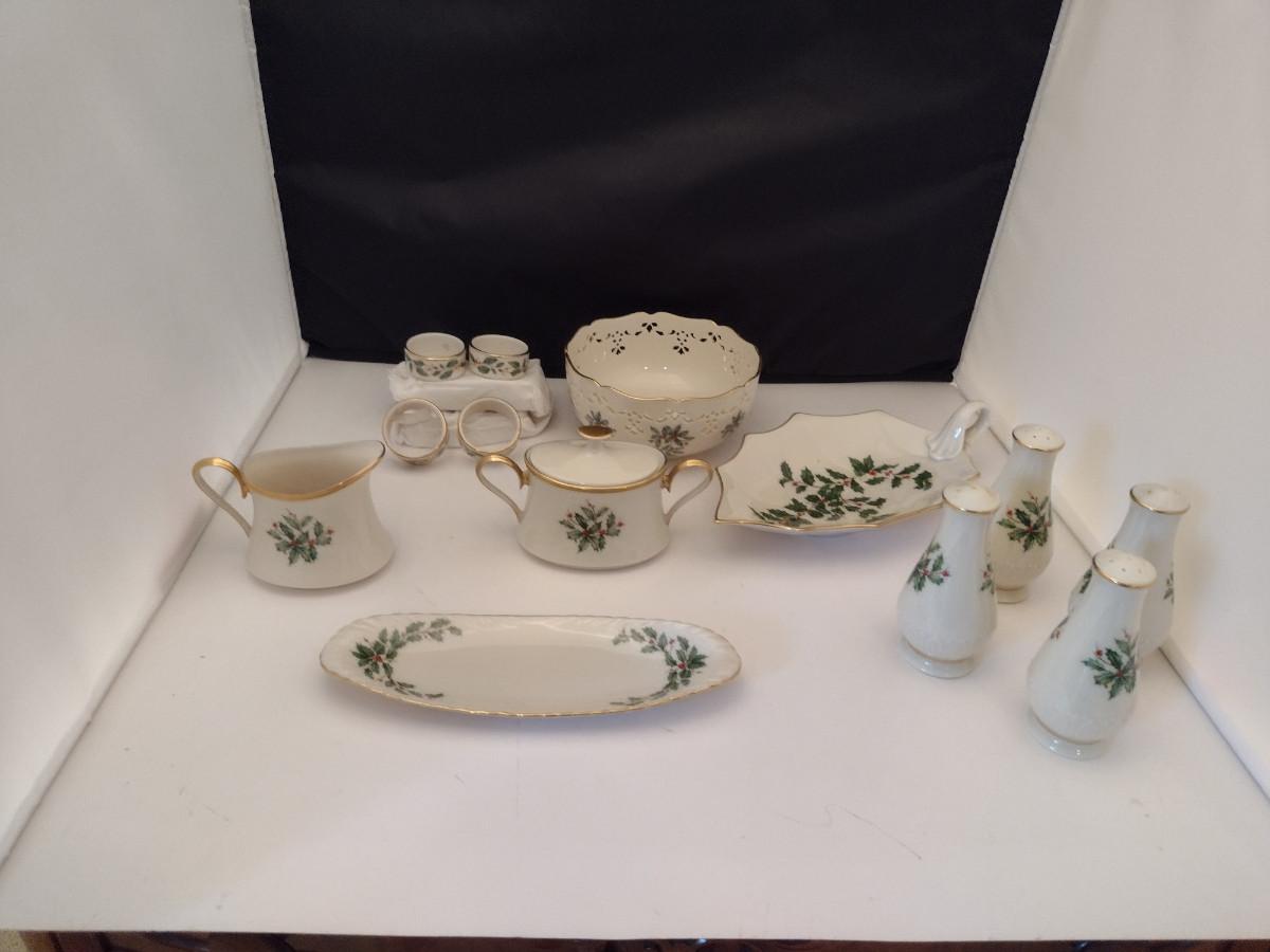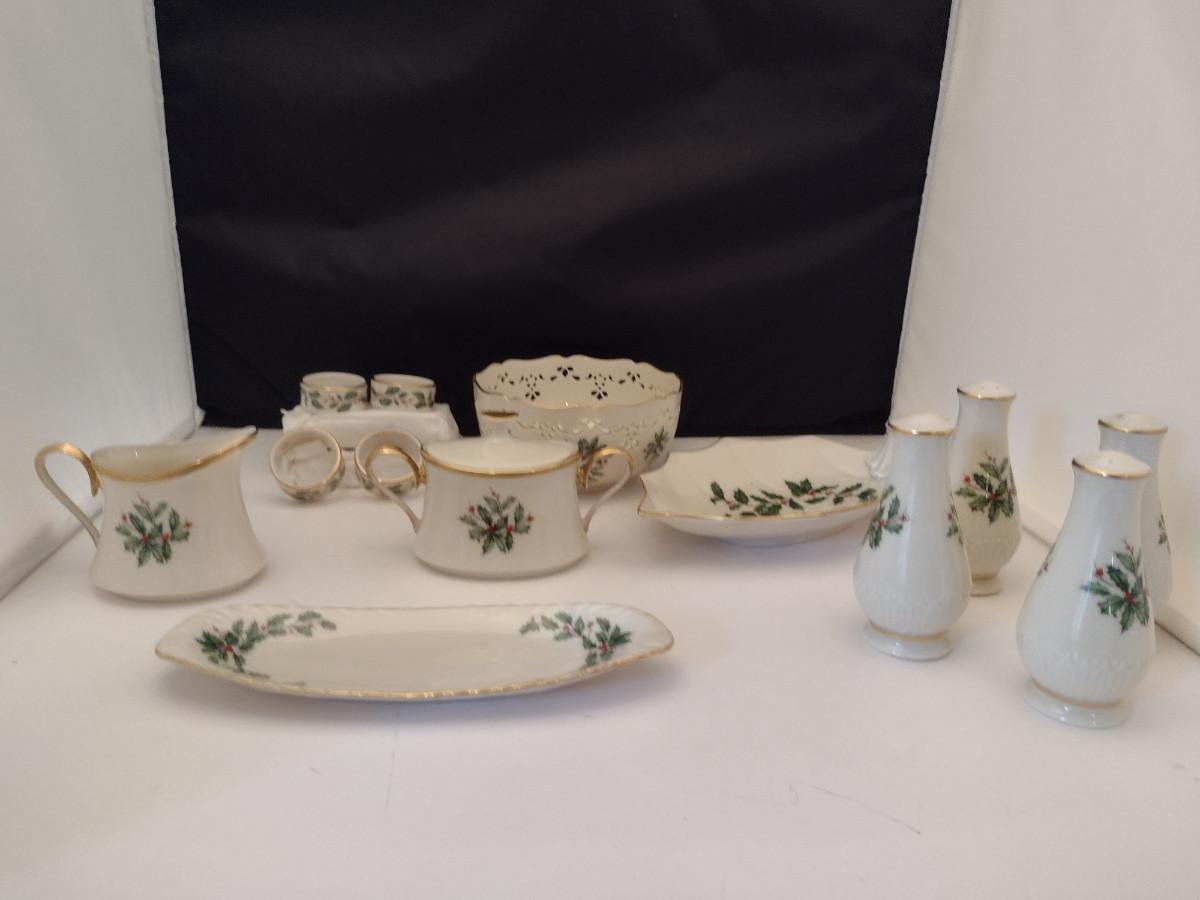 Lenox (USA) Assorted Table Ware- Holiday Pattern. Creamer, covered sugar bowl, 2 sets salt & pepper shakers, reticulated bowl, holly shaped bowl, oval shaped plate, 8 napkin rings.
