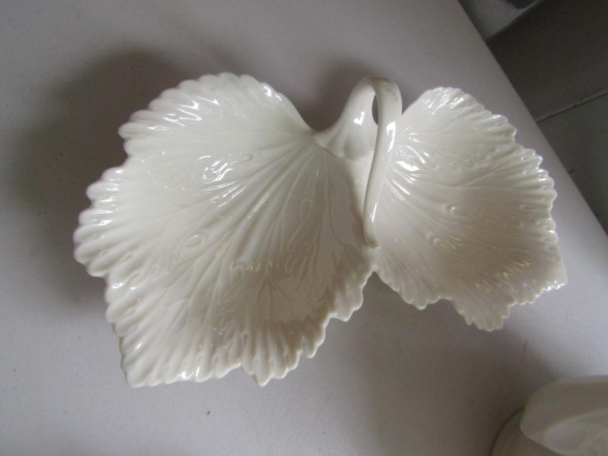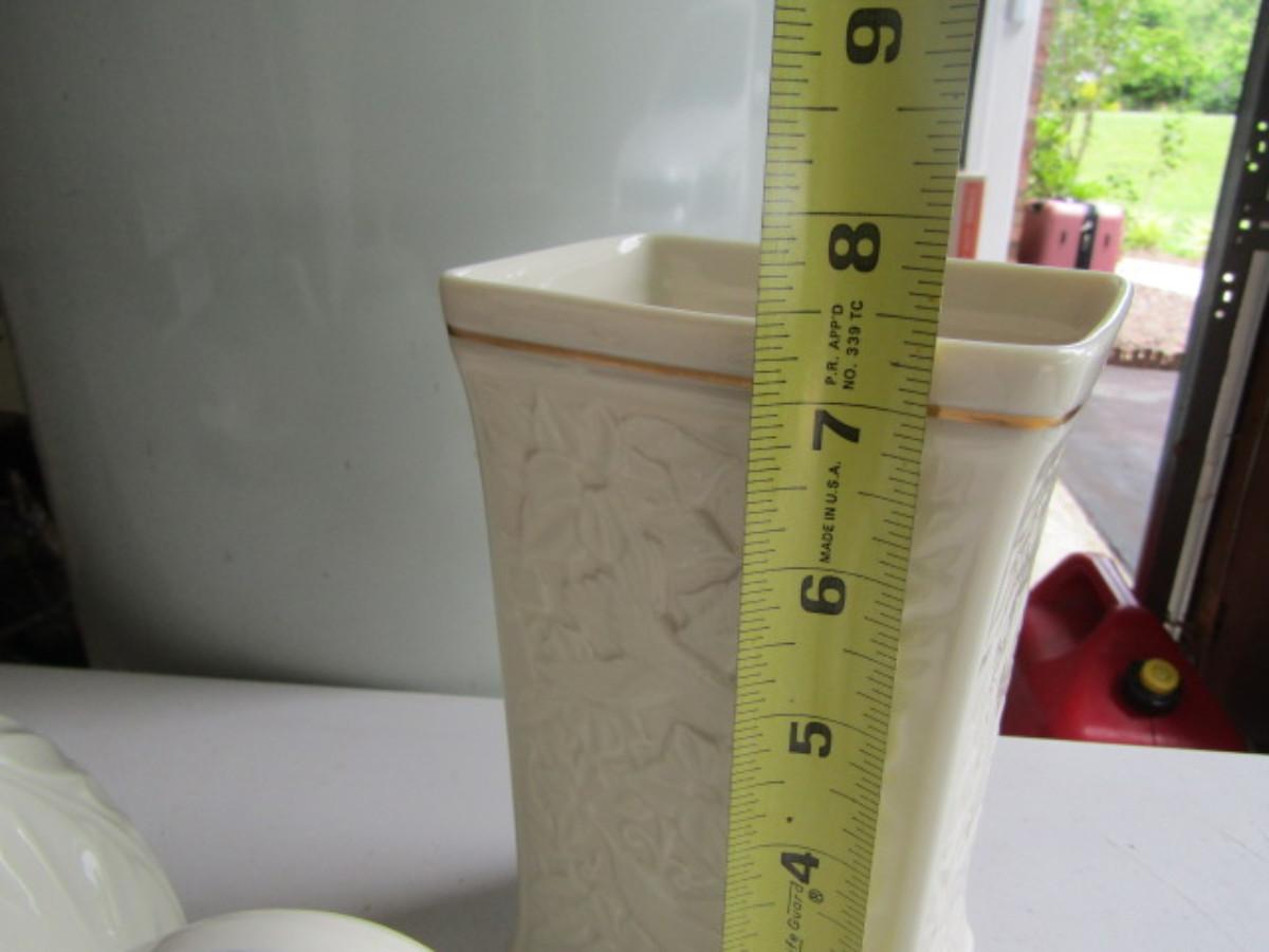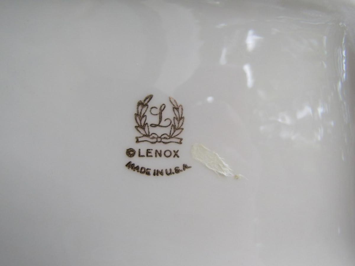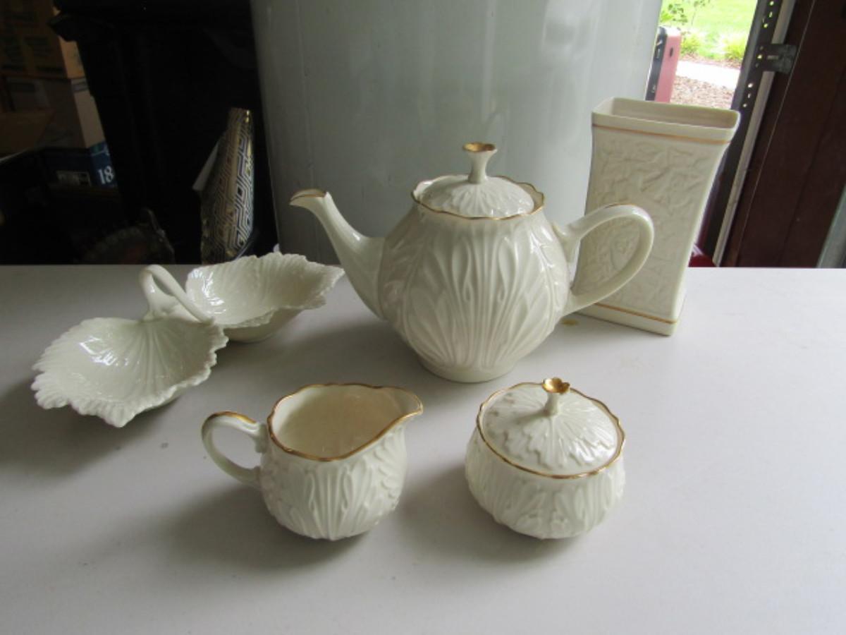 Lenox (USA) Teapot and Accessories. Teapot, creamer, sugar bowl with lid, two section bowl, and vase.