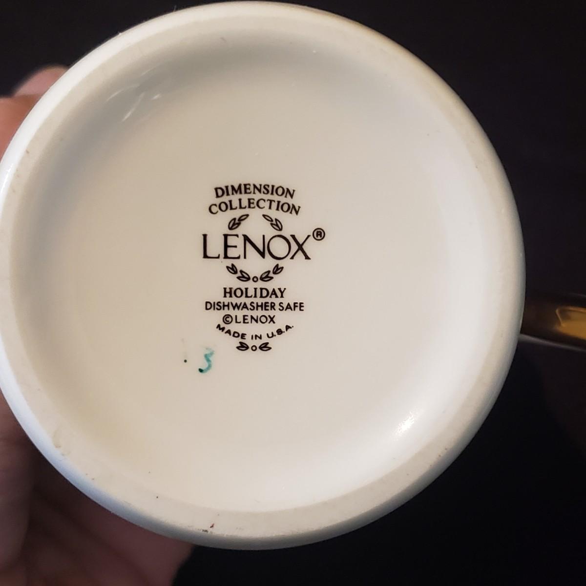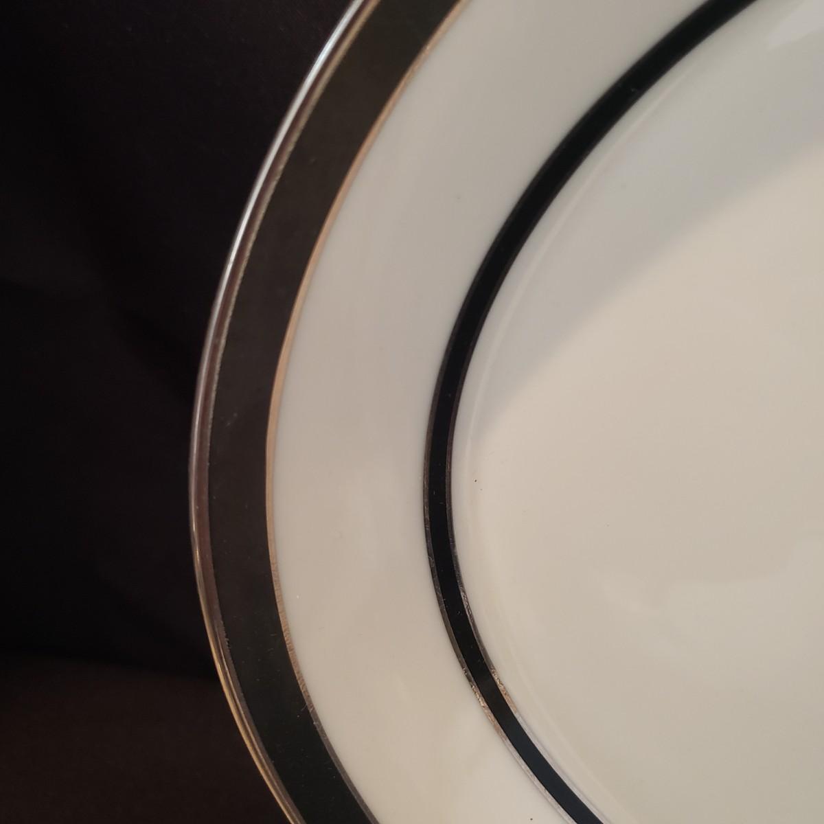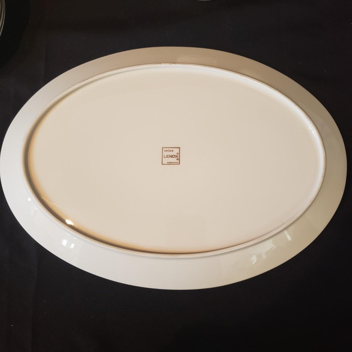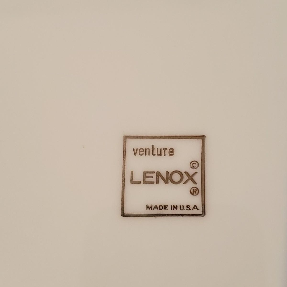 This lot features two different Lenox dishes. The black and silver rimmed set is from the Venture collection. The large platter measures 16"x 11". There is some wear on the outer silver band on some dishes. The dinner plates have some chipping, see pictures. The four mugs are from the Dimension Collection and appear blemish free.