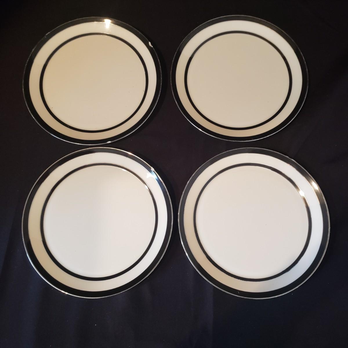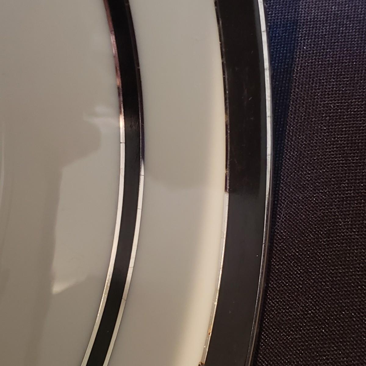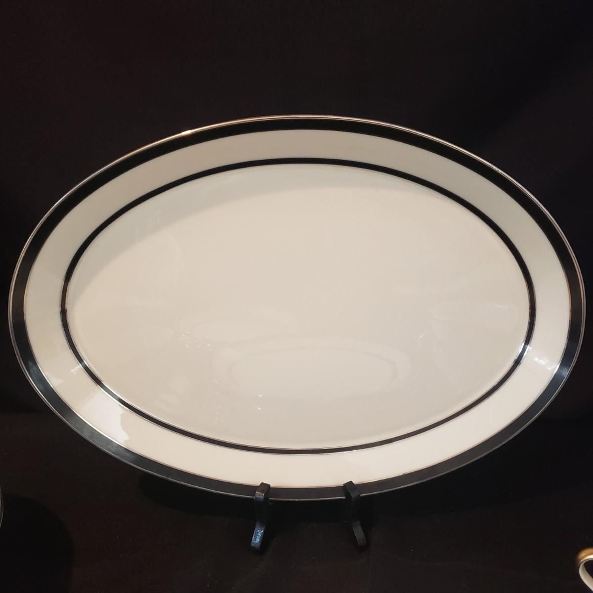 This lot features two different Lenox dishes. The black and silver rimmed set is from the Venture collection. The large platter measures 16"x 11". There is some wear on the outer silver band on some dishes. The dinner plates have some chipping, see pictures. The four mugs are from the Dimension Collection and appear blemish free.