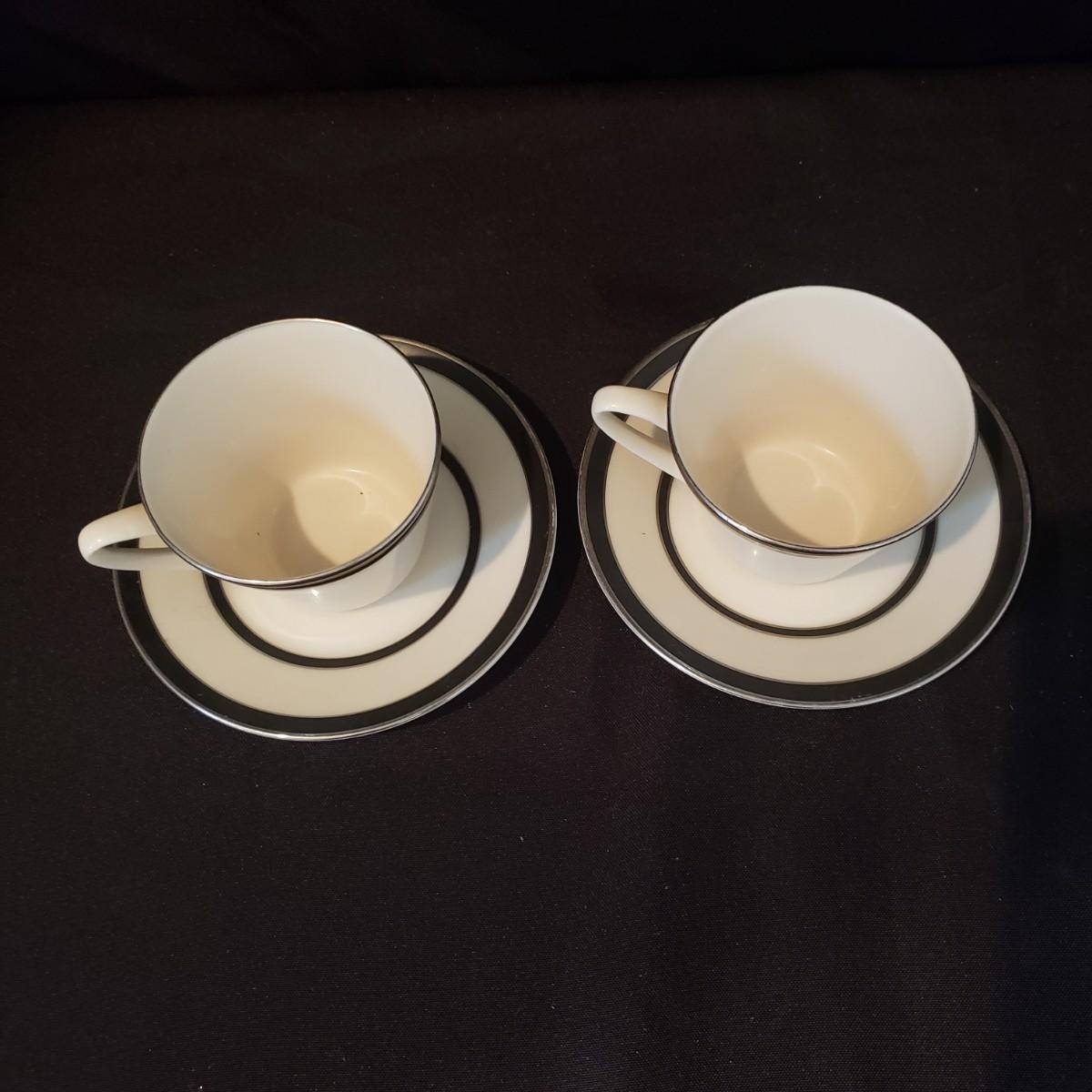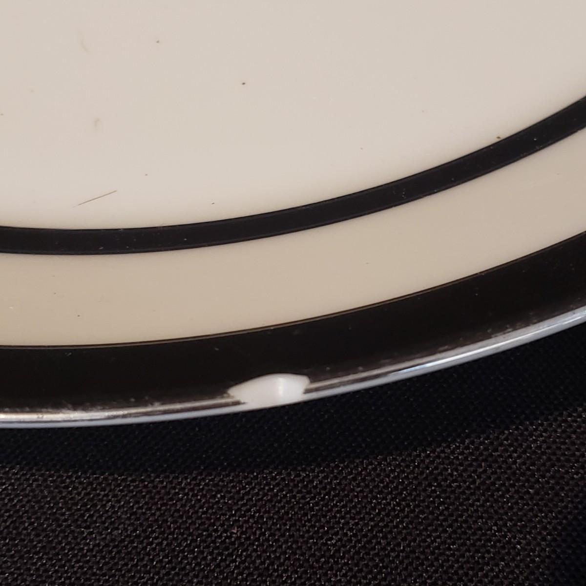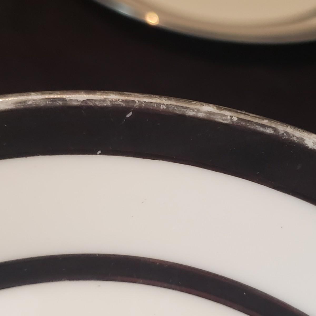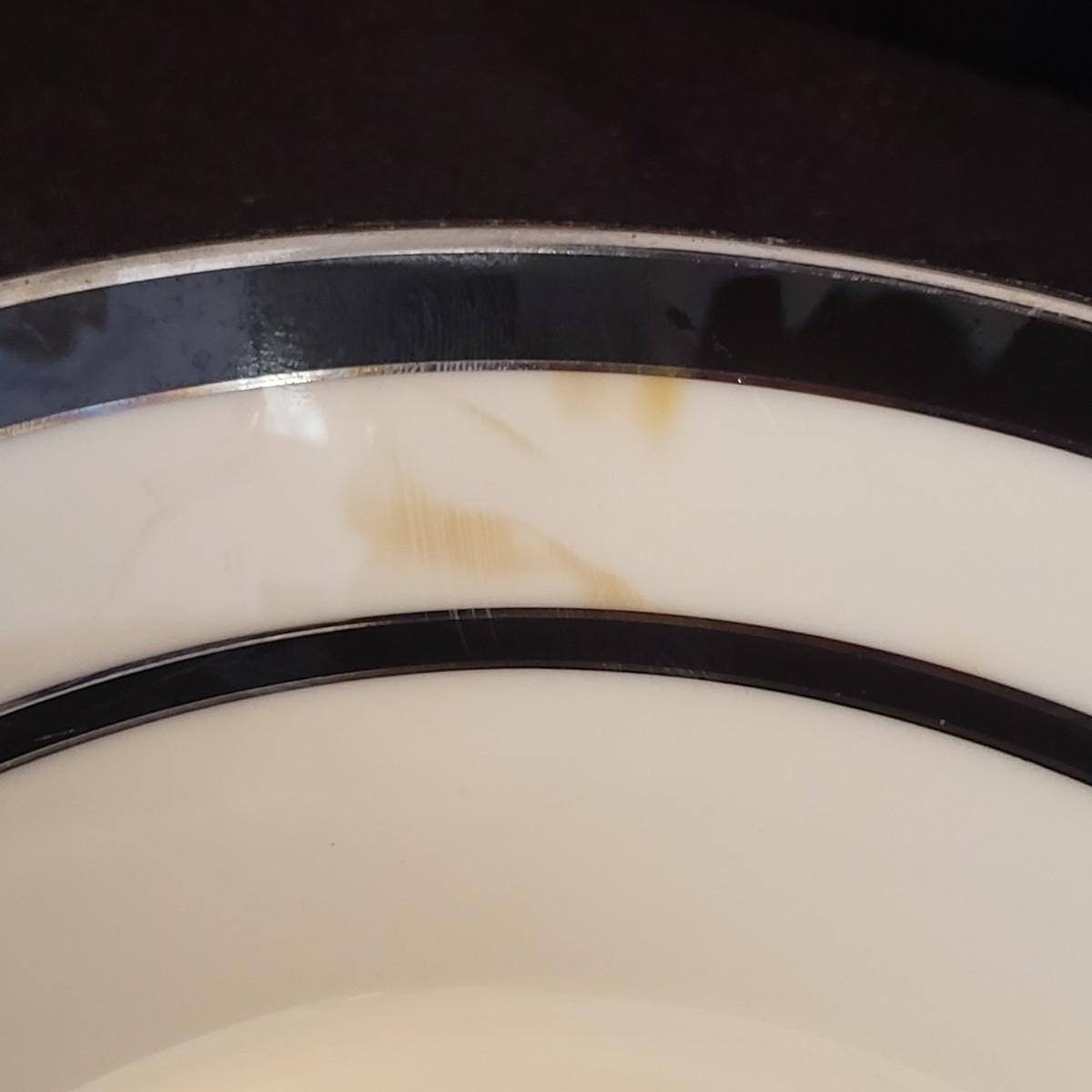 This lot features two different Lenox dishes. The black and silver rimmed set is from the Venture collection. The large platter measures 16"x 11". There is some wear on the outer silver band on some dishes. The dinner plates have some chipping, see pictures. The four mugs are from the Dimension Collection and appear blemish free.