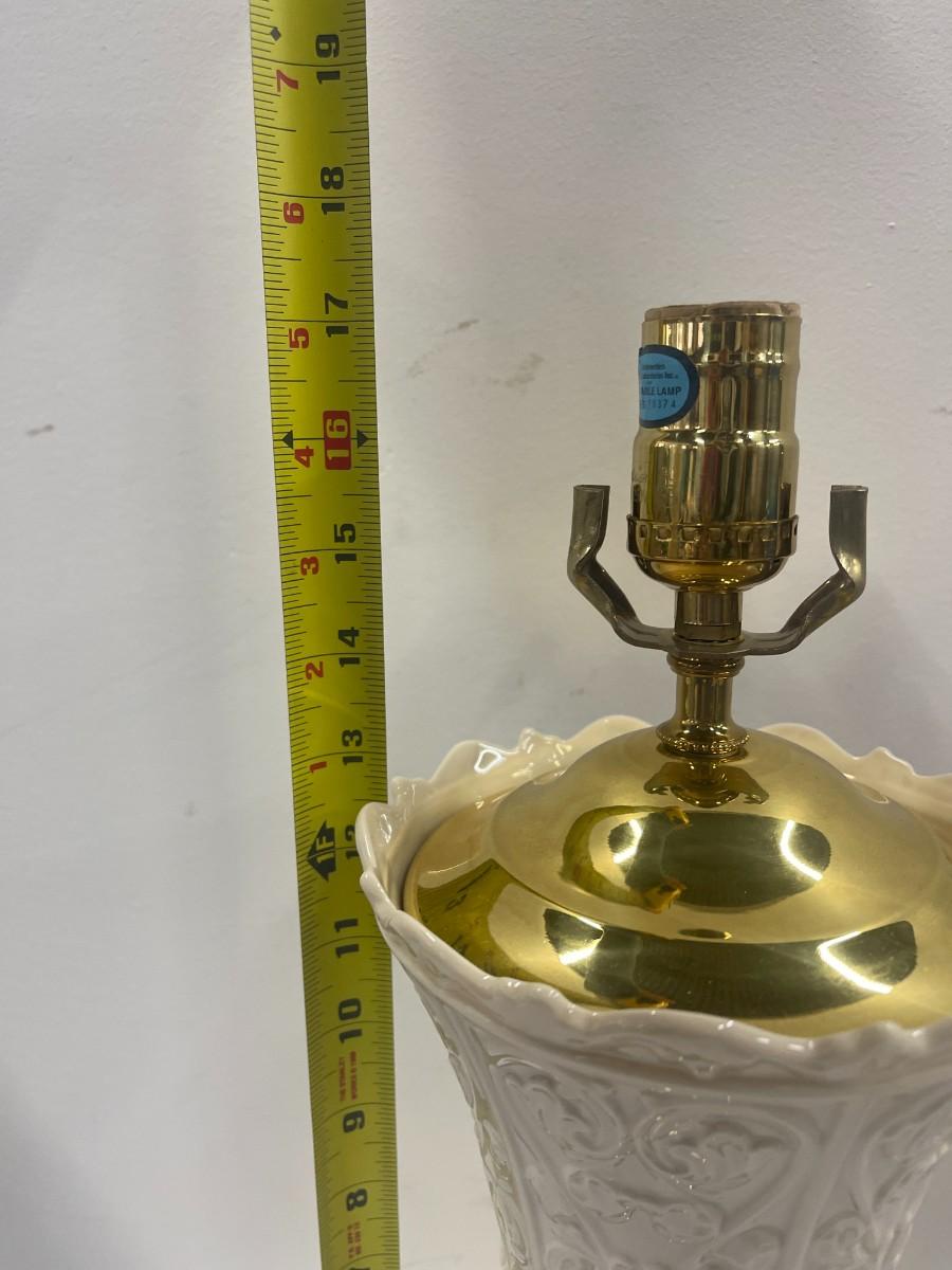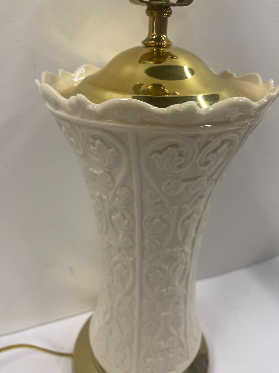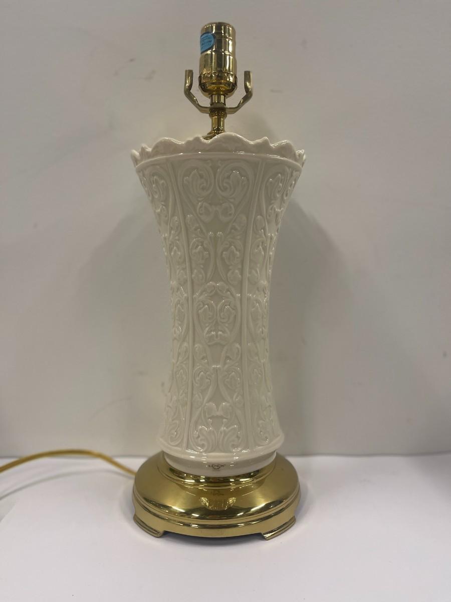 Illuminate your home with the timeless beauty of the Lenox Wentworth Lamp. Crafted from elegant porcelain and brass, this lamp will make a lasting impression on any room you place it into. With a design that has been in production since the 1940s, it is sure to impress with its classic style and superior craftsmanship. Add a touch of sophistication to your home with the Lenox Wentworth Lamp! Brass shows some minor wear from being stored for so long. Lamp has never been used. Marked Lenox at the base. Does not include finial, harp or lamp shade. 17" high. # 1194