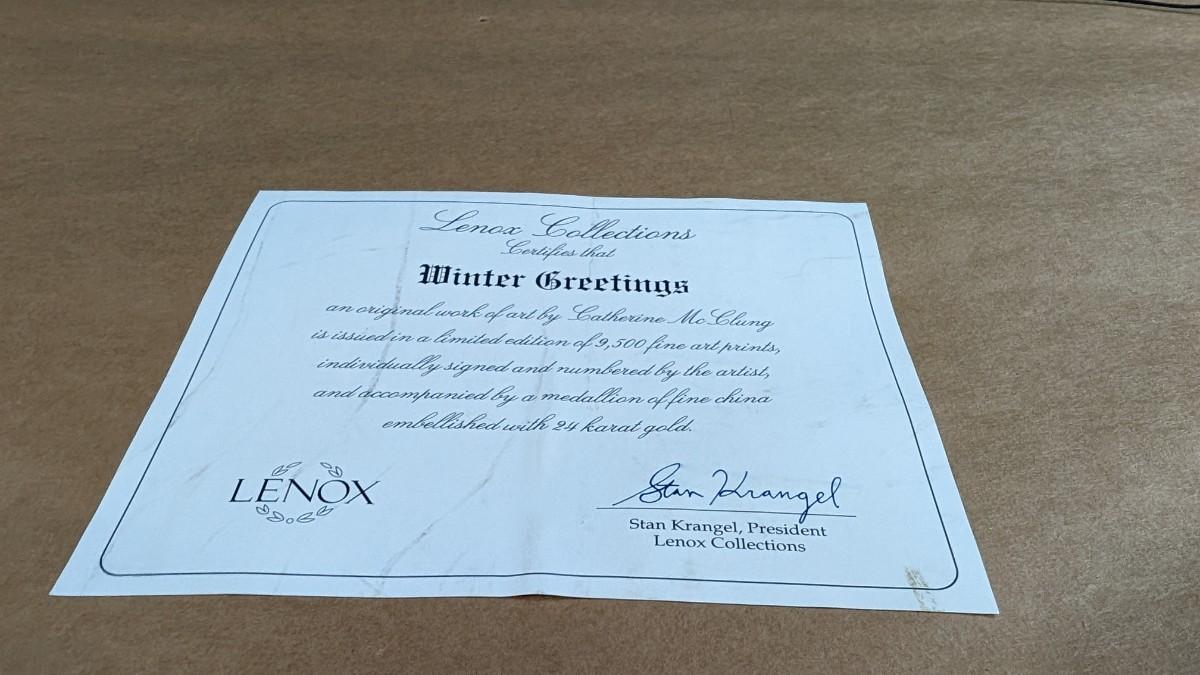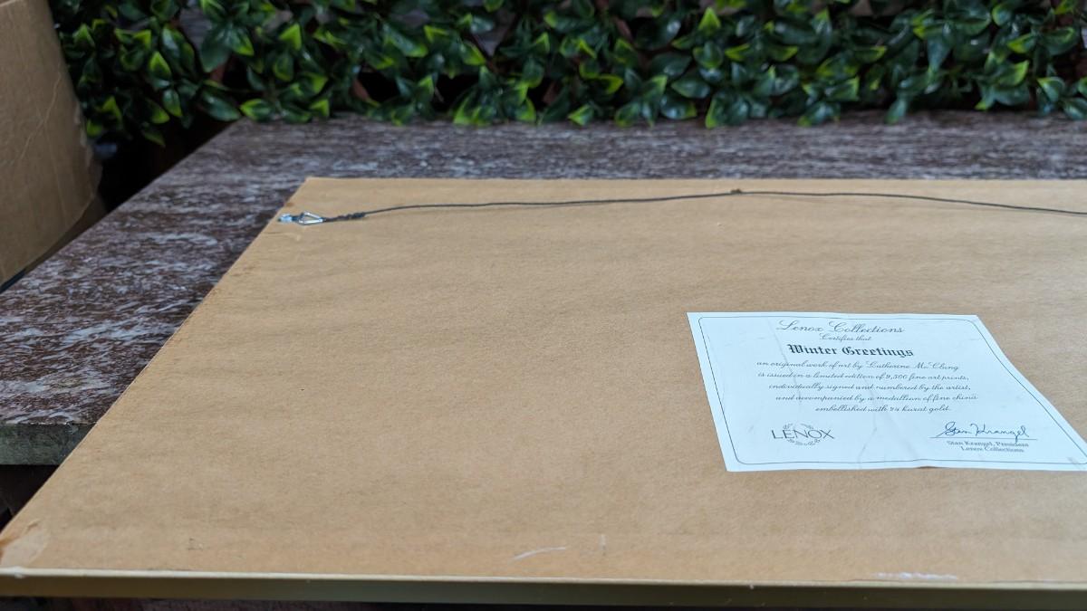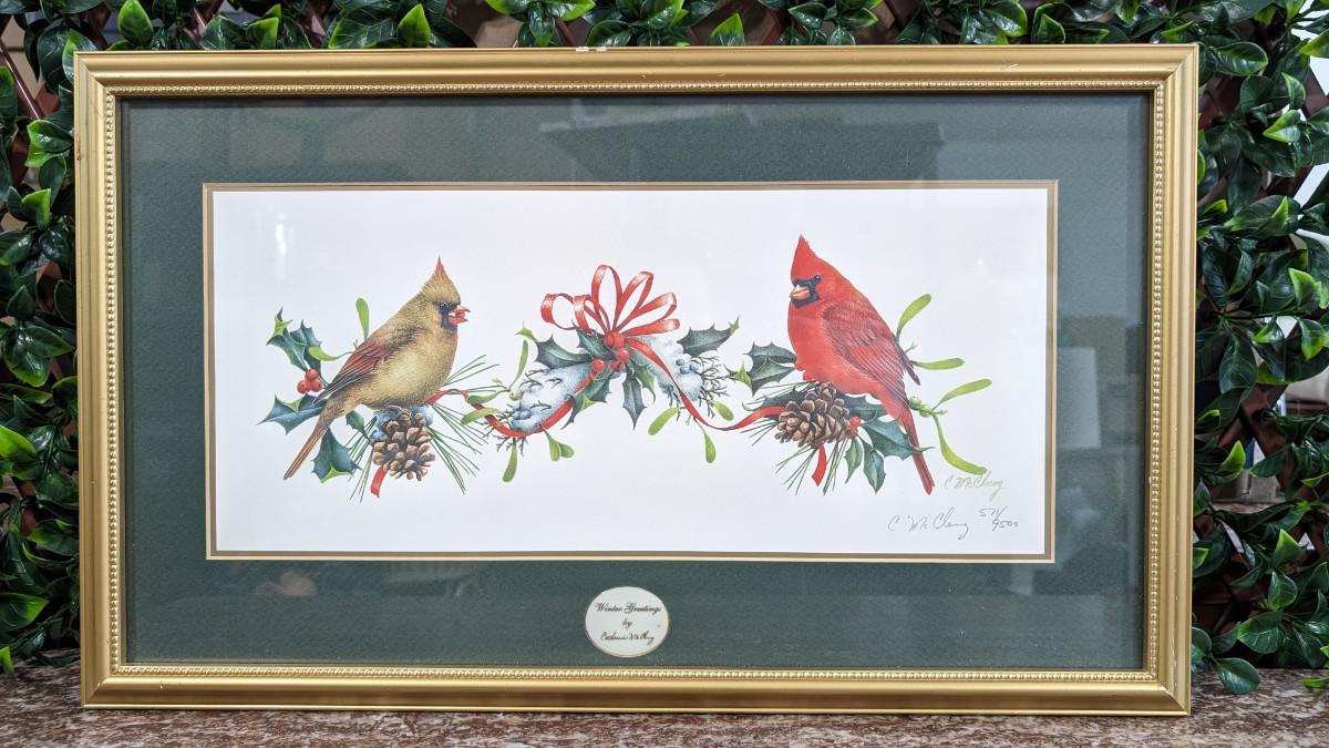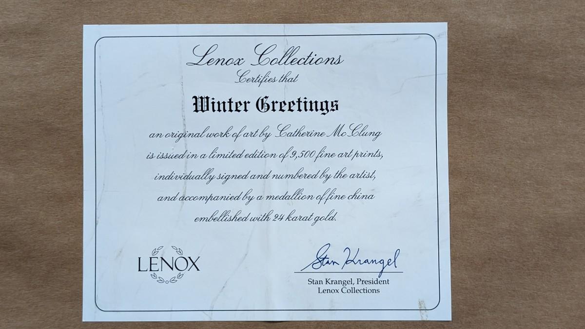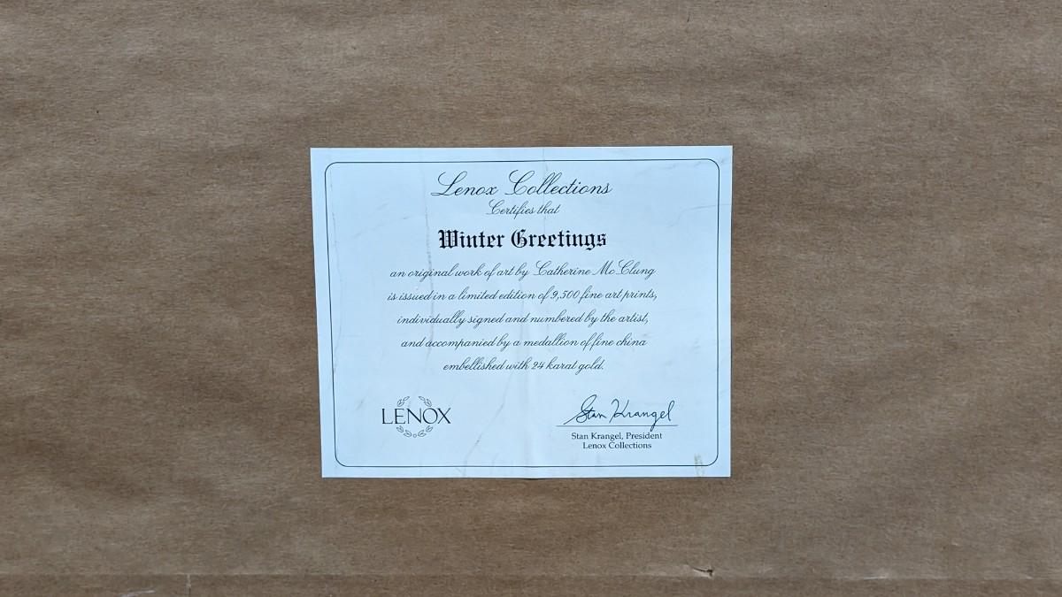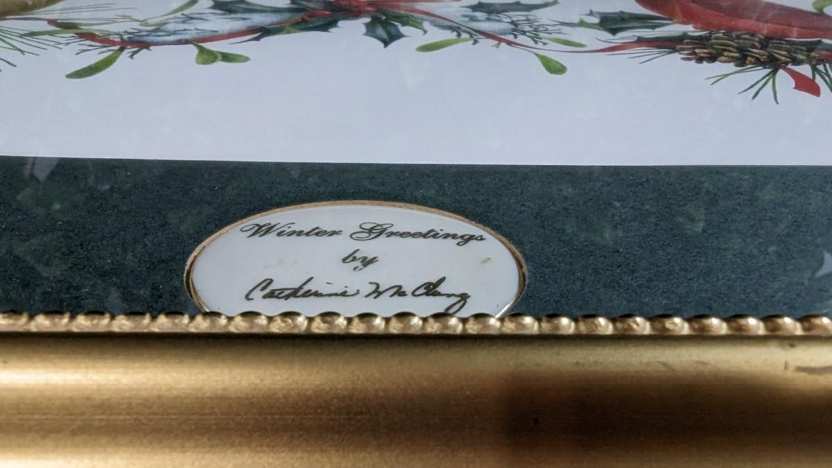 This is a Lenox Winter Greetings Cardinals Holly Red Bow Catherine McClung Signed 571/9500. Some wear and nicks on frame. Some punctures on back paper.